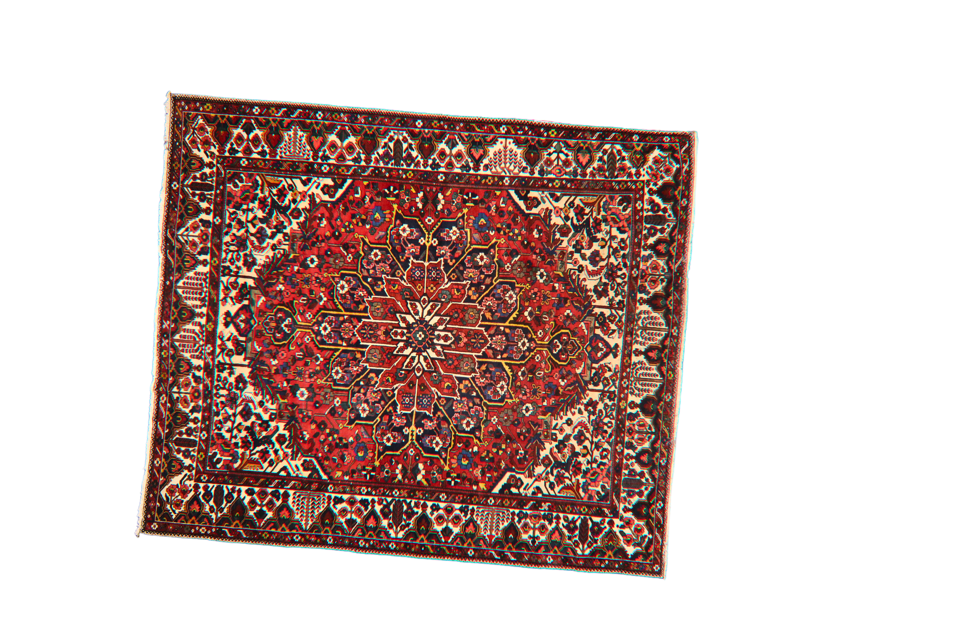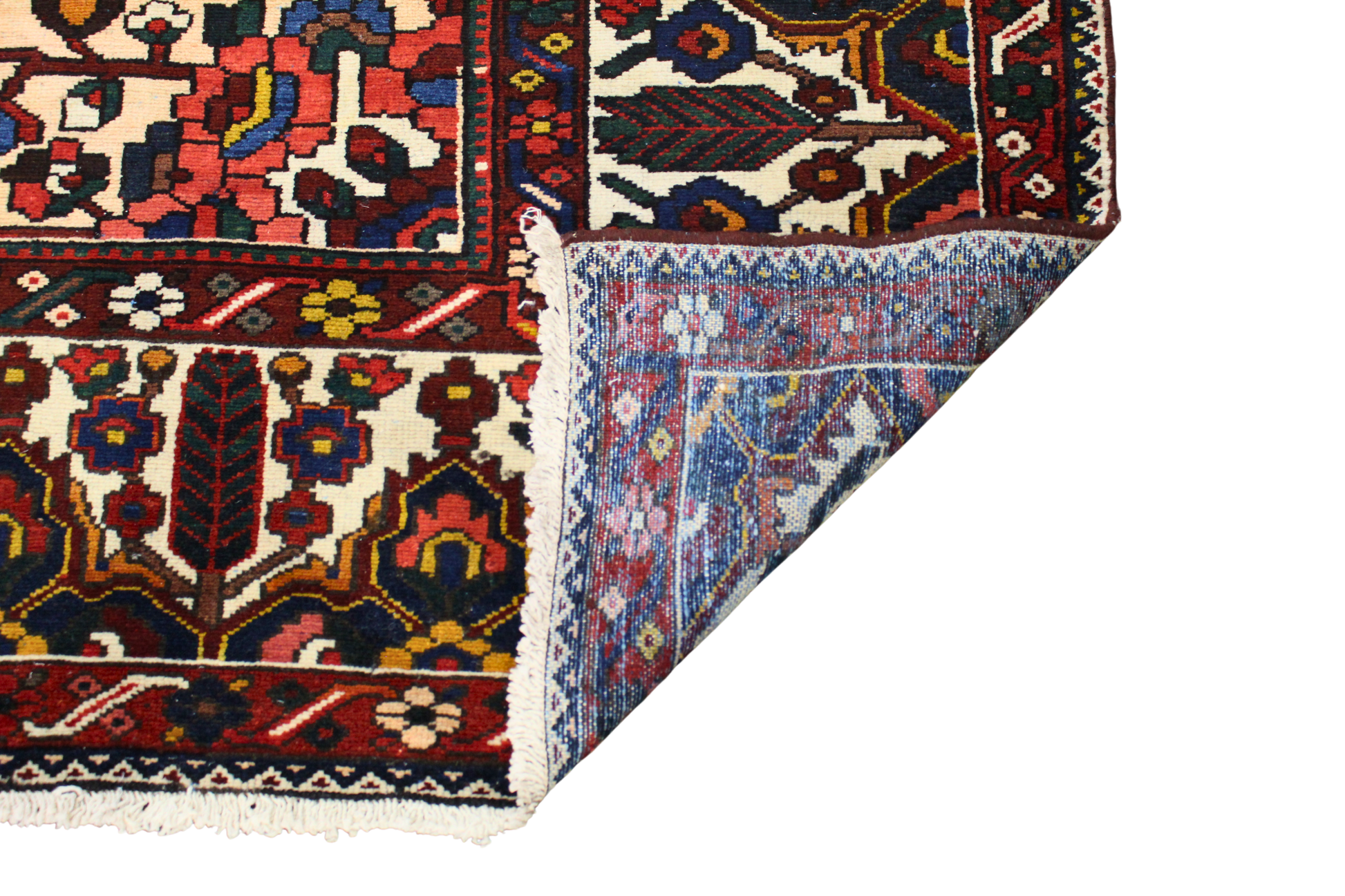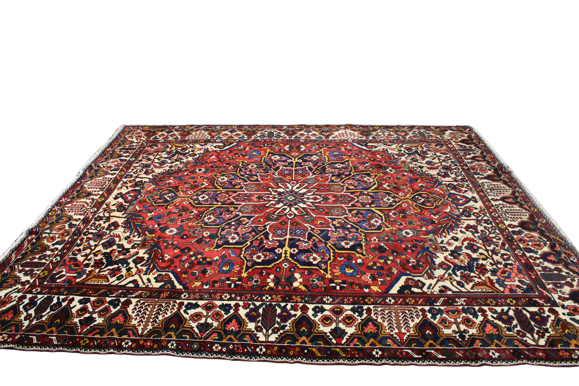 This vivid antique Bakhtiari rug bursts with tribal character and bold geometric elegance. At its center is a radiant medallion design, extending outward in a star-like formation surrounded by richly patterned floral rosettes and angular vinework. The deep brick red field contrasts beautifully with ivory spandrels and midnight blue motifs, creating a vibrant and symmetrical composition.