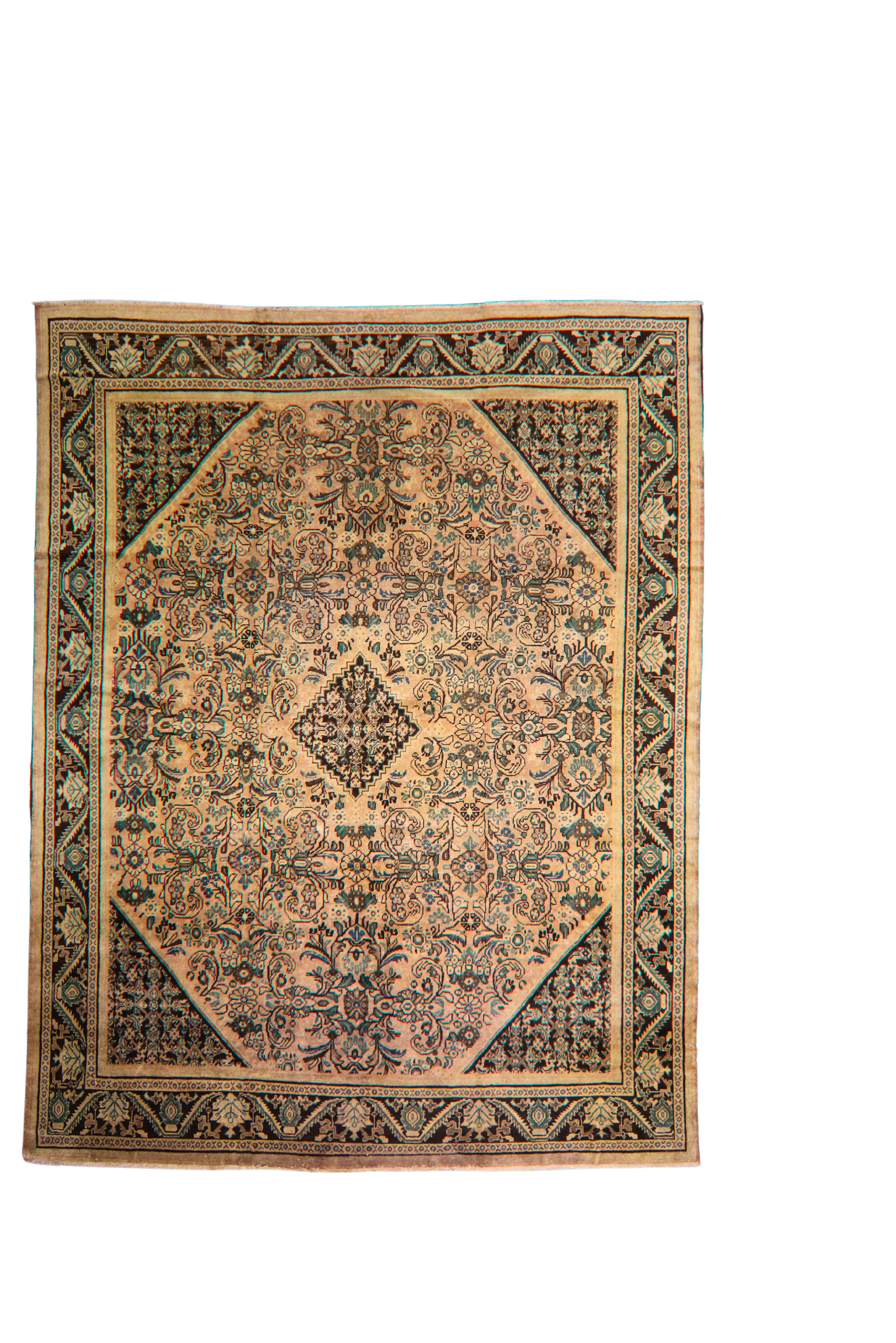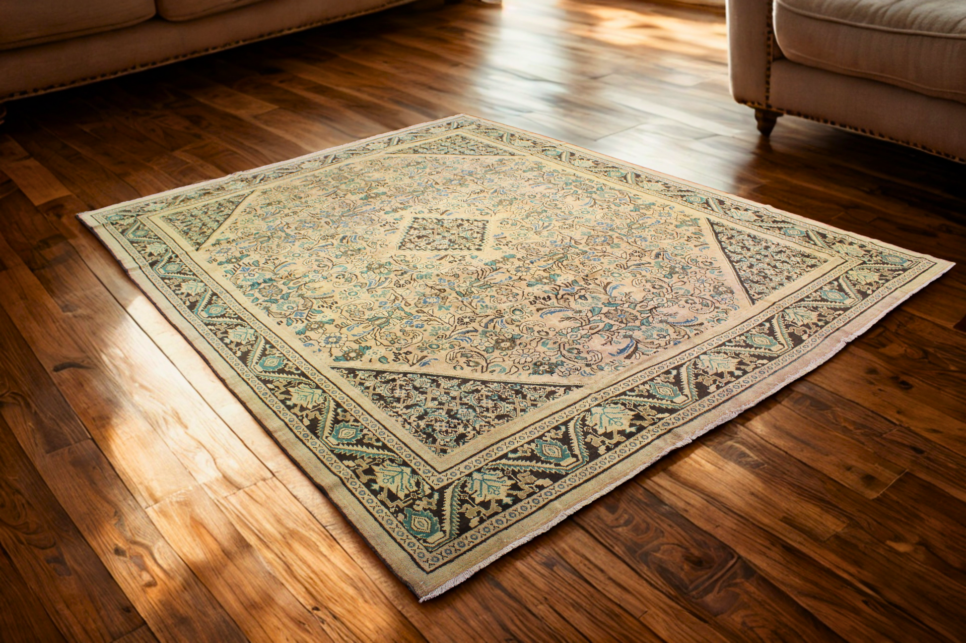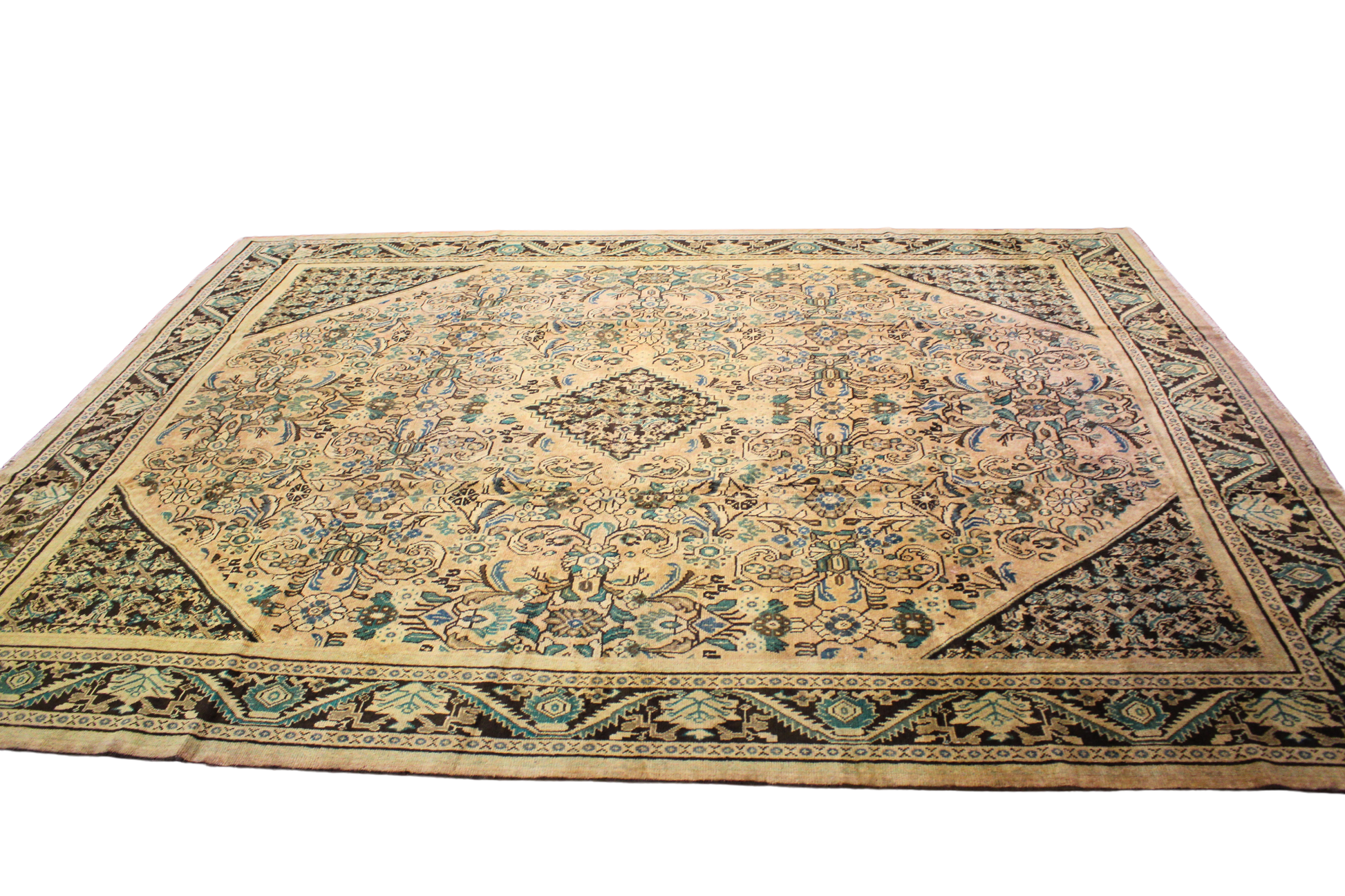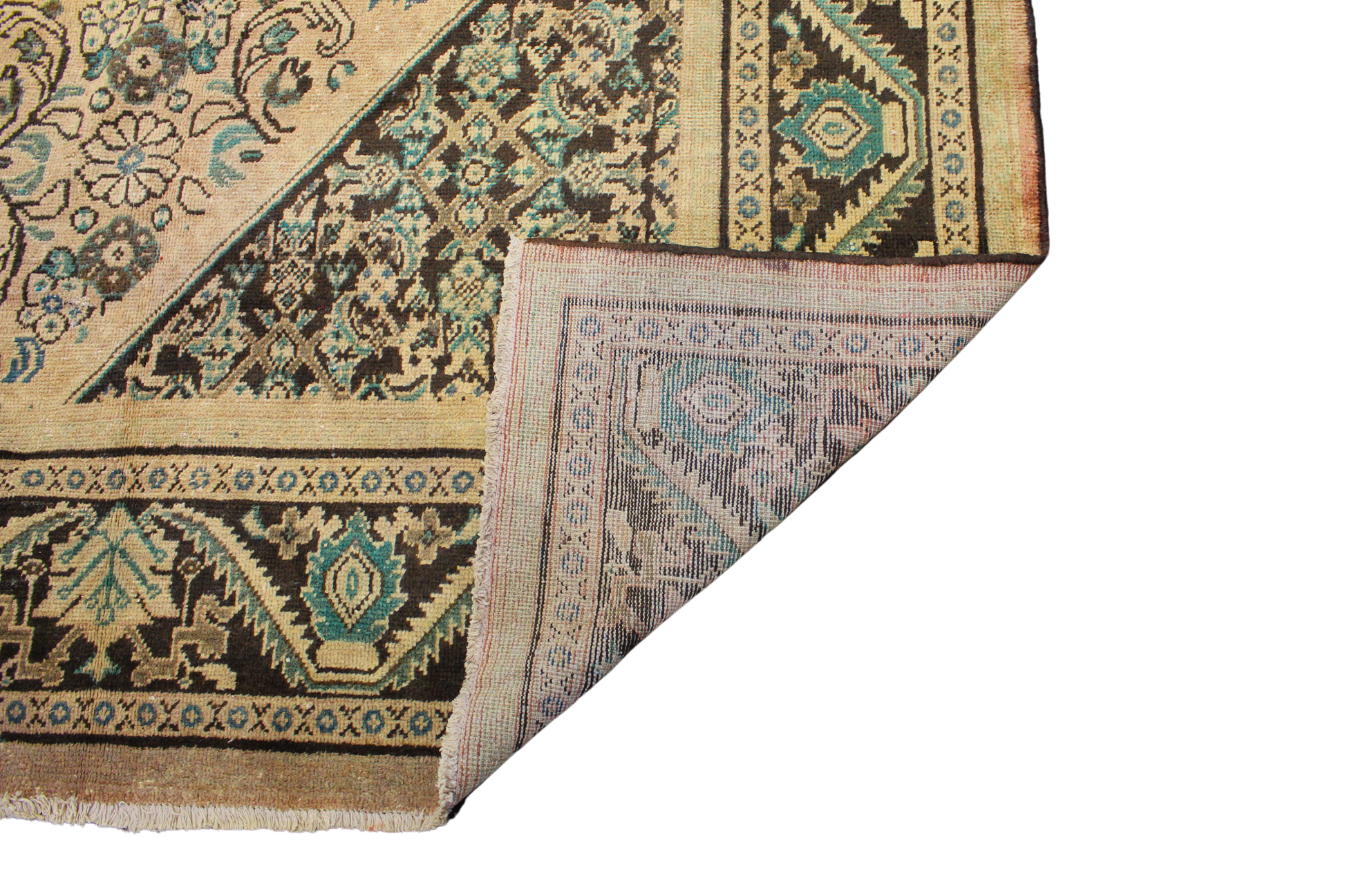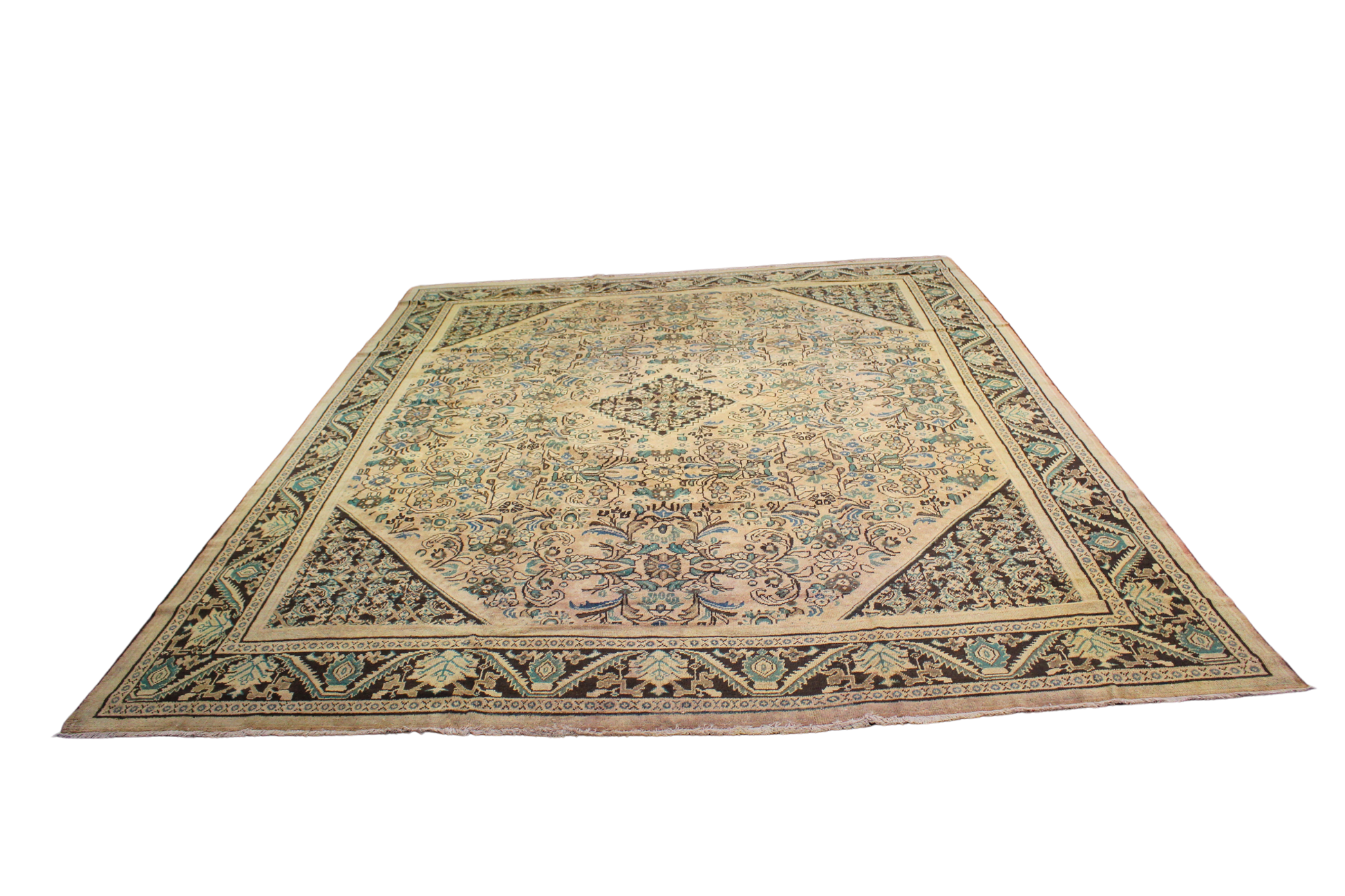 Elegant and delicately balanced, this antique Mahal rug features a refined floral medallion design in an unusually soft and airy color palette. The open sandy ivory field is adorned with intricate scrolling vine work, floral sprays, and stylized medallions in cool sage green, espresso brown, and hints of aqua. The spandrels in each corner echo the density of the central design, providing architectural balance and enhancing the rug’s classic Persian symmetry.
