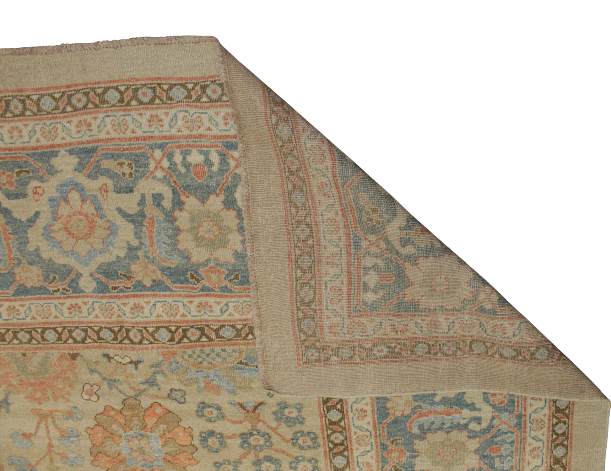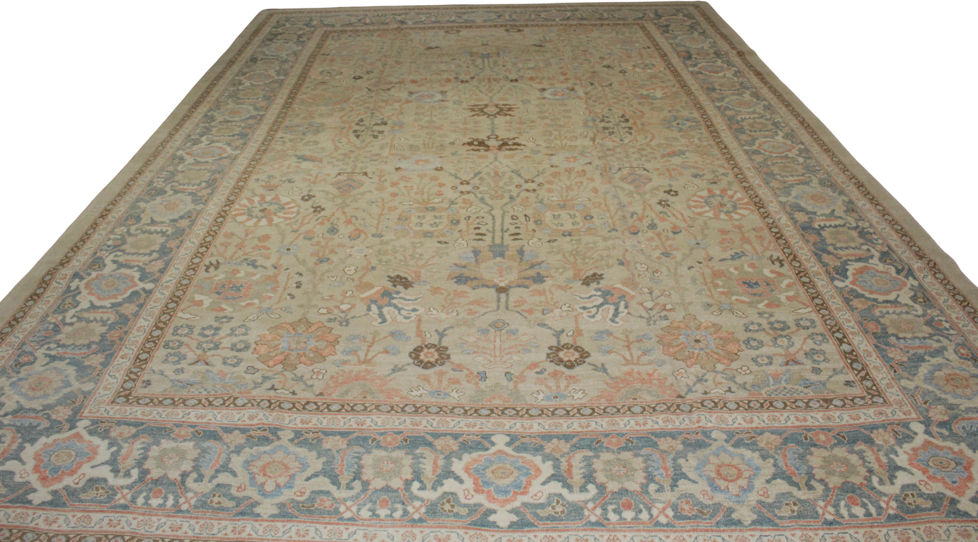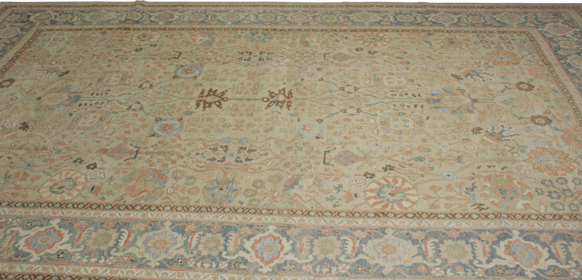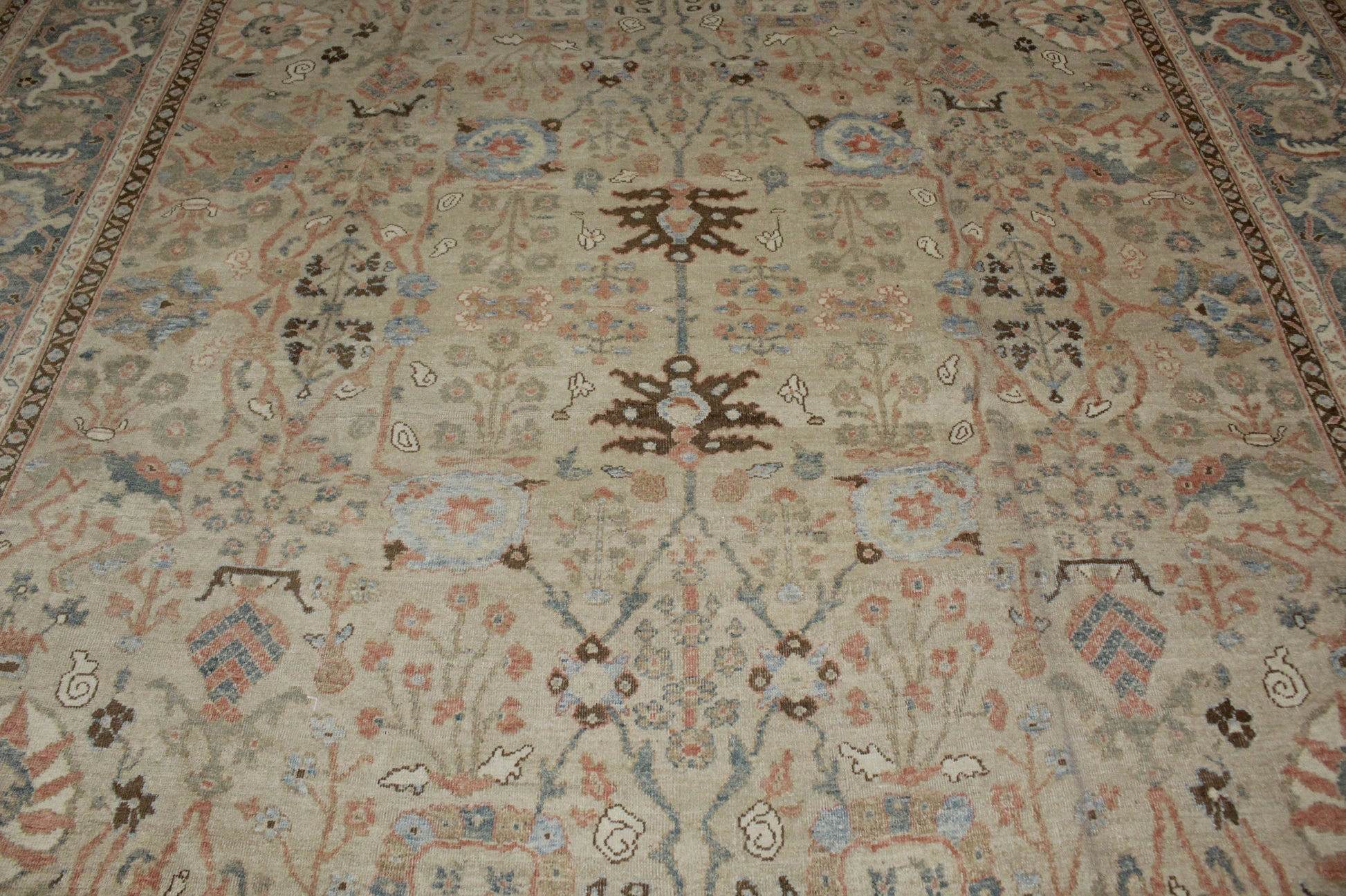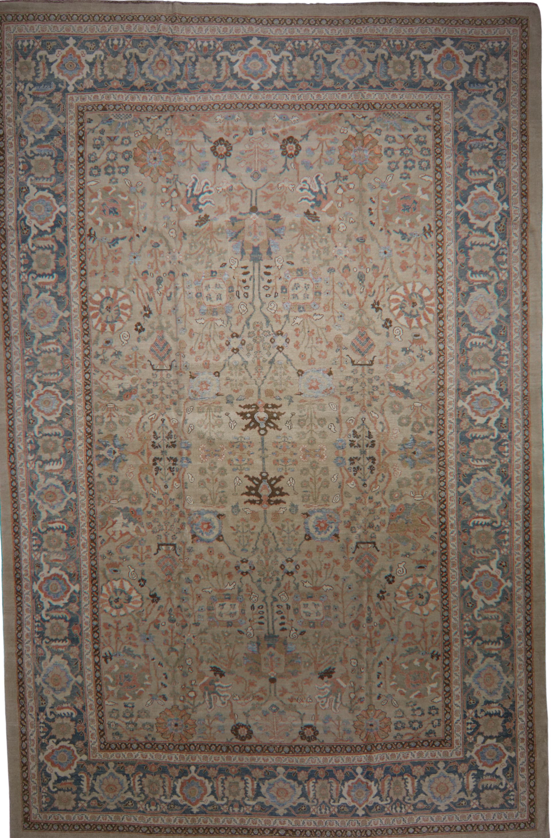 This majestic 12′ × 18′ antique Mahal rug is a rare and timeless piece woven in the heart of Persia. Its spacious layout bursts with intricate detail: a rich floral latticework surrounded by a bold, wide border featuring stylized rosettes, palmettes, and curling vines in soothing tones of soft coral, dusty blue, ivory, and warm camel.