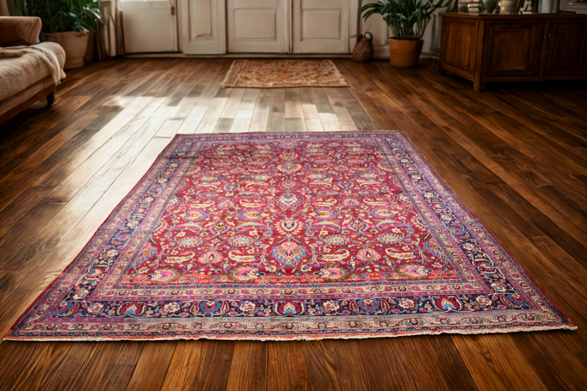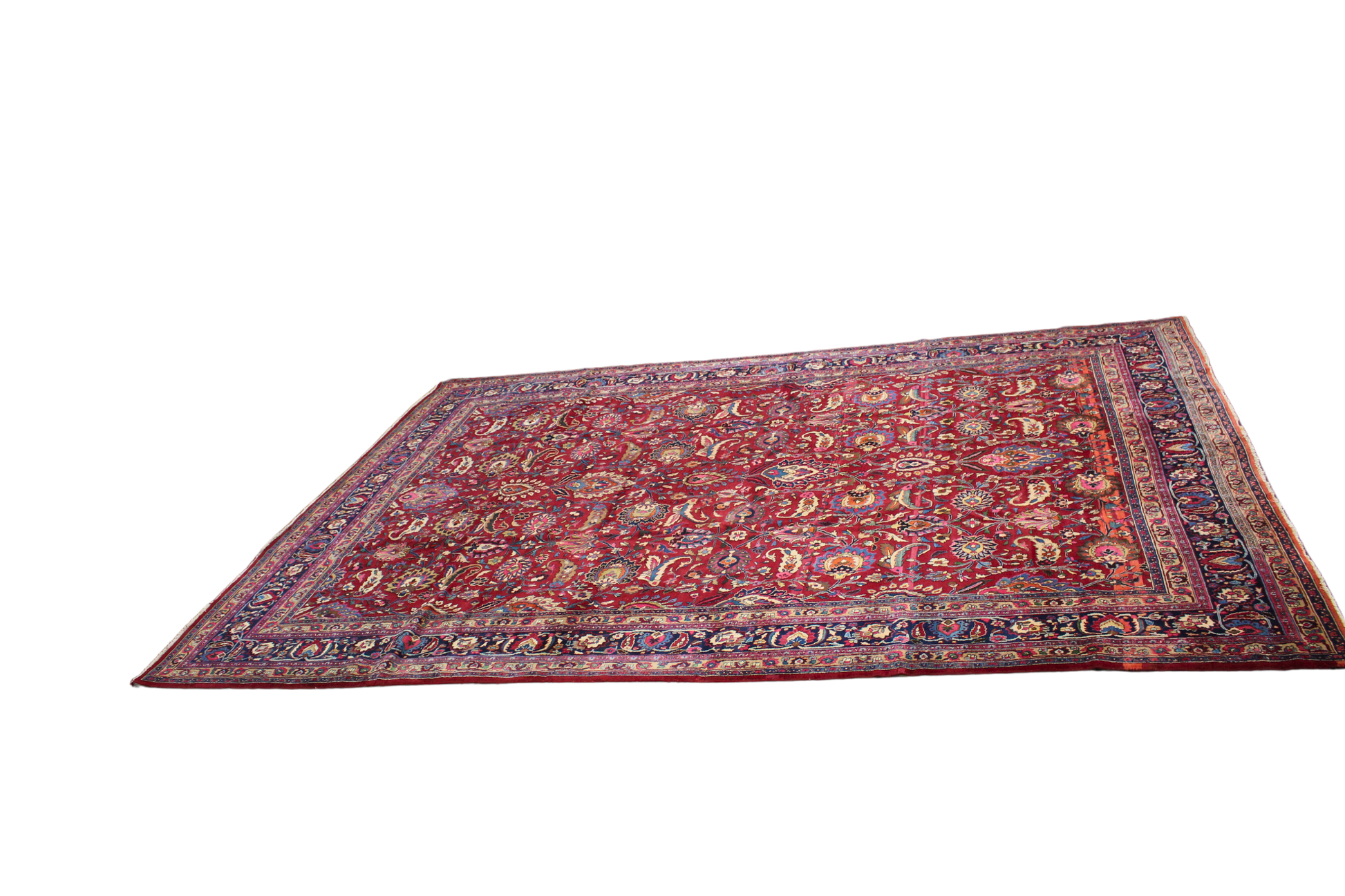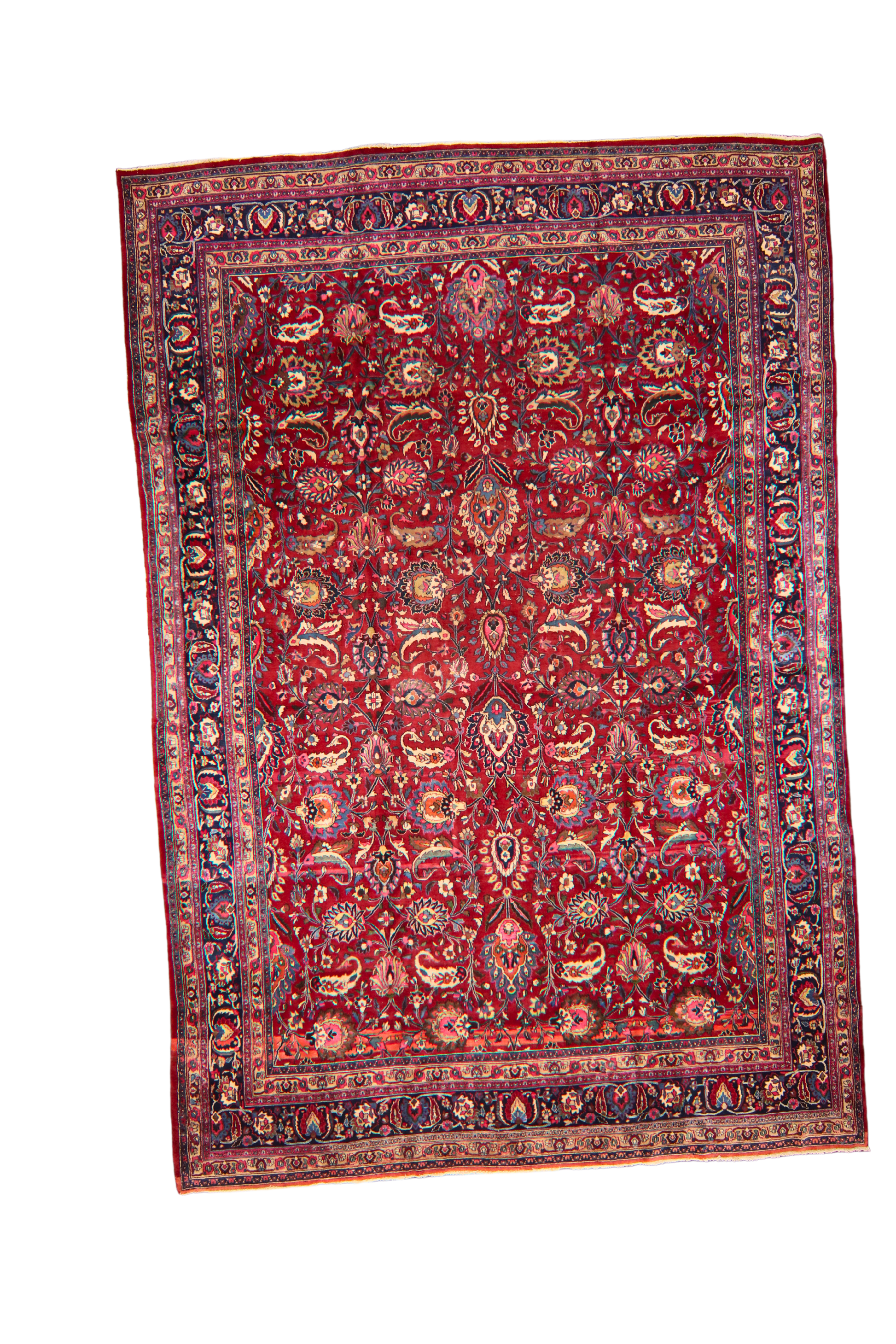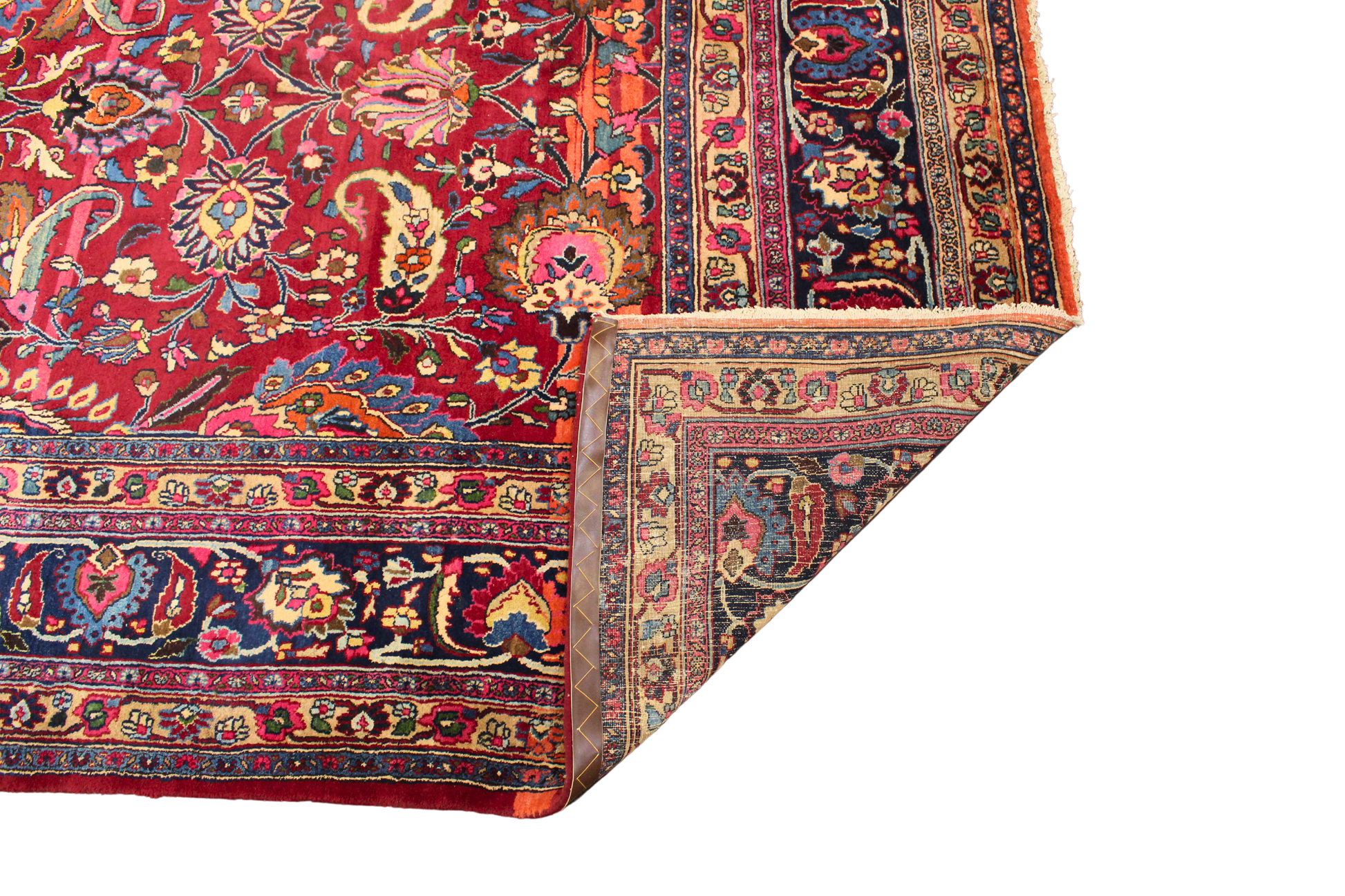 Lush, vibrant, and finely detailed, this antique Mashad rug features an elaborate allover design rich with traditional Persian motifs. The deep crimson red field is populated by a rhythmic layout of palmettes, swirling botehs, stylized blossoms, and teardrop-shaped floral medallions, creating a flowing tapestry of movement and form. Each motif is intricately outlined in navy, ivory, teal, and gold, giving the composition stunning depth and dimension.