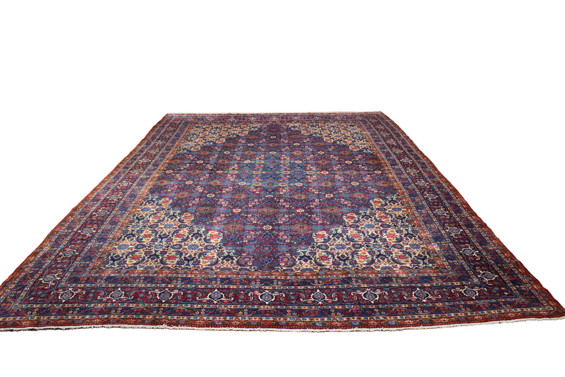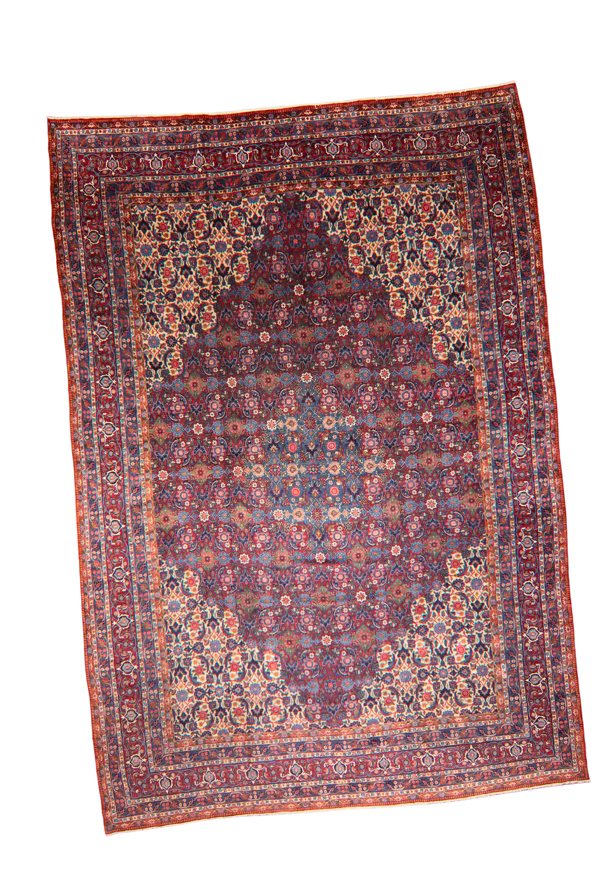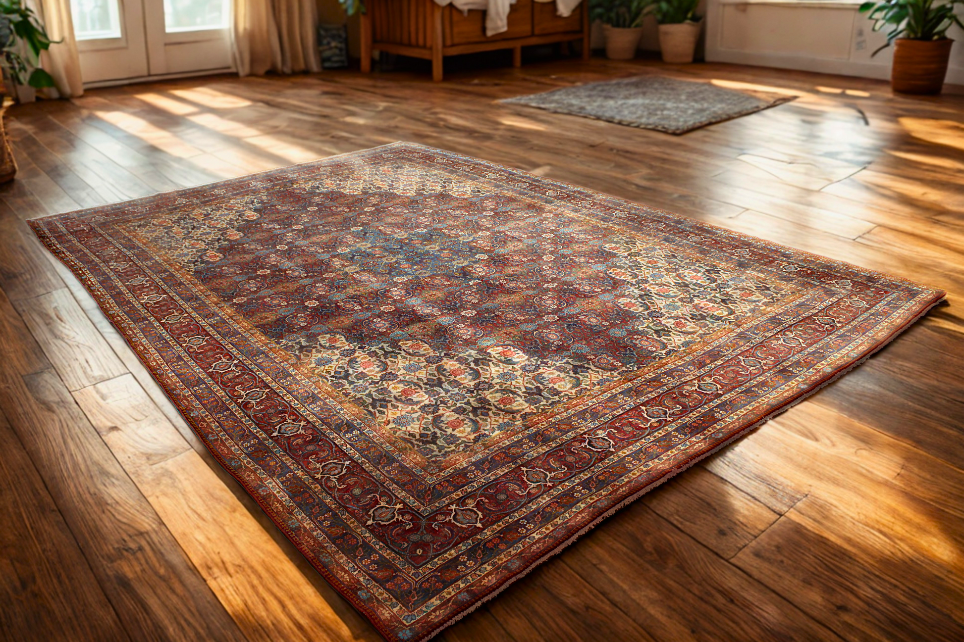 Framed by multiple borders of stylized floral vines and guard bands in soft reds and indigos, this piece feels both stately and intimate. Its expansive scale and refined design make it ideal for formal settings such as a grand salon, gallery space, or luxury estate.