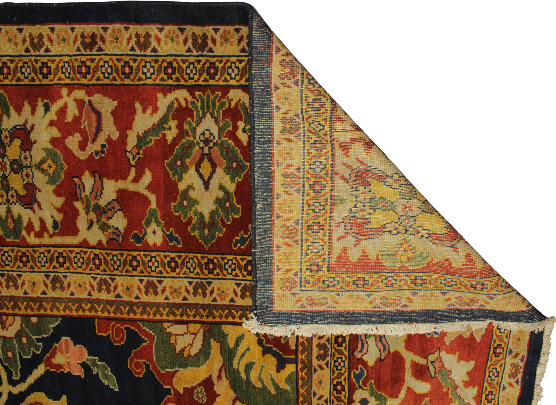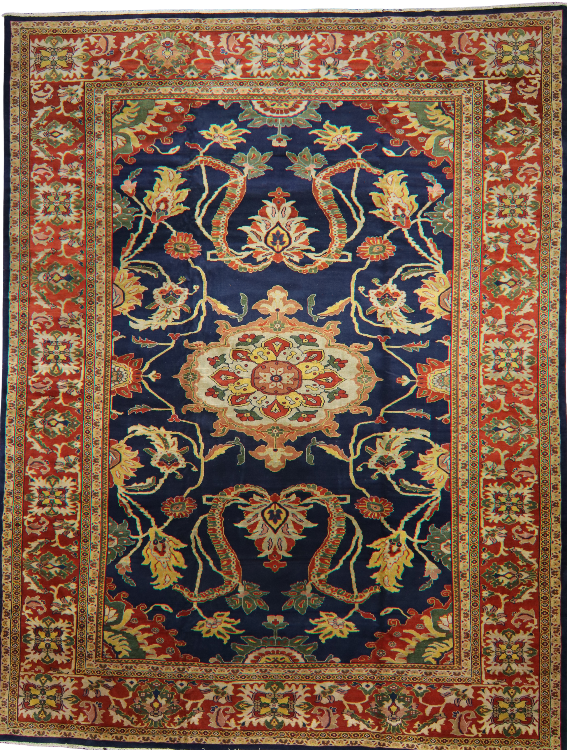 With its rich sapphire-blue field and fiery red border, this grand 13 × 17 ft Persian Mahal rug commands attention like a royal garden at the height of bloom. The lavish floral medallion radiates outward with symmetry and opulence, flanked by intricate vine scrolls, palmettes, and bold botanical motifs in vivid tones of gold, olive, coral, and ivory.