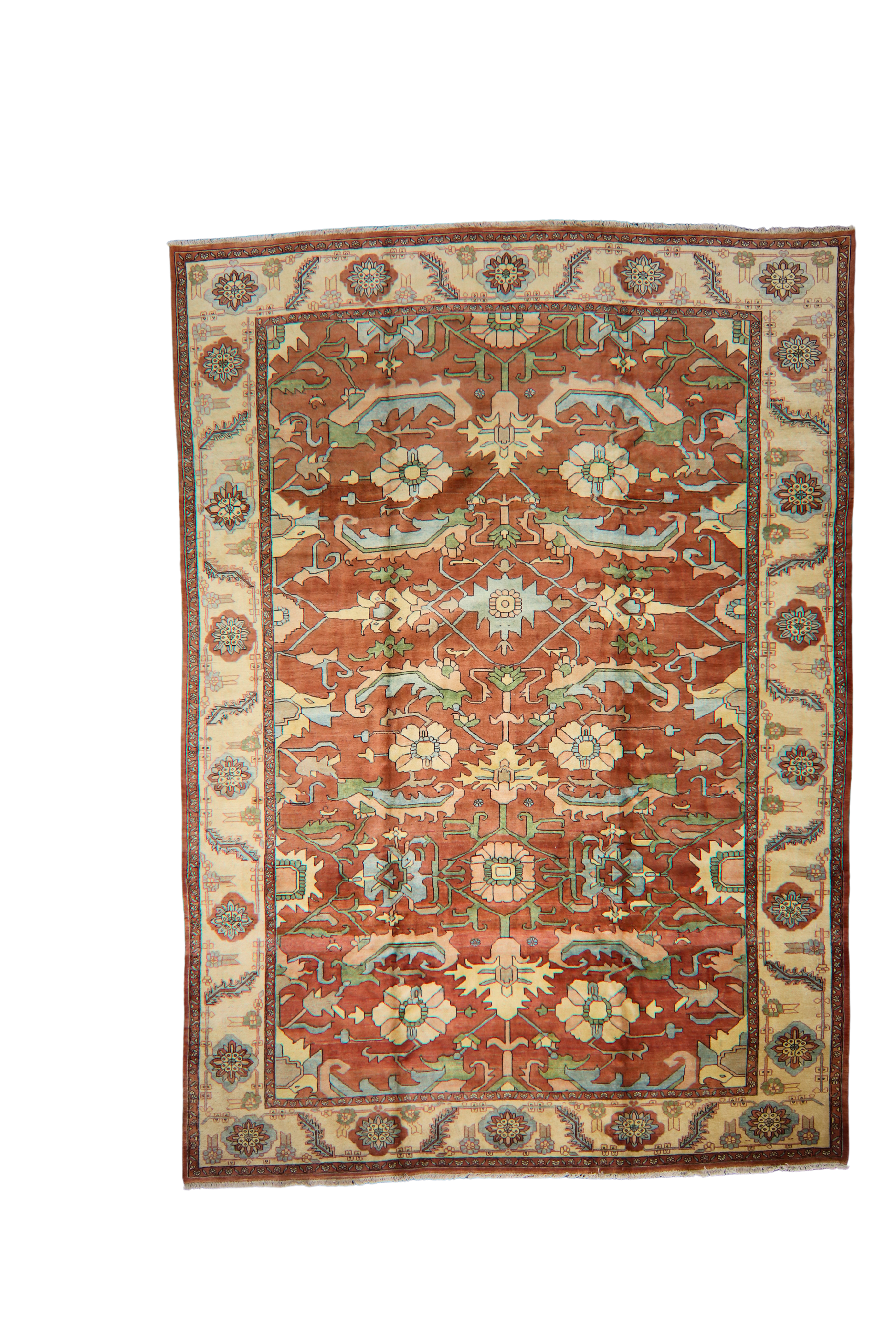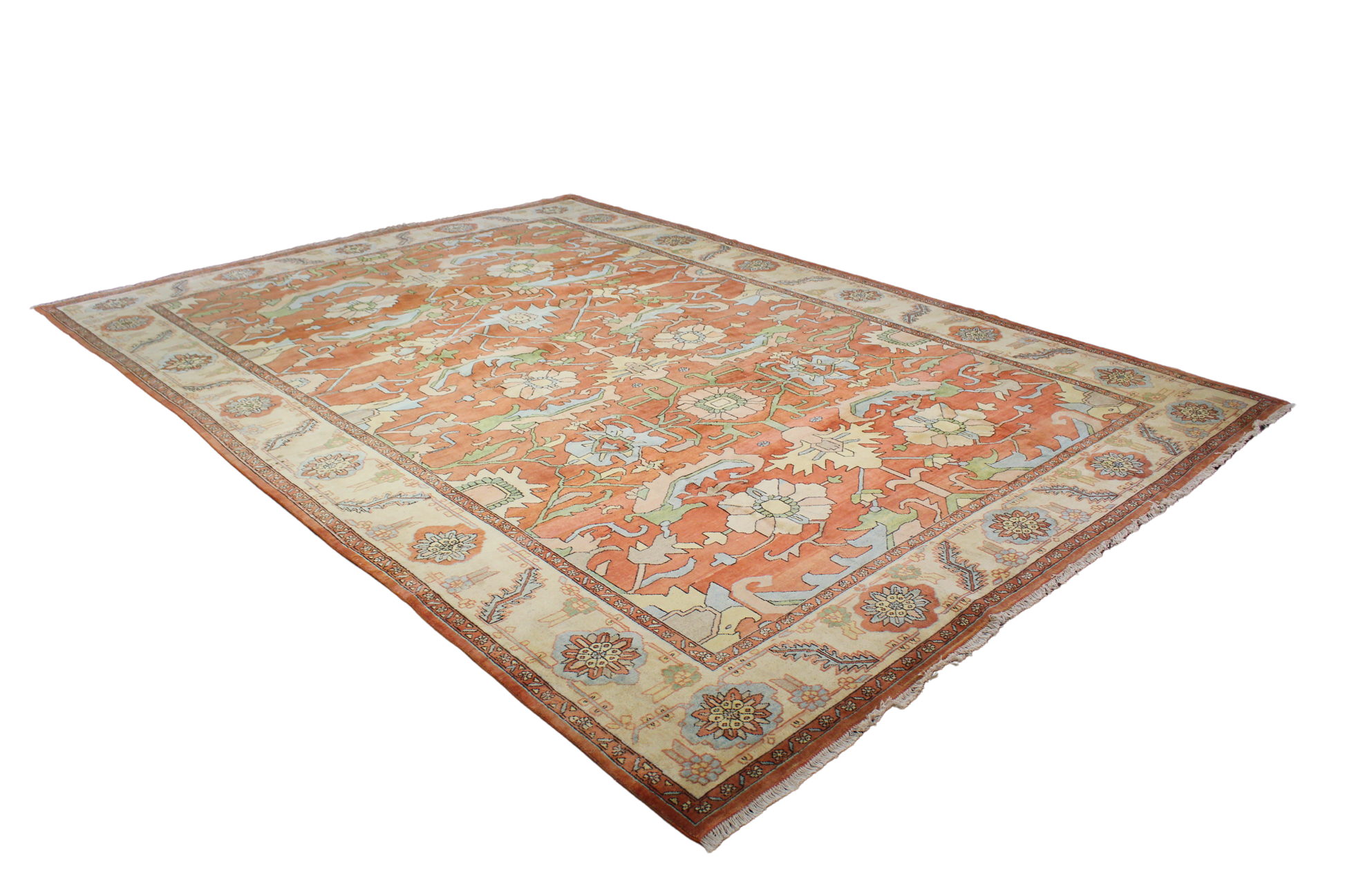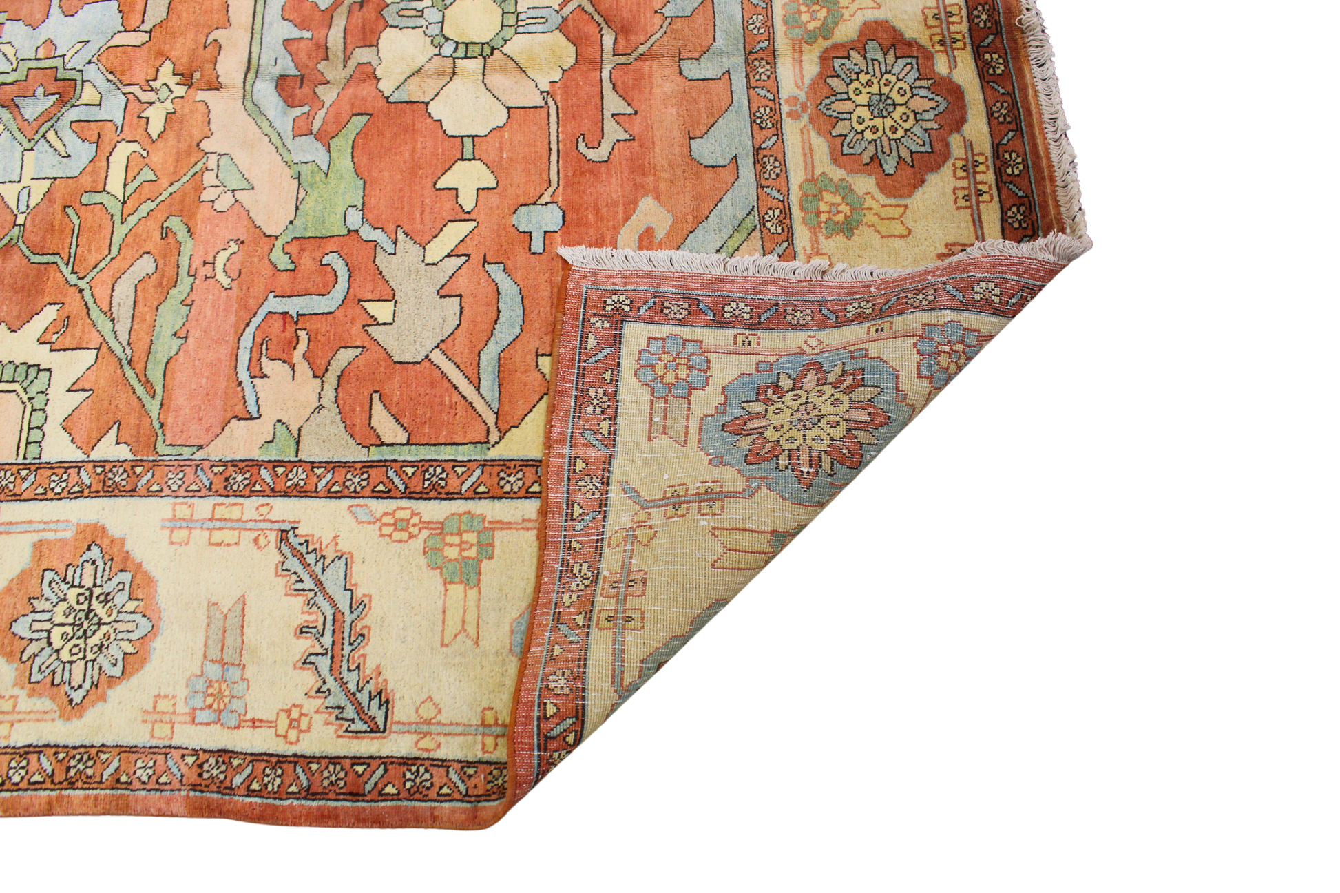 The creamy ivory border is decorated with playful rosettes and vines, offering a bright frame that lightens and complements the rug’s earthy core. With its large scale and airy design, this Heriz is perfect for a transitional living room, library, or wide open space where classic craftsmanship and relaxed sophistication meet.