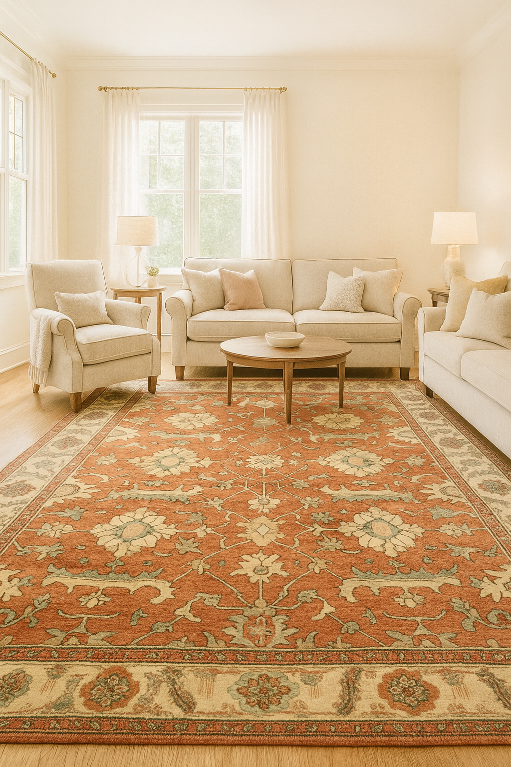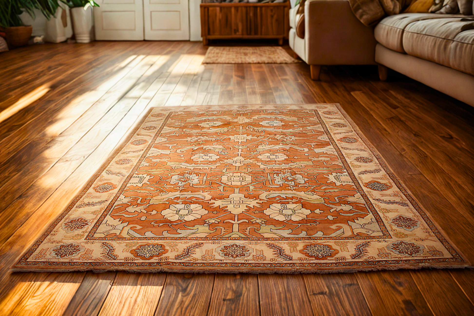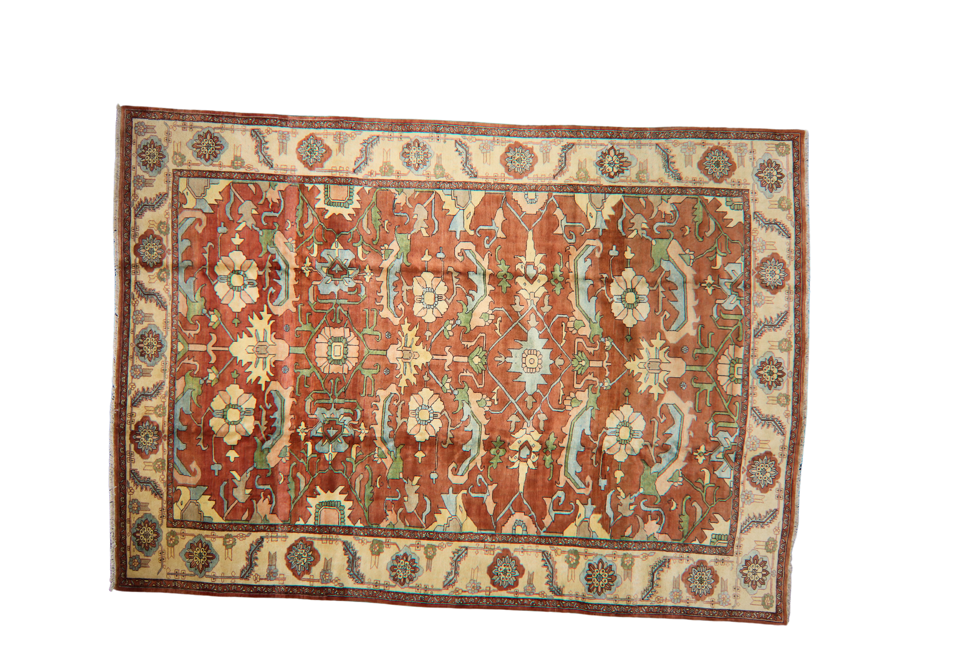 The creamy ivory border is decorated with playful rosettes and vines, offering a bright frame that lightens and complements the rug’s earthy core. With its large scale and airy design, this Heriz is perfect for a transitional living room, library, or wide open space where classic craftsmanship and relaxed sophistication meet.