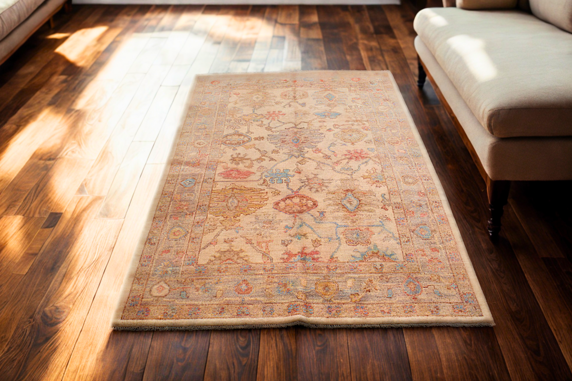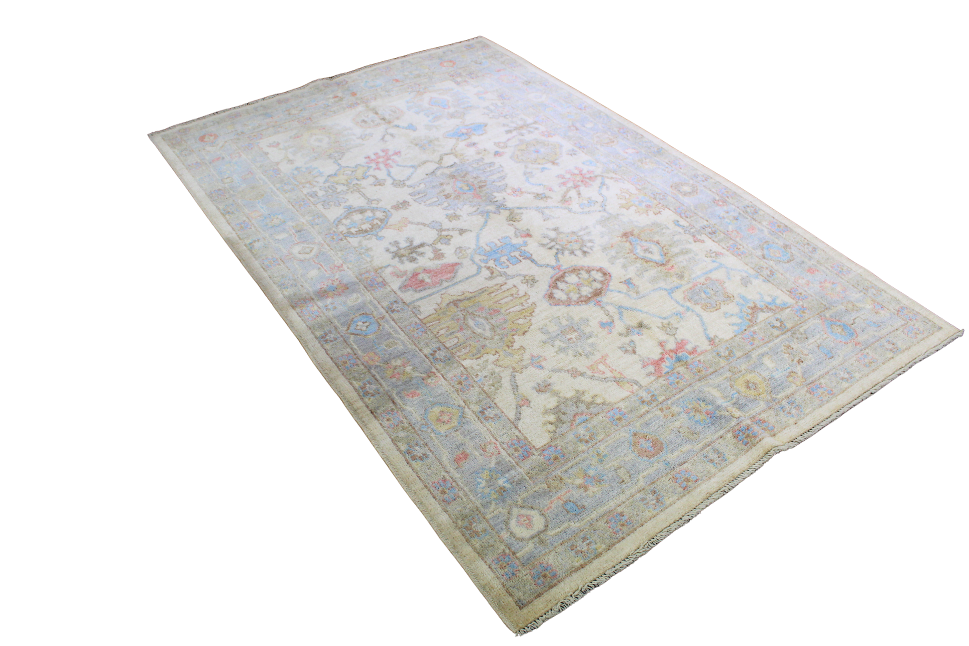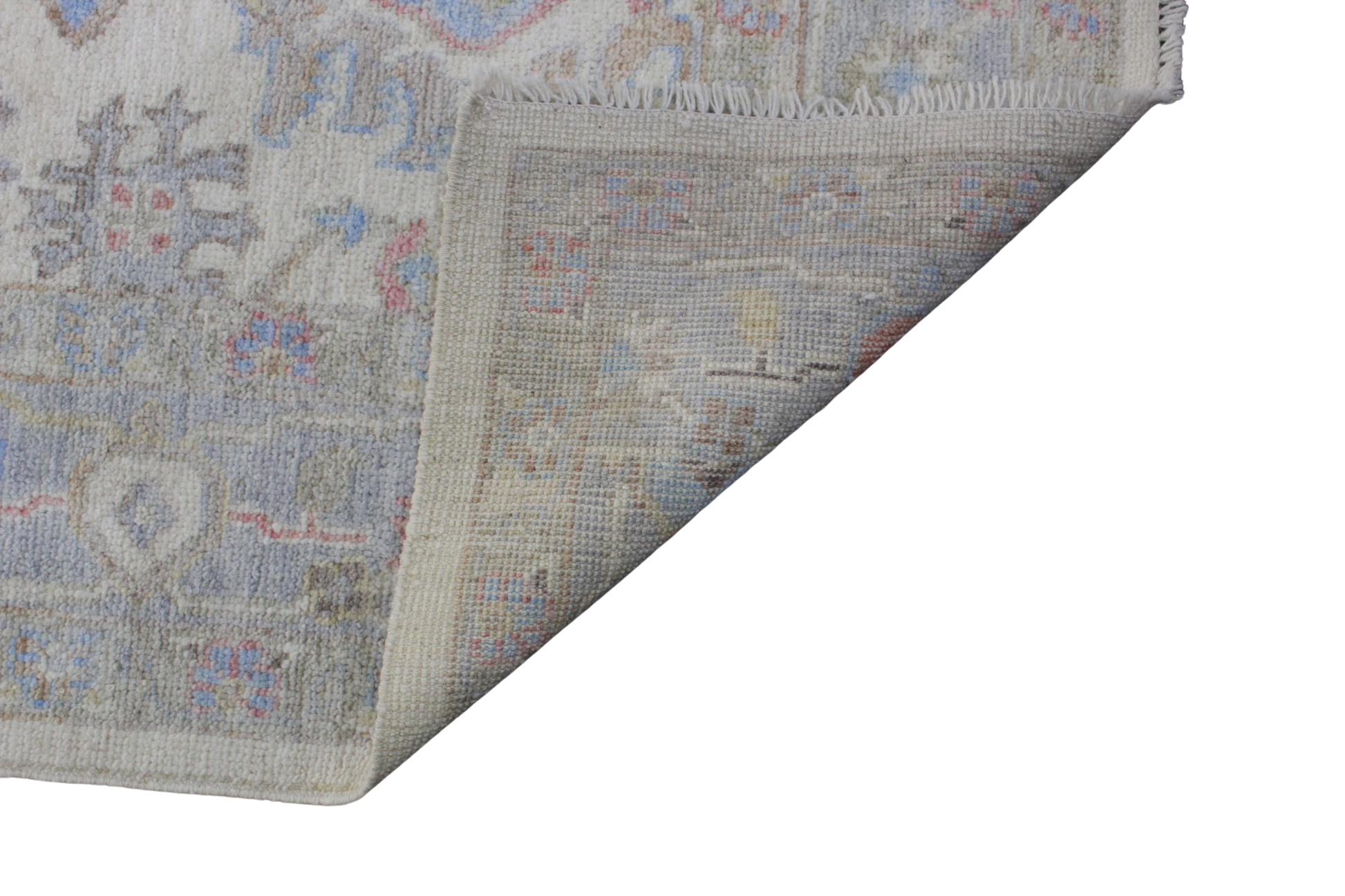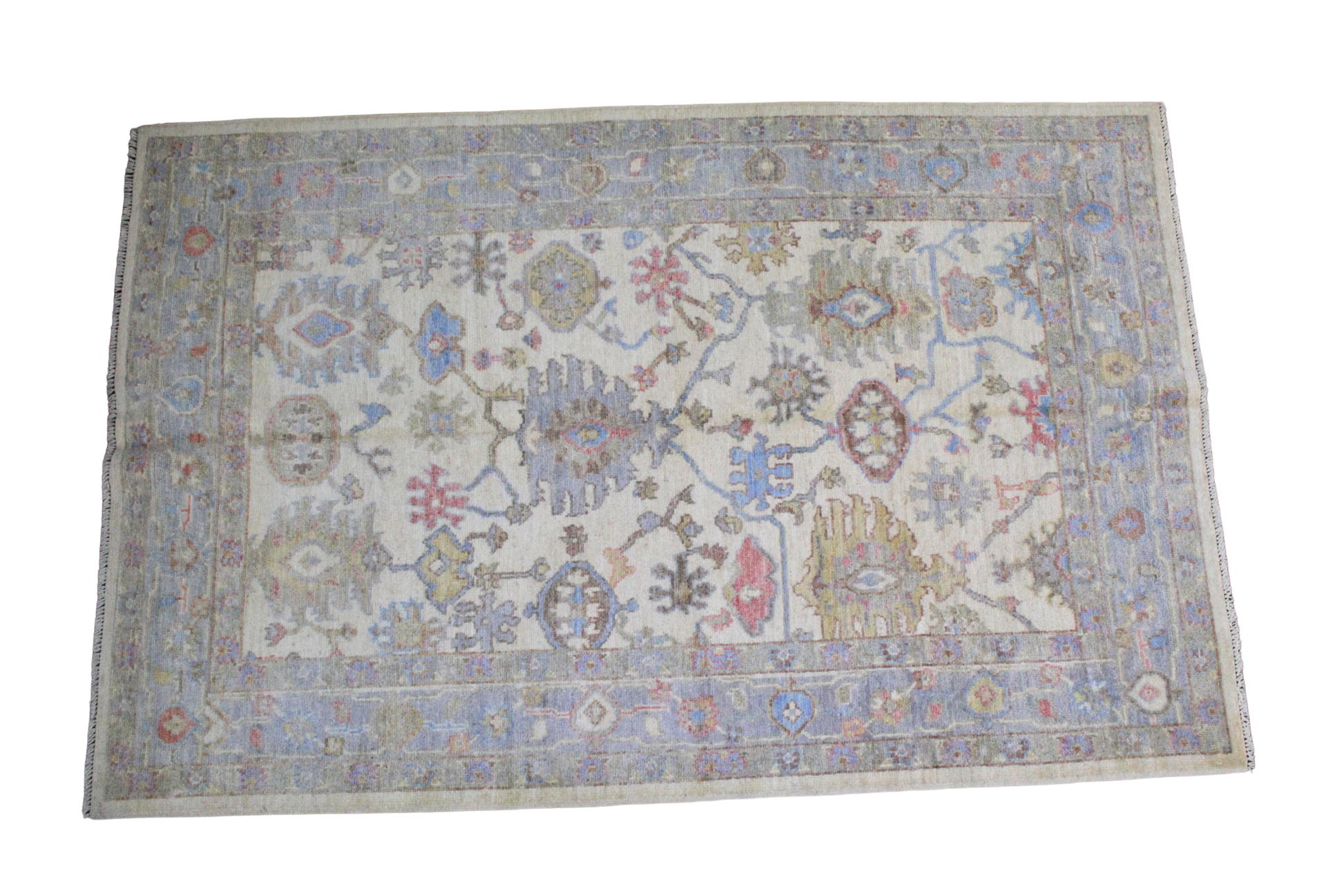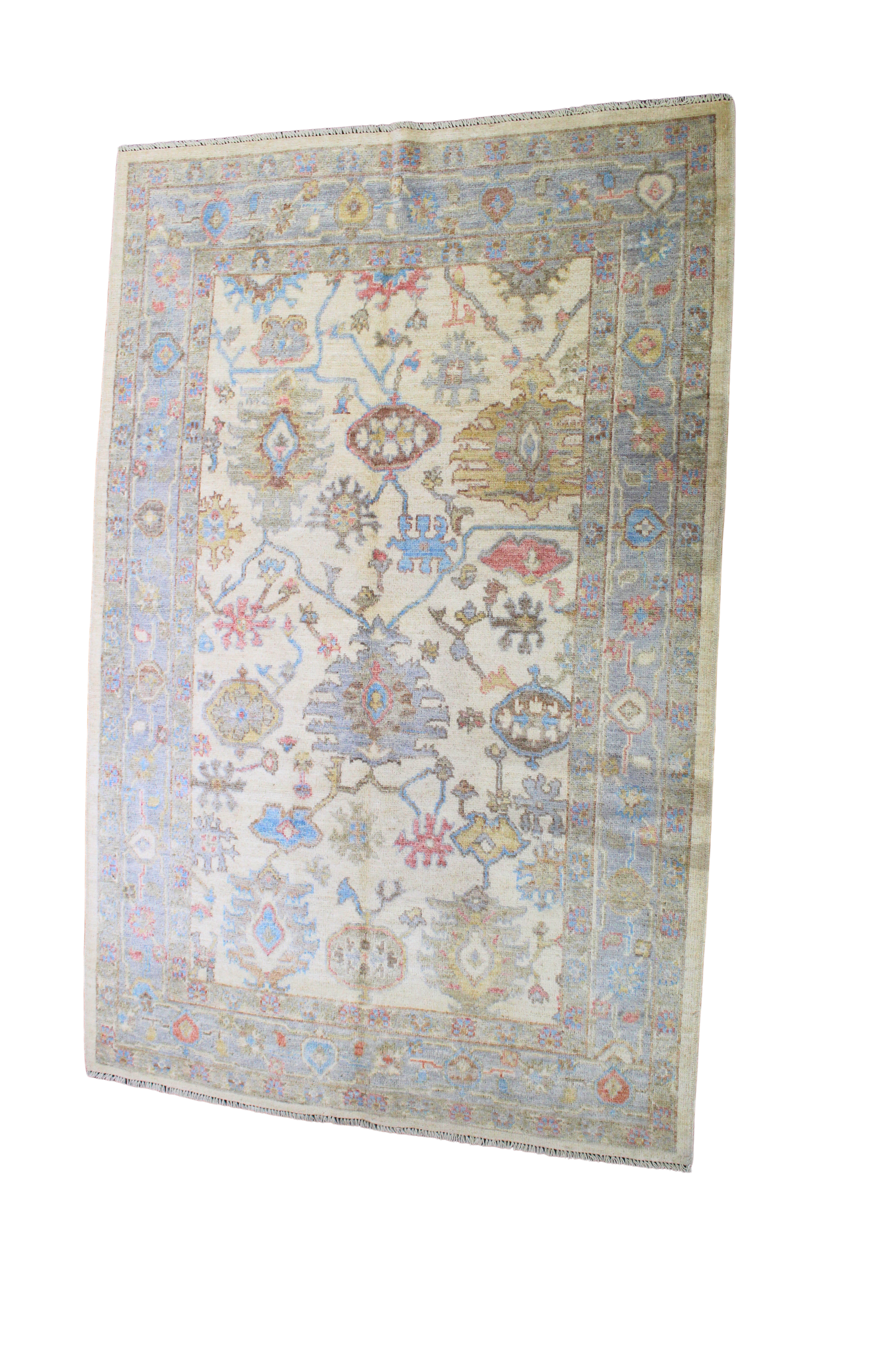 Delicately faded yet richly detailed, this mid-size Afghan Oushak rug evokes the timeless charm of Anatolian tradition with a contemporary lightness. Its ivory field is adorned with soft, asymmetrical botanical motifs and geometric palmettes in powder blue, sage, dusty rose, and hints of muted gold. The wide border, rendered in a cloud-washed blue, frames the rug with a graceful rhythm, enhancing its serene and airy character.