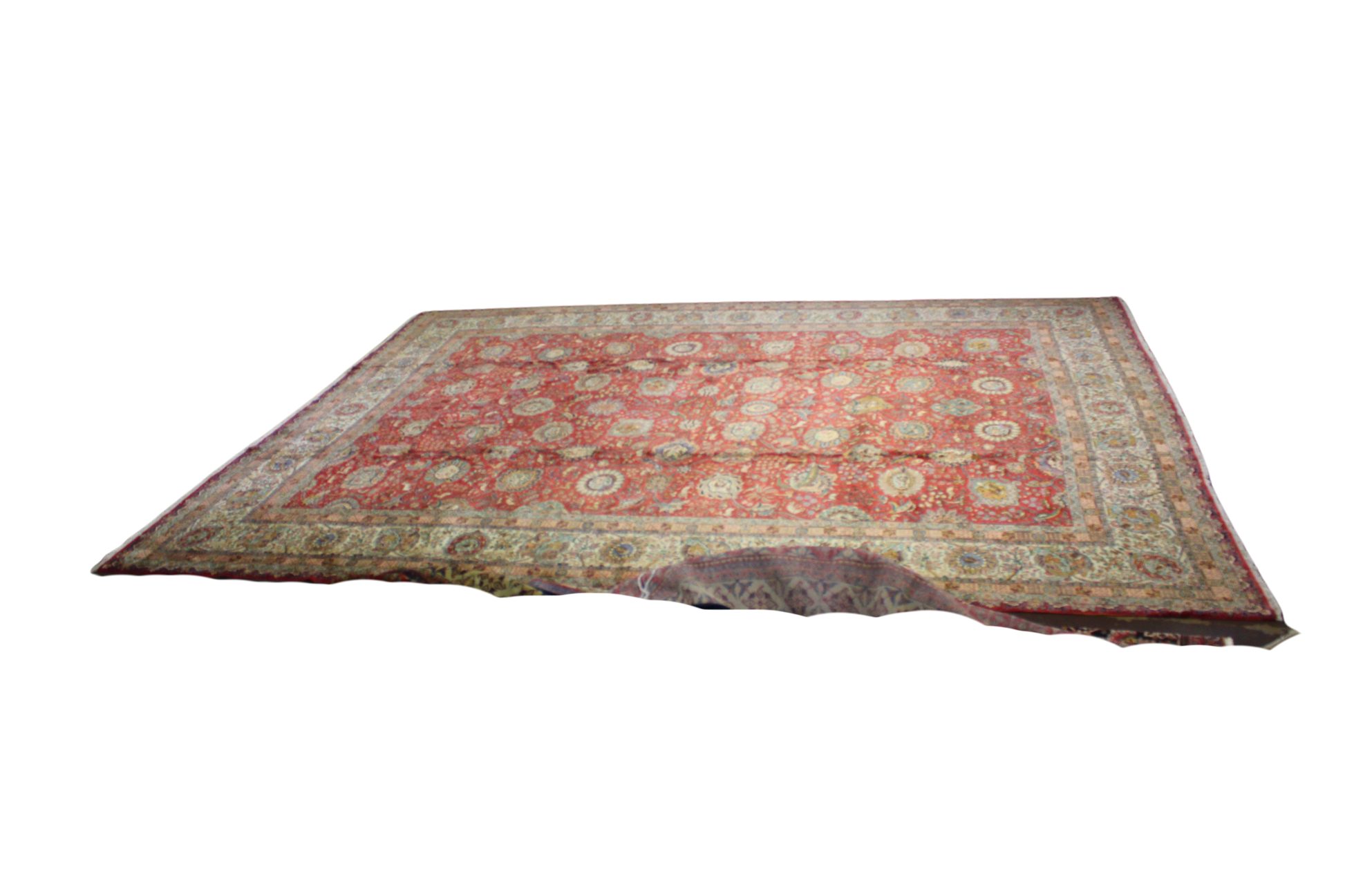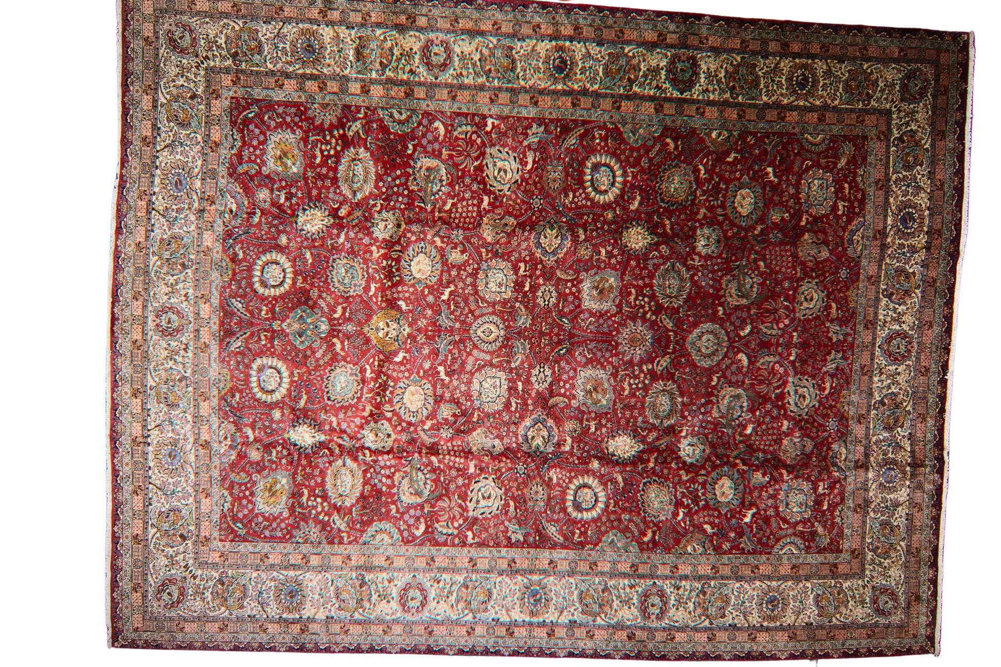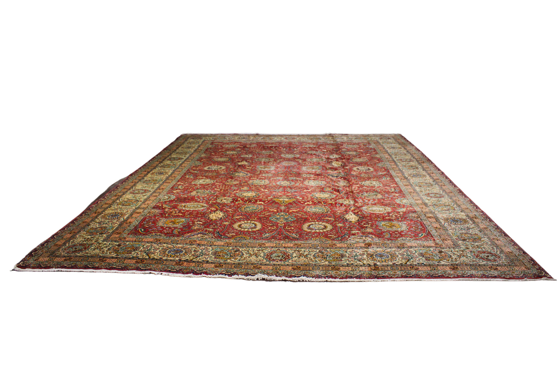 An extraordinary work of scale and intricacy, this monumental antique Tabriz rug is a masterpiece of Persian court weaving. Its ruby red field is a tapestry of finely drawn floral rosettes, swirling vines, and palmettes—meticulously knotted with a level of detail characteristic of Tabriz workshops. The pale ivory border, richly decorated with flowering tendrils and cloudband motifs, adds contrast and refinement, creating a regal frame around the field.