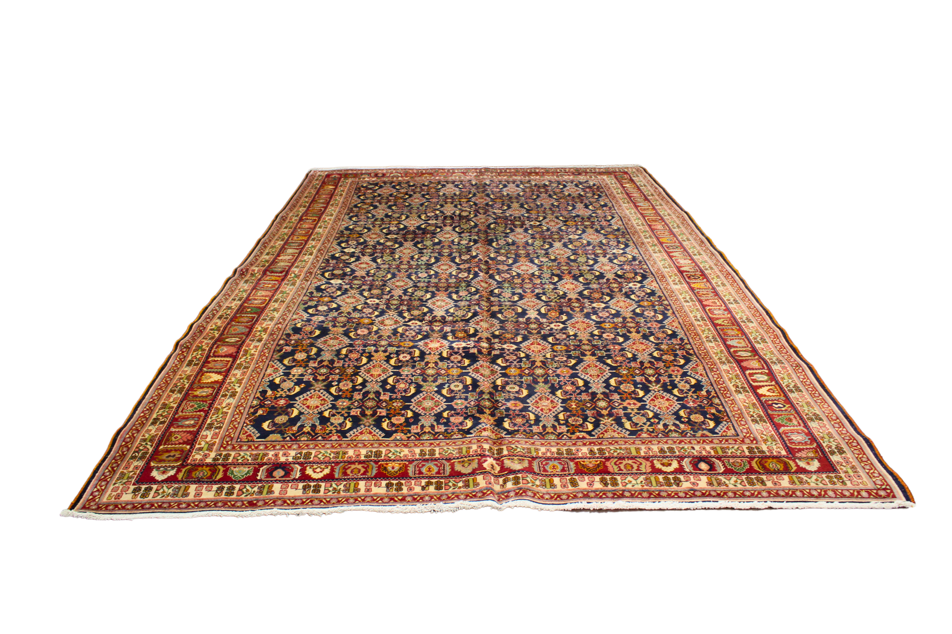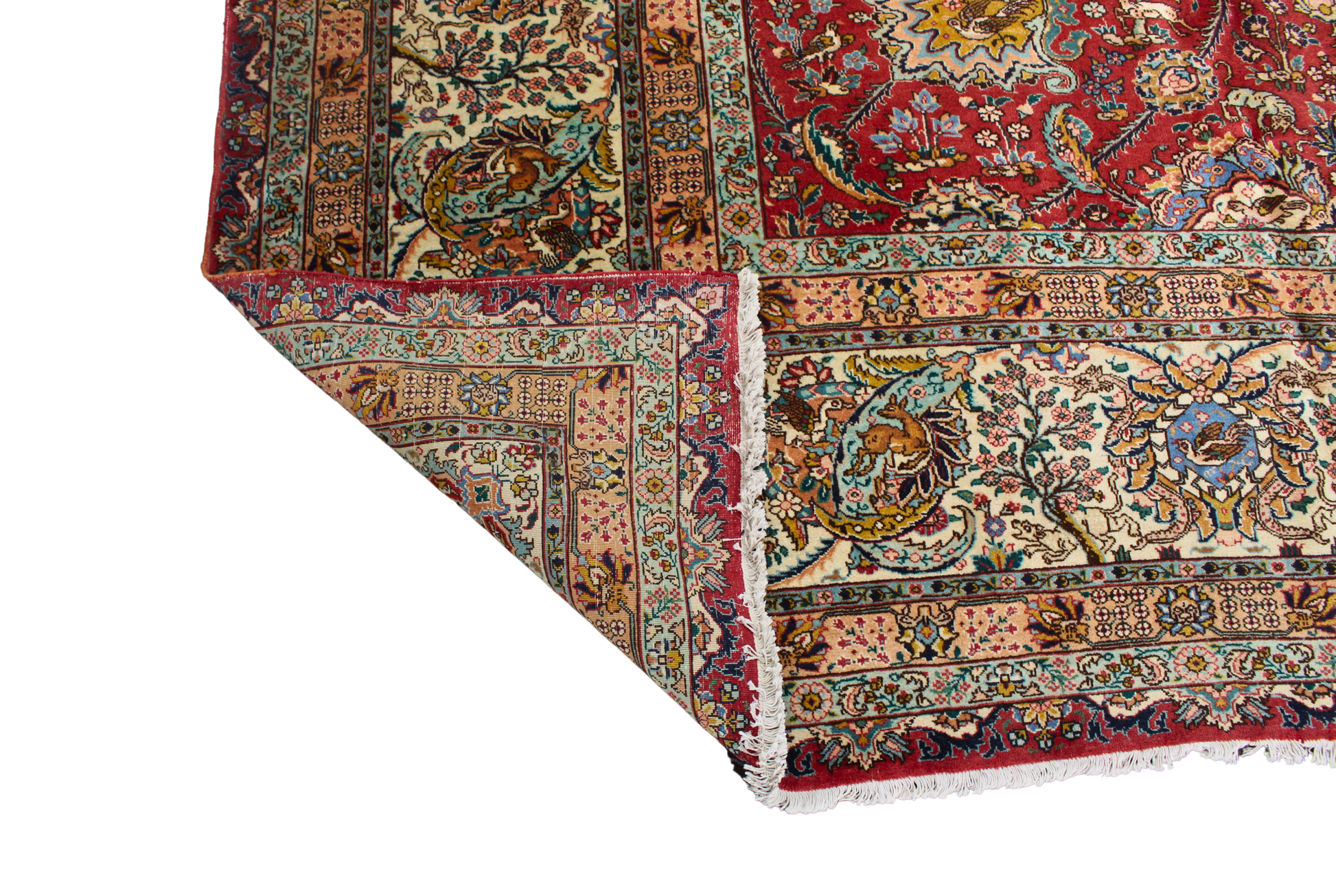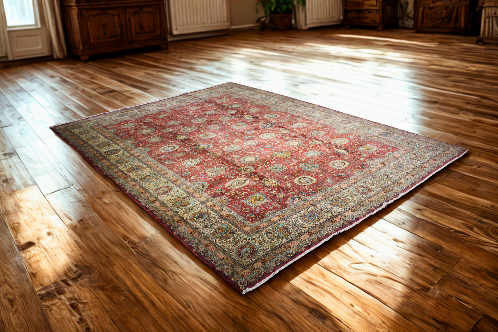 An extraordinary work of scale and intricacy, this monumental antique Tabriz rug is a masterpiece of Persian court weaving. Its ruby red field is a tapestry of finely drawn floral rosettes, swirling vines, and palmettes—meticulously knotted with a level of detail characteristic of Tabriz workshops. The pale ivory border, richly decorated with flowering tendrils and cloudband motifs, adds contrast and refinement, creating a regal frame around the field.
