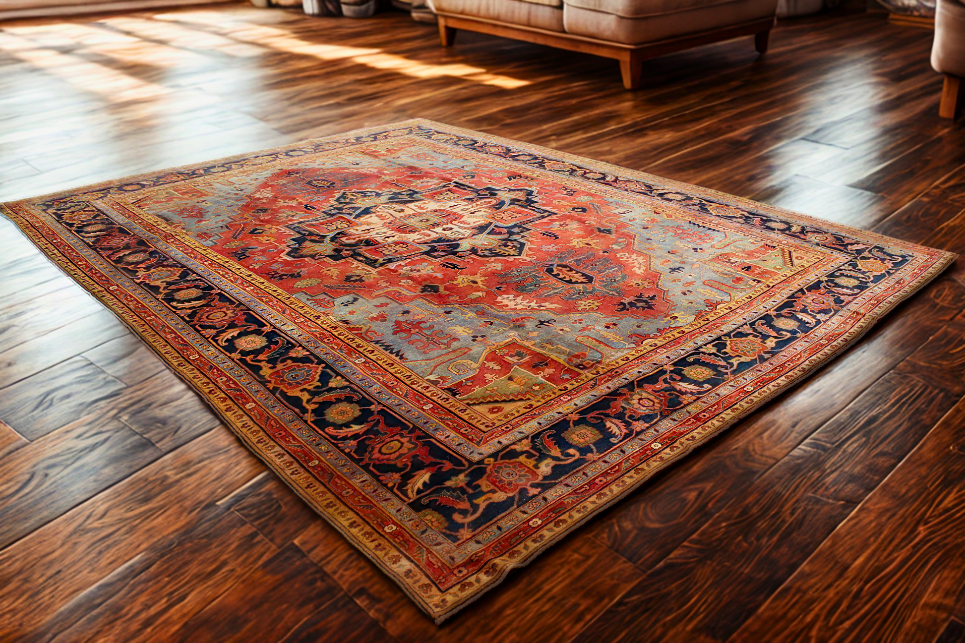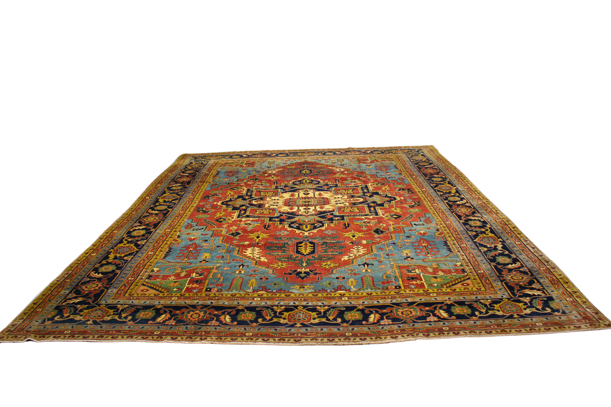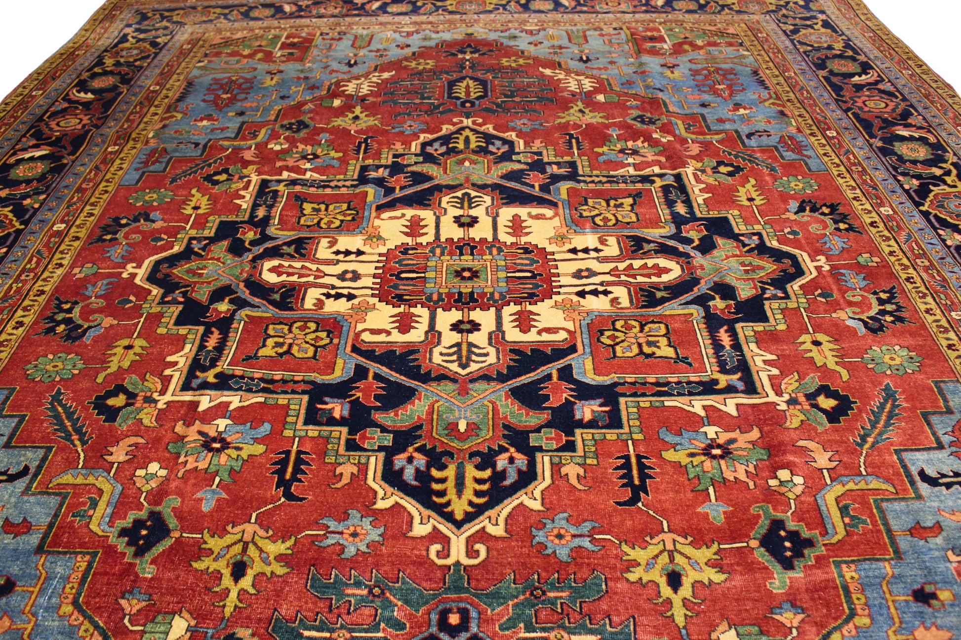 This majestic antique Serapi rug stands as a pinnacle of Persian craftsmanship, featuring the iconic large-scale medallion layout that Serapi rugs are celebrated for. The rust-red field is anchored by a commanding ivory and navy medallion, surrounded by stunning sky-blue spandrels that lend a unique luminosity to the composition. Delicate vines, stylized foliage, and angular floral elements create a striking balance between geometric order and organic flow.