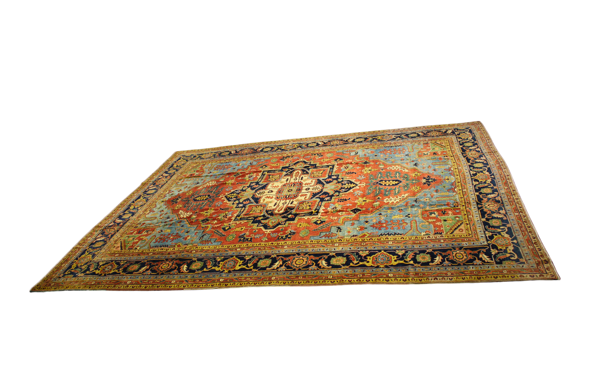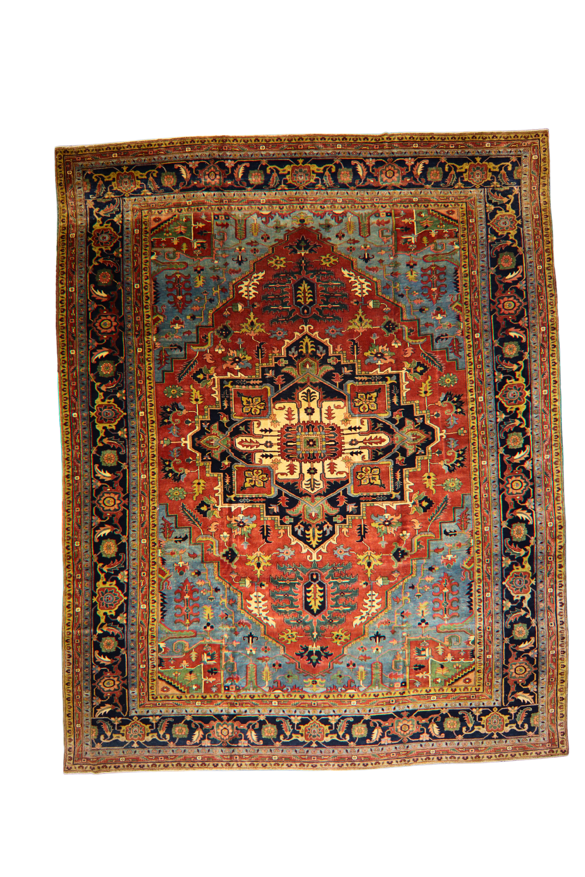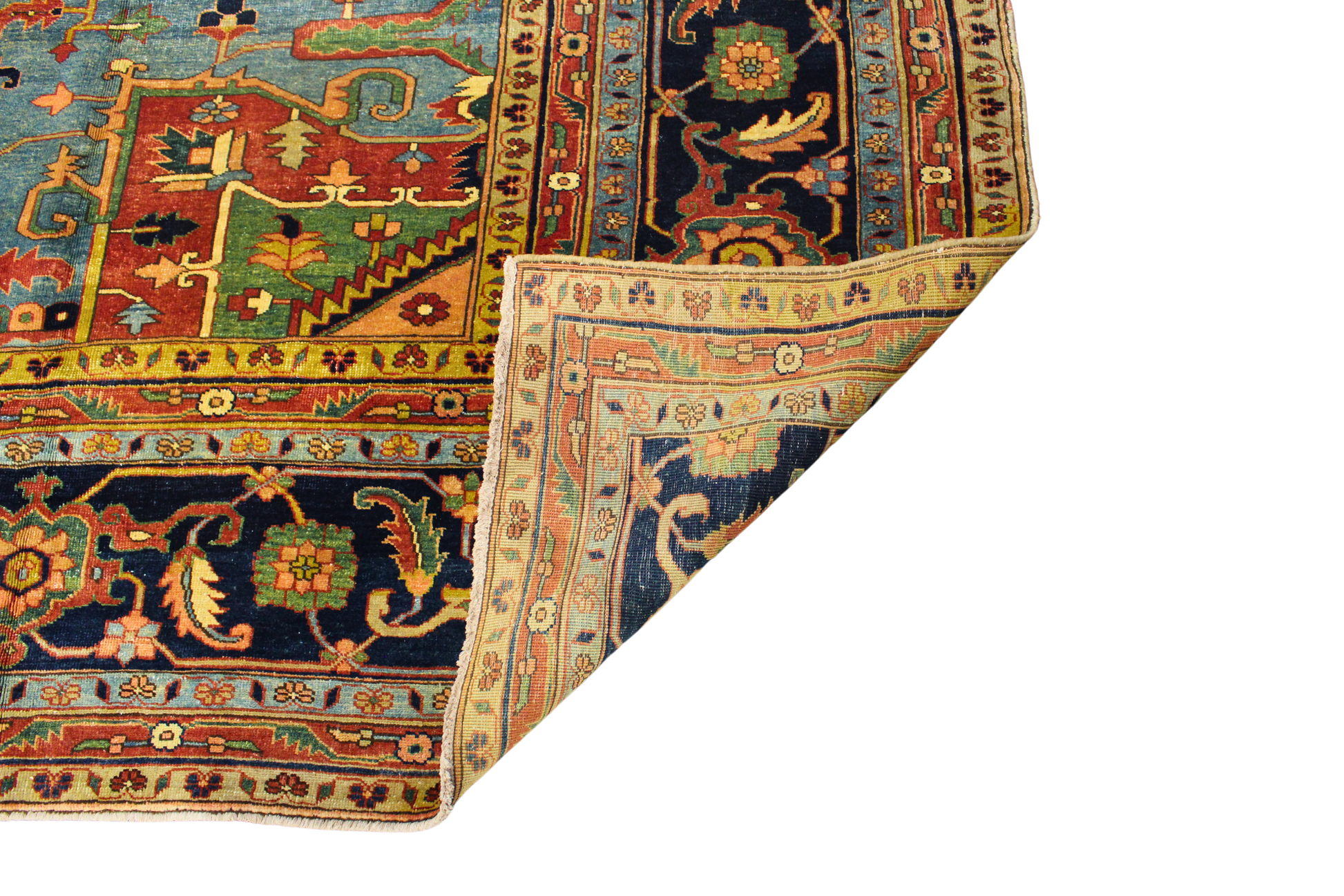 This majestic antique Serapi rug stands as a pinnacle of Persian craftsmanship, featuring the iconic large-scale medallion layout that Serapi rugs are celebrated for. The rust-red field is anchored by a commanding ivory and navy medallion, surrounded by stunning sky-blue spandrels that lend a unique luminosity to the composition. Delicate vines, stylized foliage, and angular floral elements create a striking balance between geometric order and organic flow.
