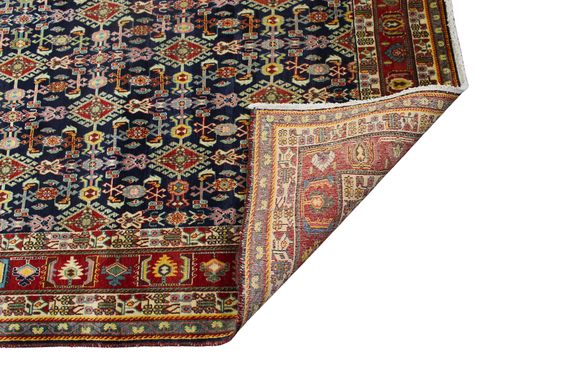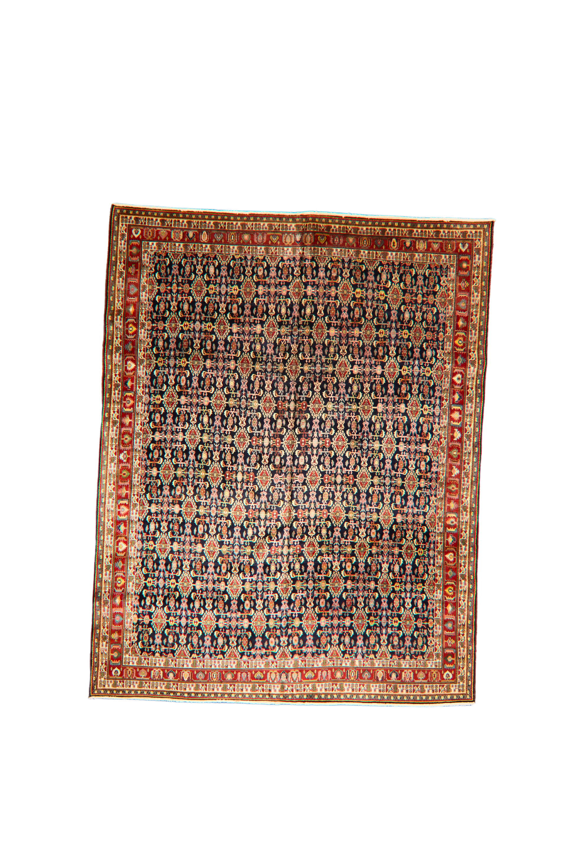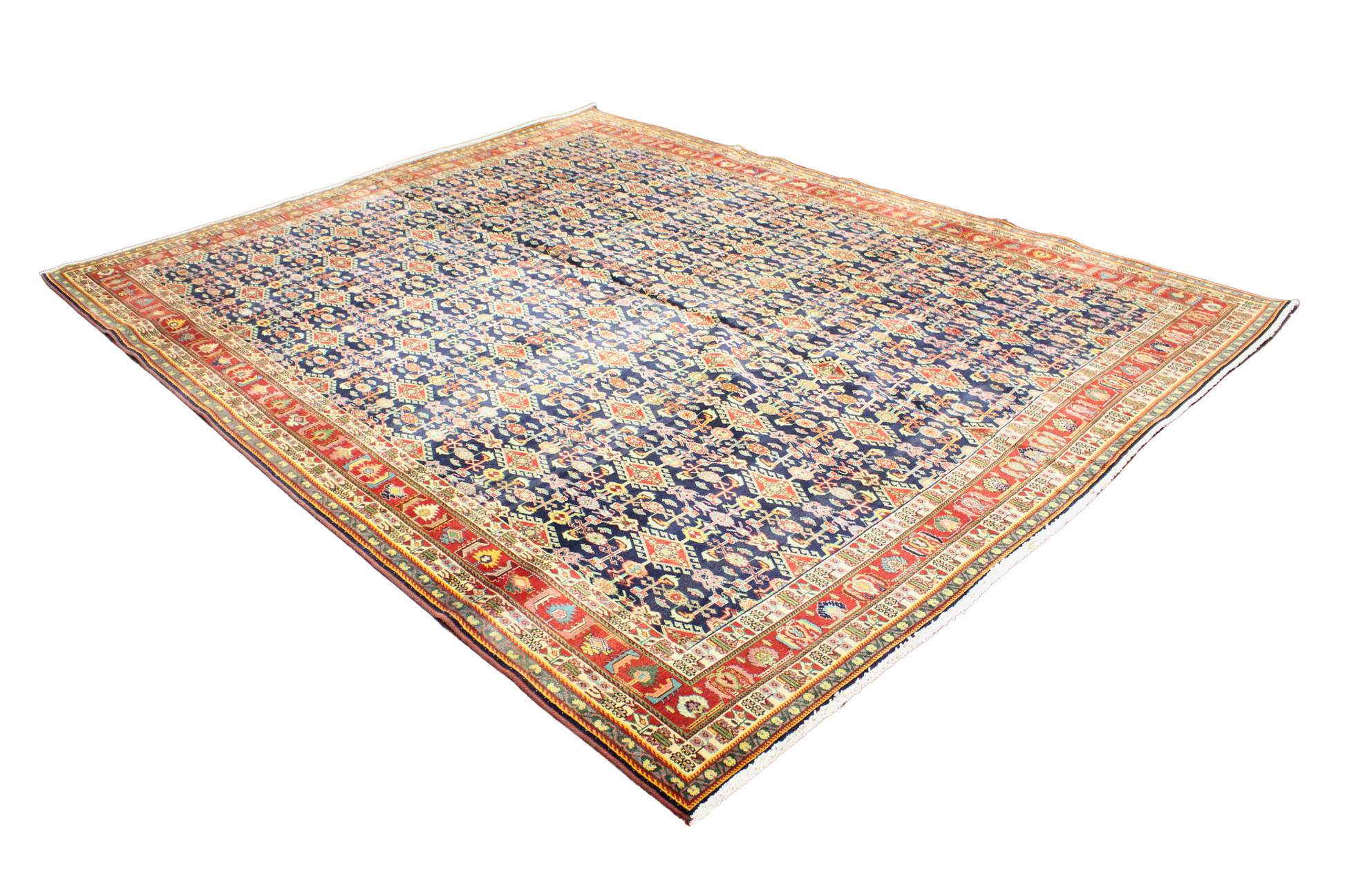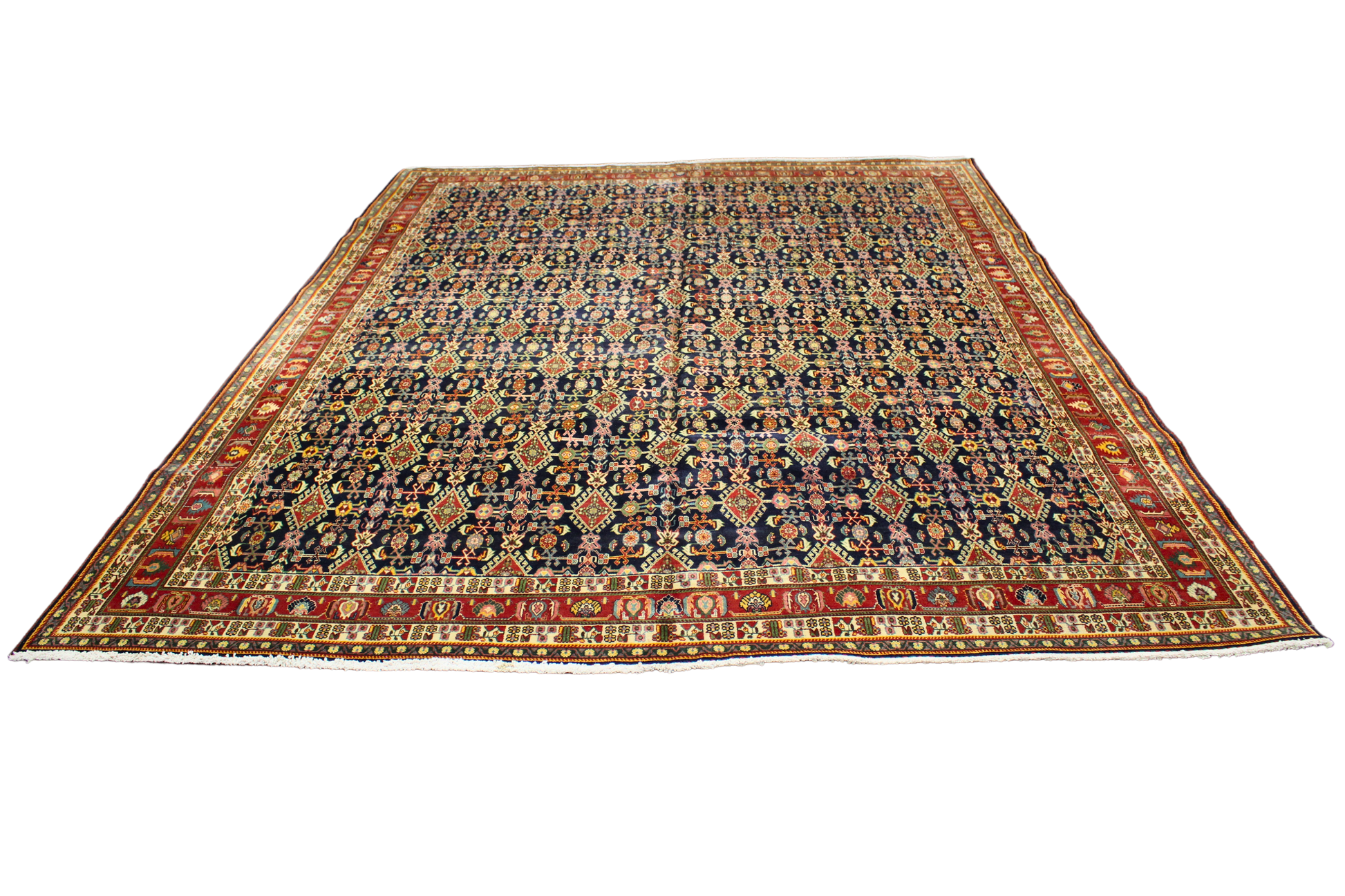 This grand antique Shiraz rug boasts an exquisite allover lattice design, meticulously hand-knotted in the tribal weaving traditions of southern Persia. Its deep navy field is filled with a repeating pattern of stylized blossoms and angular boteh motifs, each rendered in rich tones of saffron, soft coral, pistachio, ivory, and sky blue. The vibrant red border frames the composition beautifully, adding rhythm and contrast to the densely detailed field.