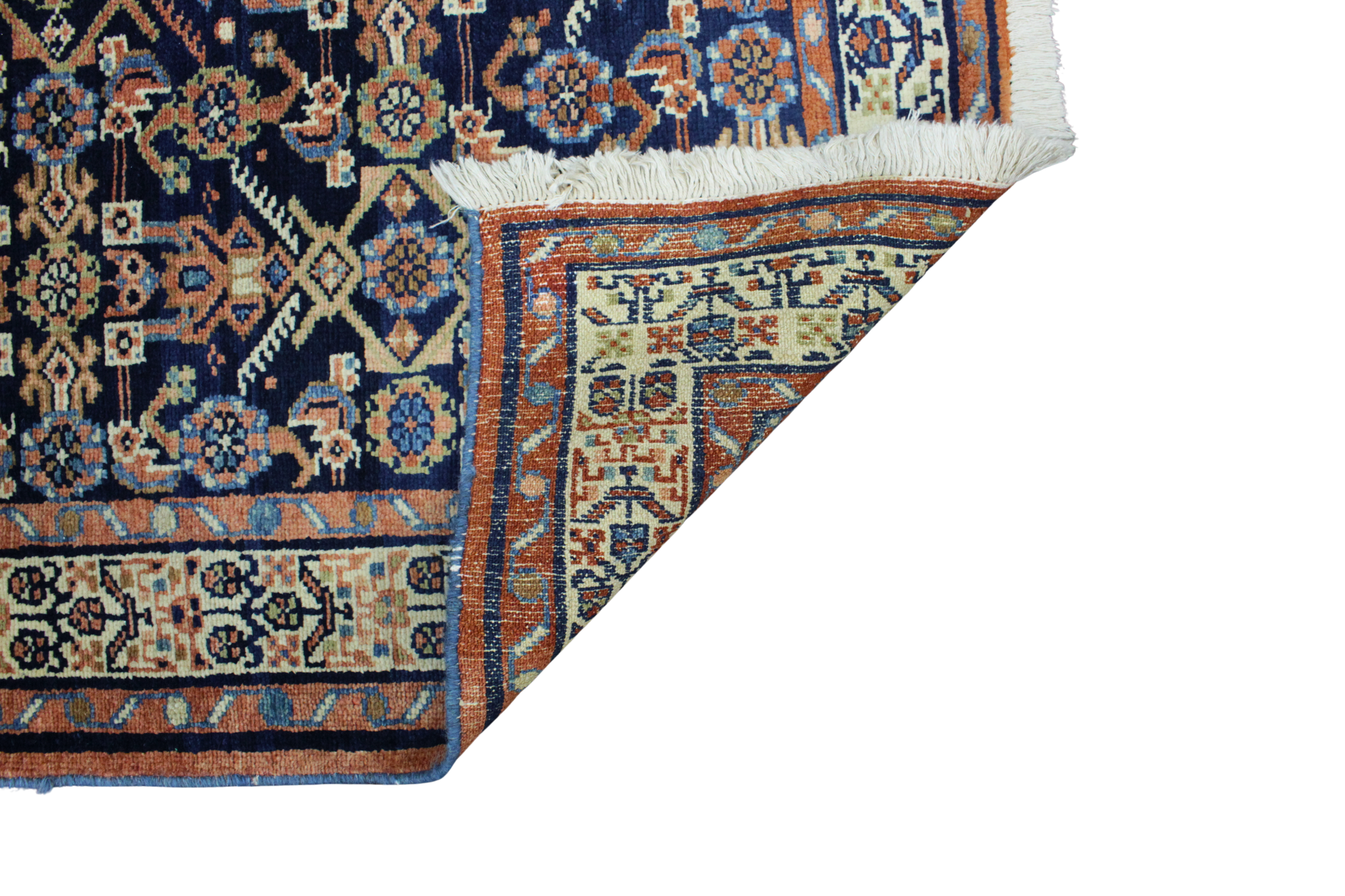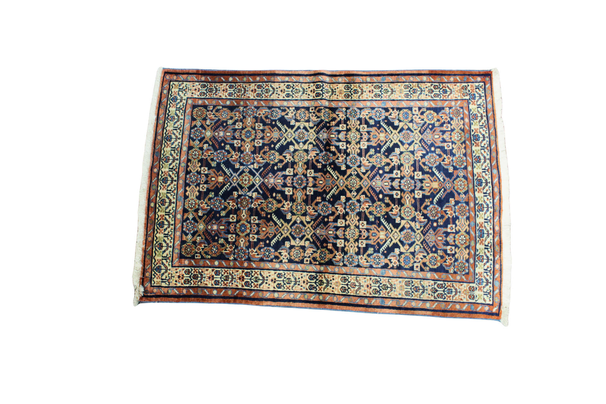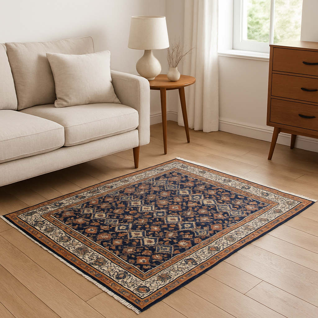 This compact Mahal rug from Persia showcases a mesmerizing lattice of geometric florals and tribal motifs, woven in a richly saturated navy field. Its refined arrangement of rosettes, diamonds, and abstract florals creates a rhythmic visual texture, while the intricate border frames the composition in warm earth tones. The ivory guard borders with stylized floral meanders soften the darker central palette, balancing contrast and harmony with every knot.