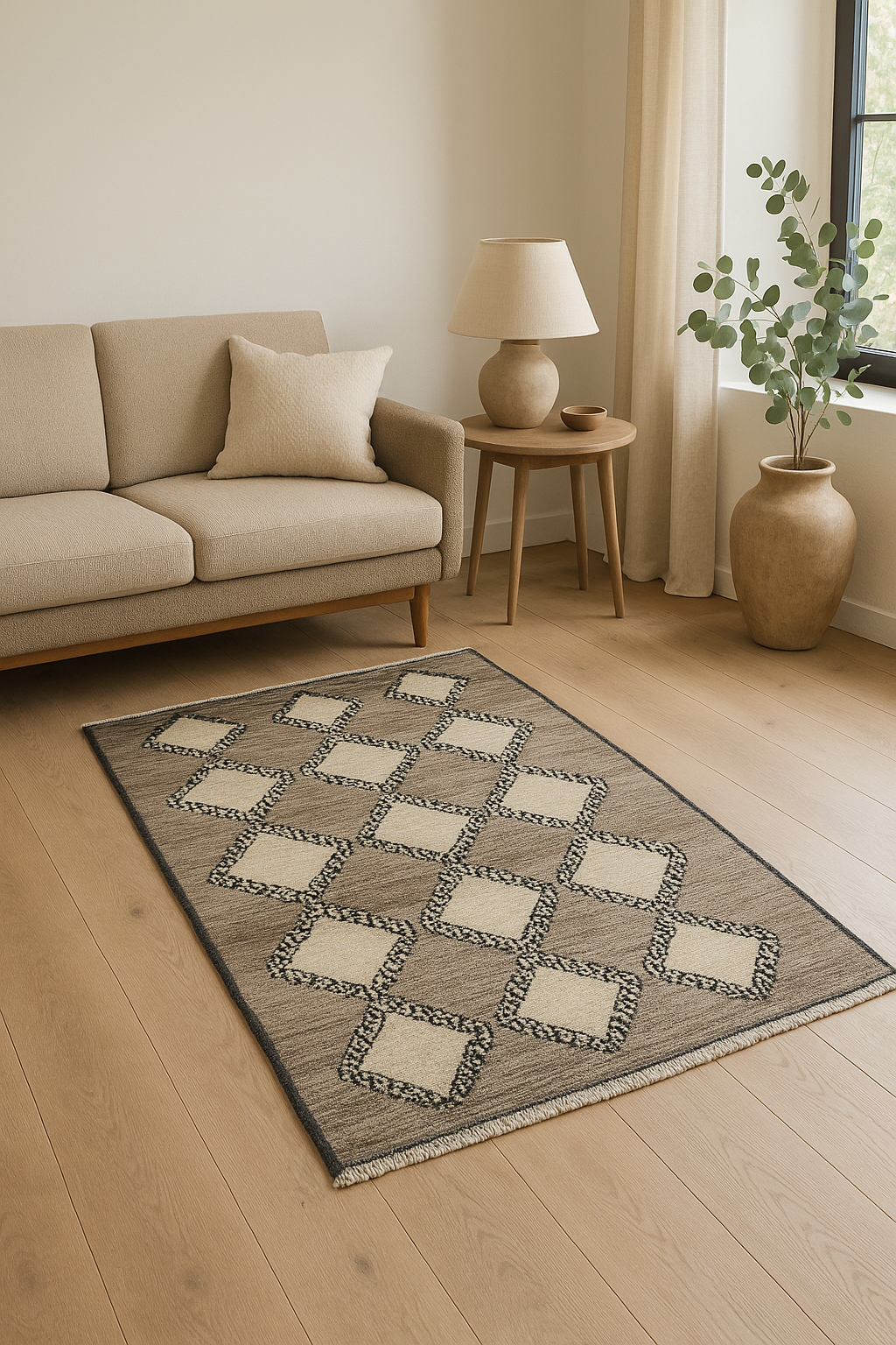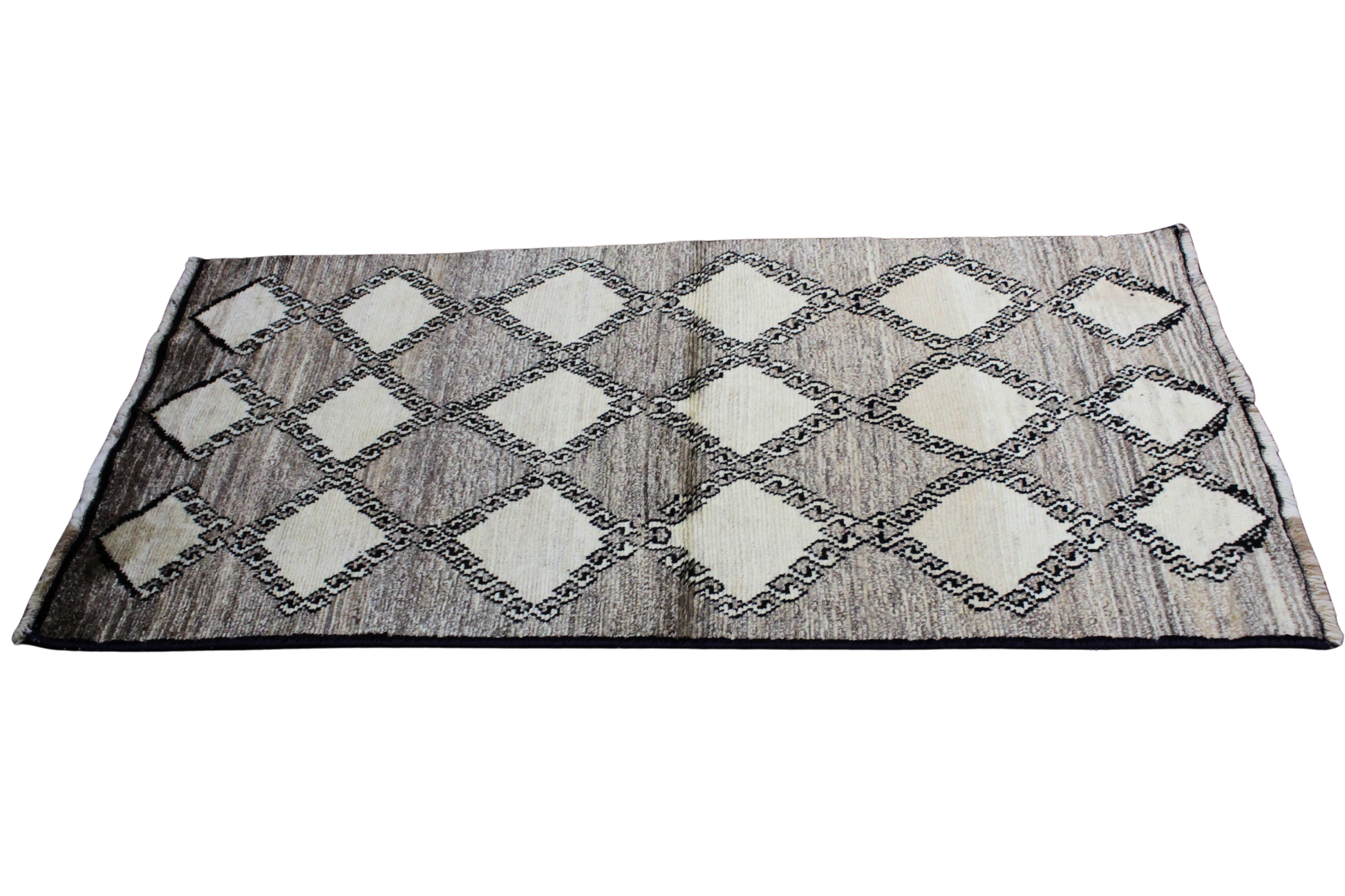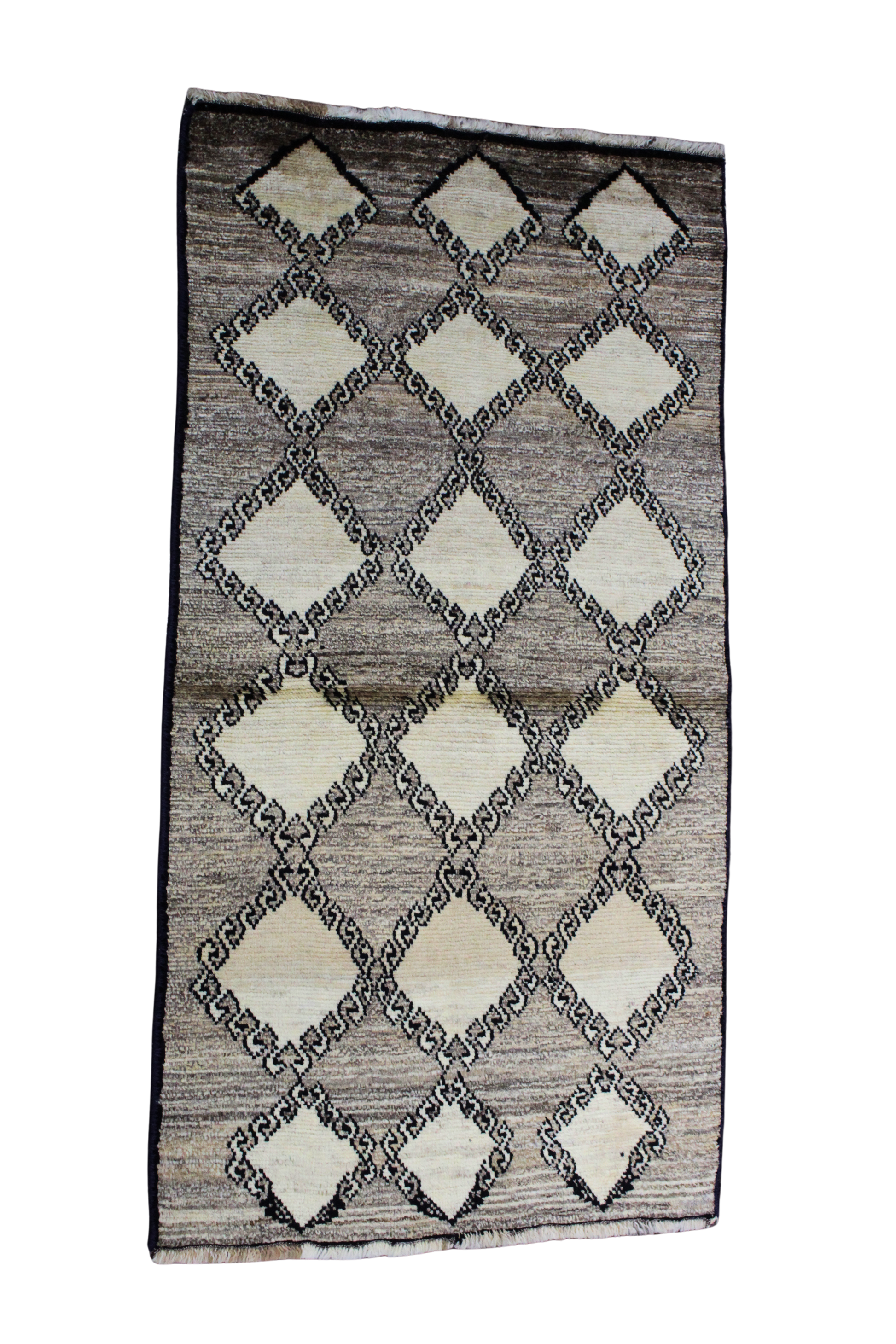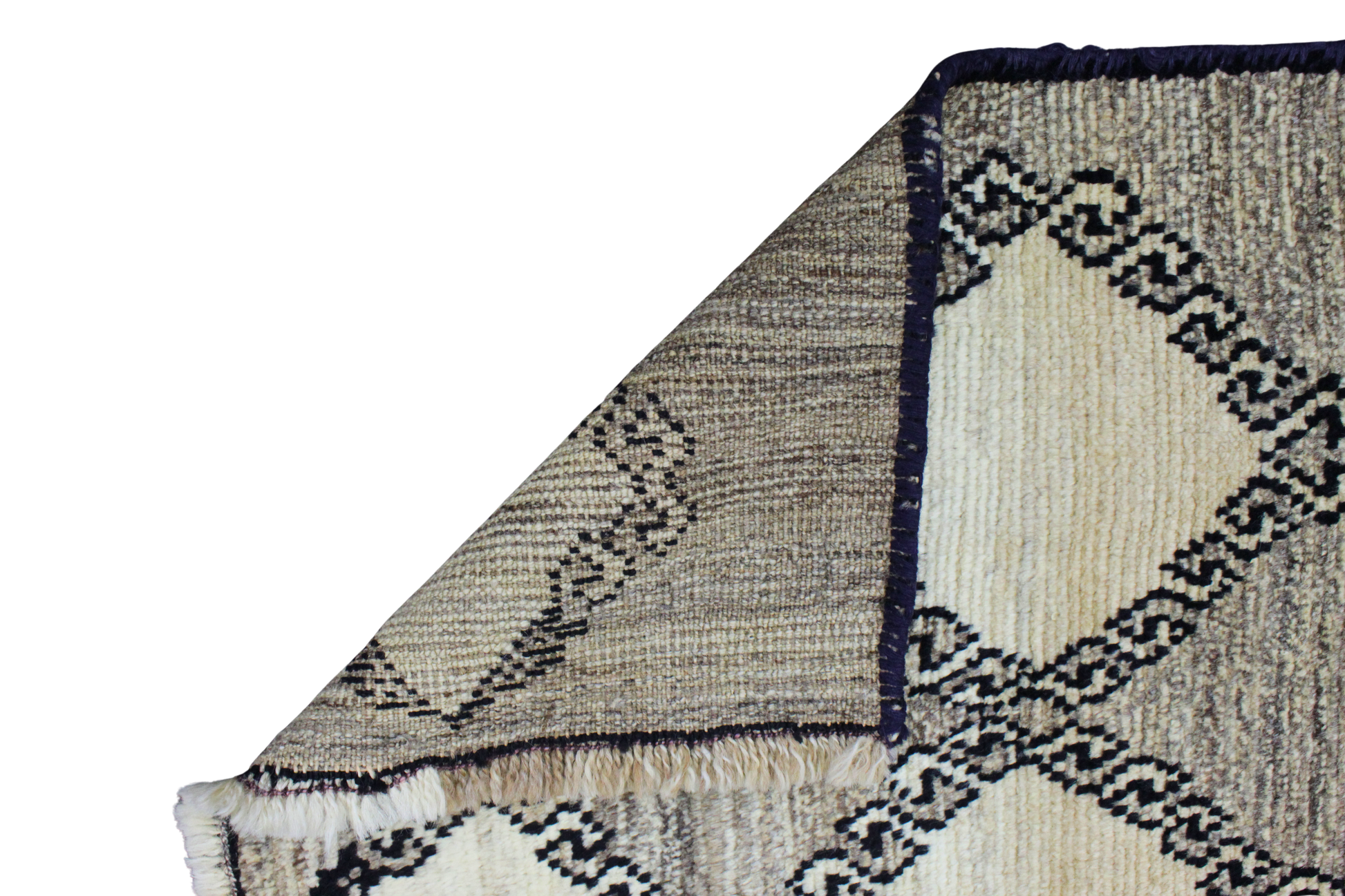 With a rhythmic lattice of stepped diamonds floating across a field of softly variegated neutrals, this hand-knotted Shiraz rug blends tribal heritage with minimal modernity. The alternating cream and charcoal motifs — edged in delicate serrated black borders — evoke traditional Persian symbolism while maintaining a bold geometric restraint. Its compact size and subtle contrast make it perfect for grounding small spaces with a touch of artistic edge.