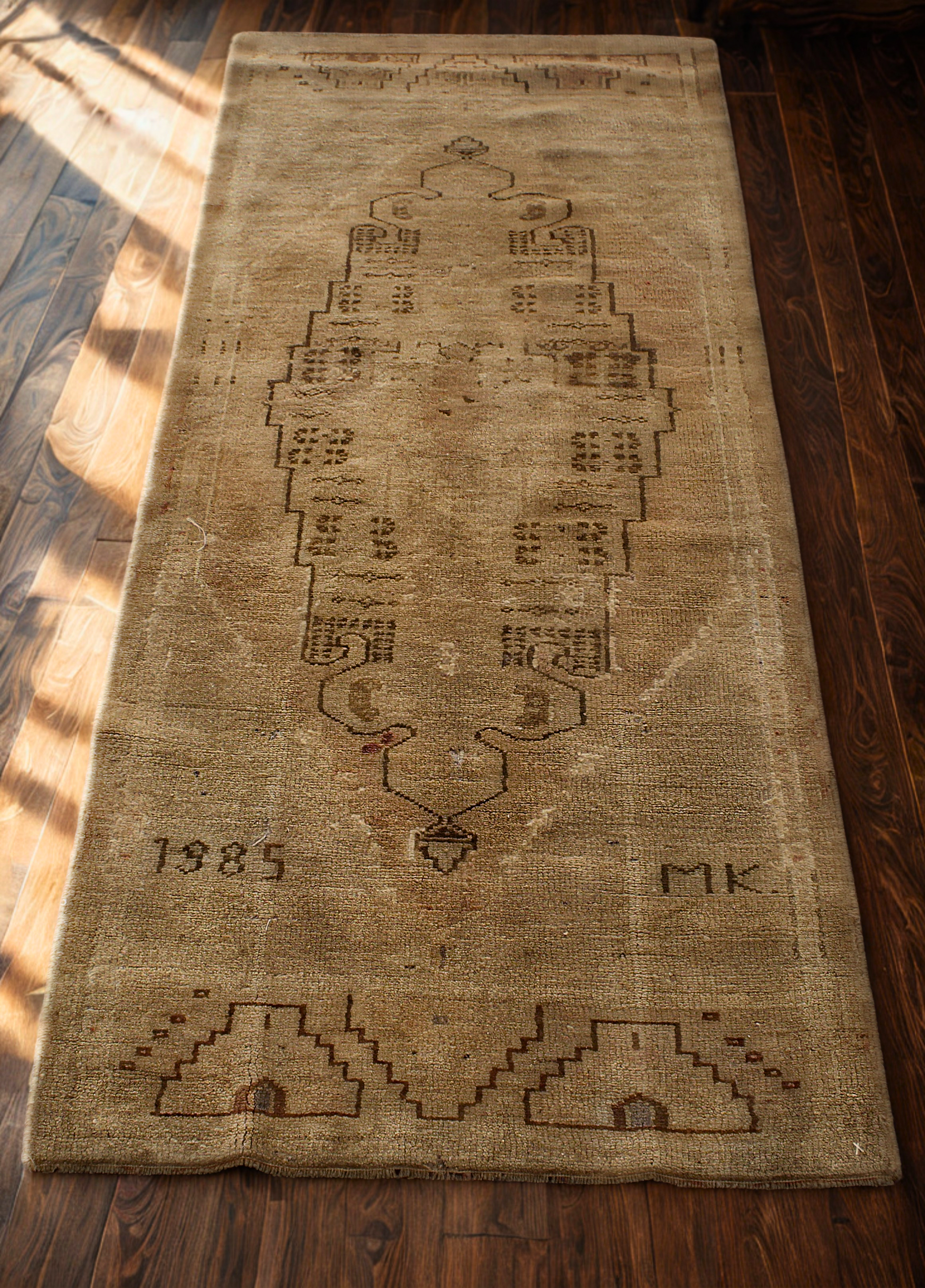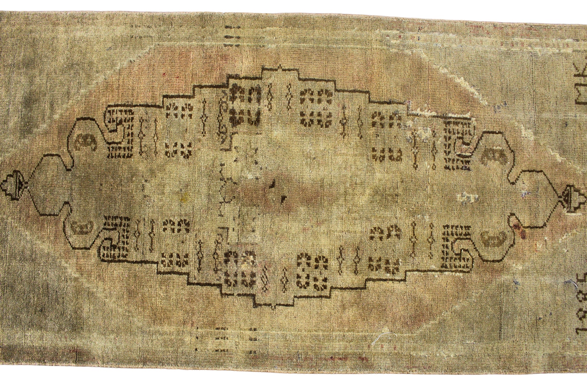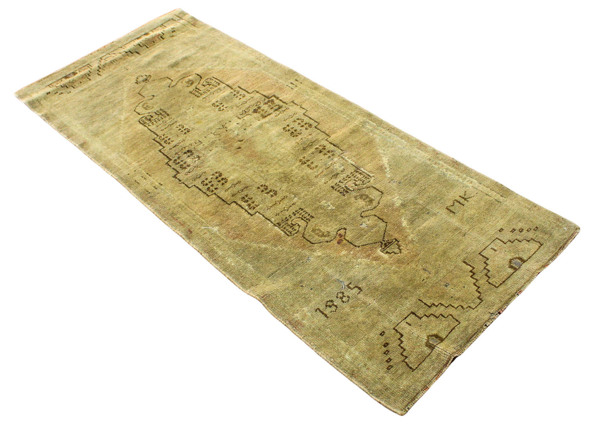 Time has softened every fiber of this antique Turkish Oushak rug (2.3 × 5.6 ft), leaving behind a ghostly beauty that whispers rather than shouts. Woven in the 19th century — as the faint "1885" inscription hints — the rug is a masterclass in subtlety, rendered in weathered olive and muted charcoal tones with faint stepped motifs and primitive geometric outlines.