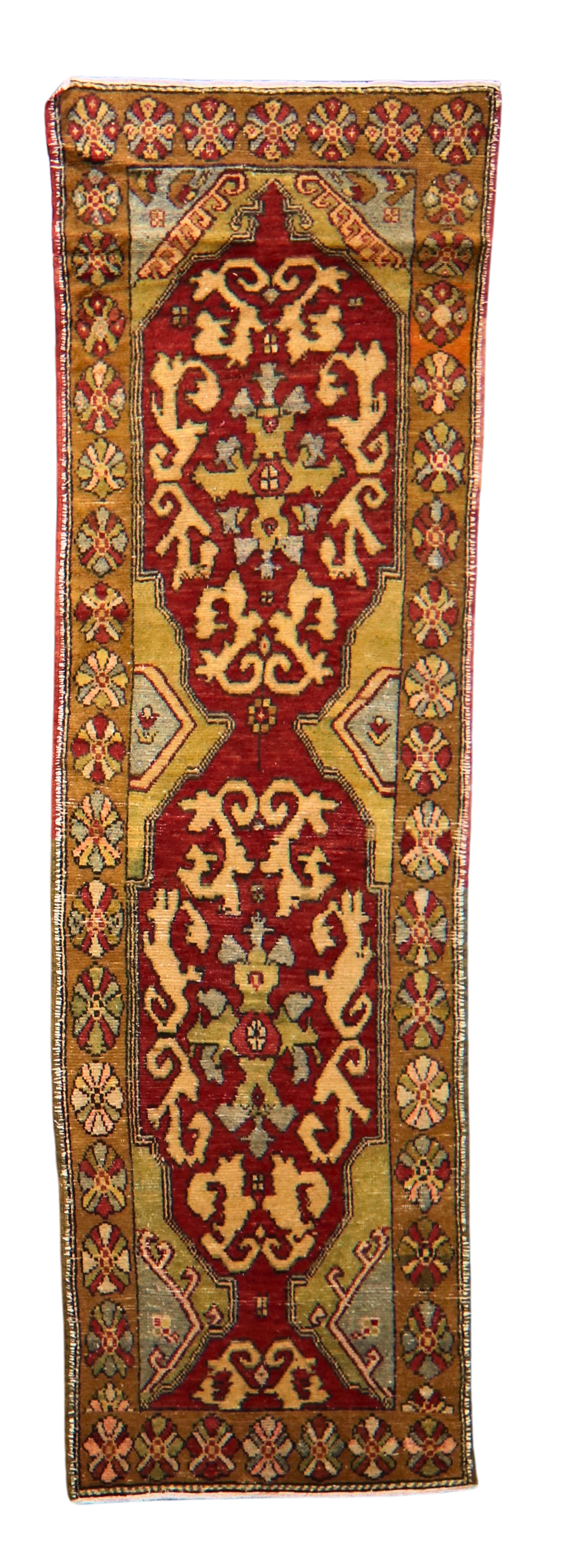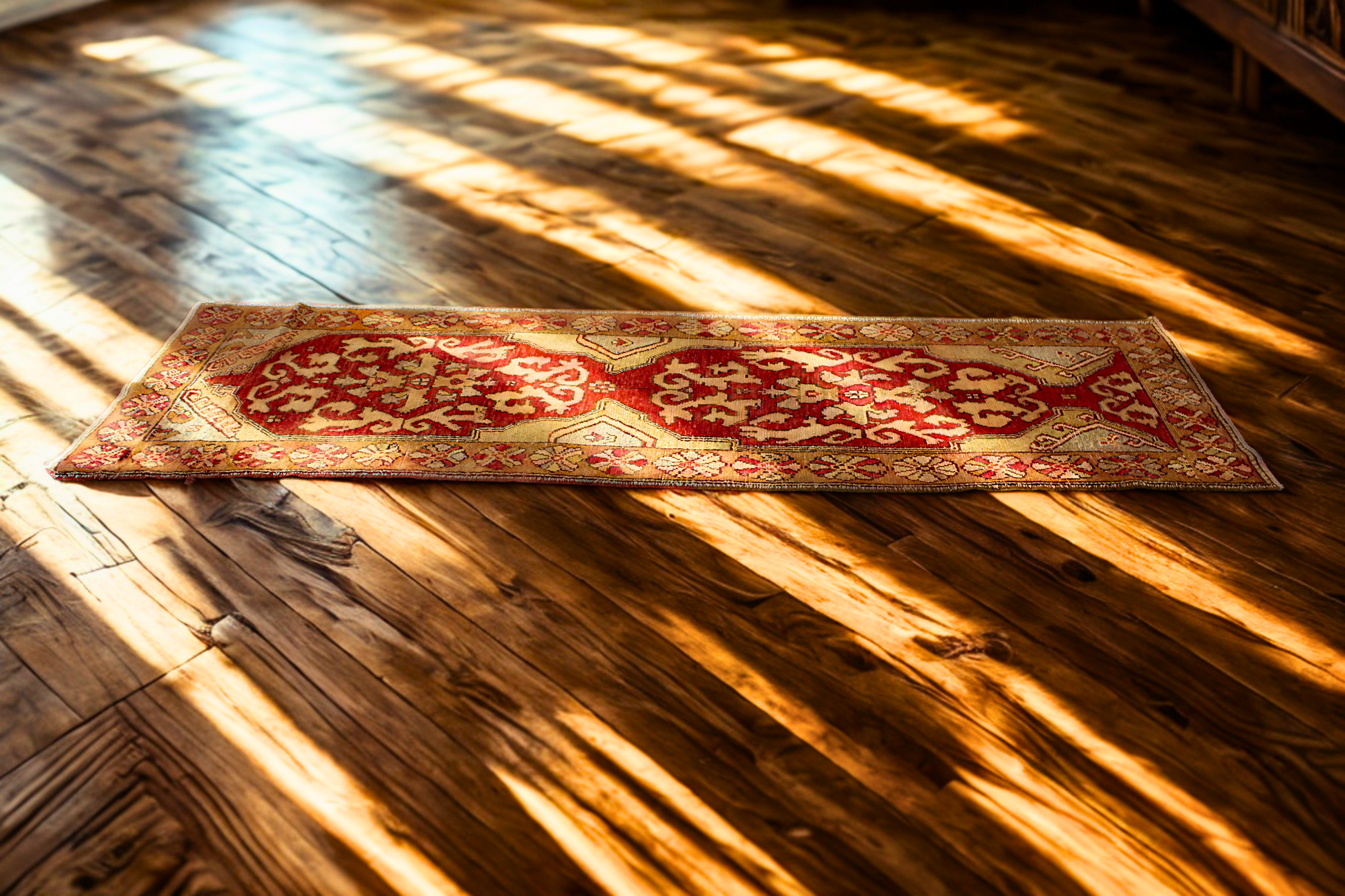 A wide border filled with rosettes and tulip-like blossoms adds rhythm and charm, framed by narrow inner guards that enhance the runner’s architectural feel. Its angular motifs and soft, worn-in pile reflect the passage of time, making it not only a visual statement but a piece of cultural continuity.