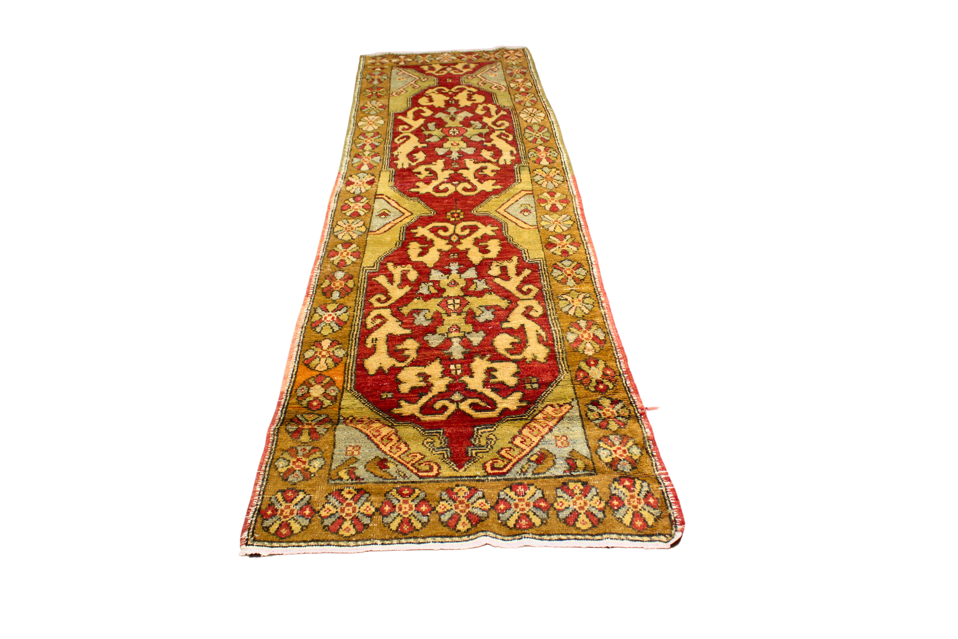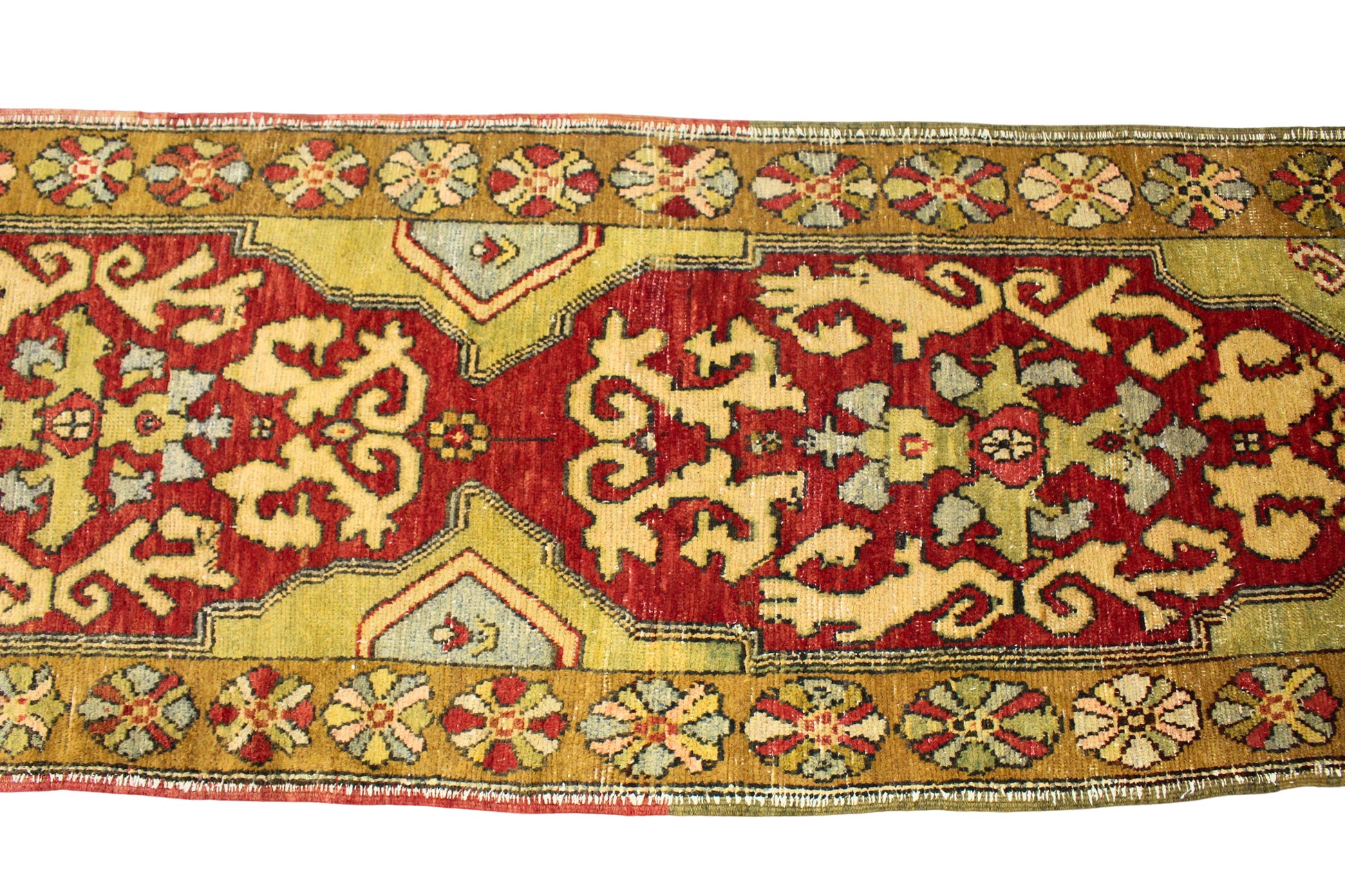 With vibrant colors and classic Anatolian motifs, this antique Oushak runner (3 × 10 ft) captures the spirit of 19th-century Turkish village weaving. The saturated crimson field sets a rich backdrop for a sequence of stylized floral medallions and abstract vines in soft olive, sand, and muted teal.