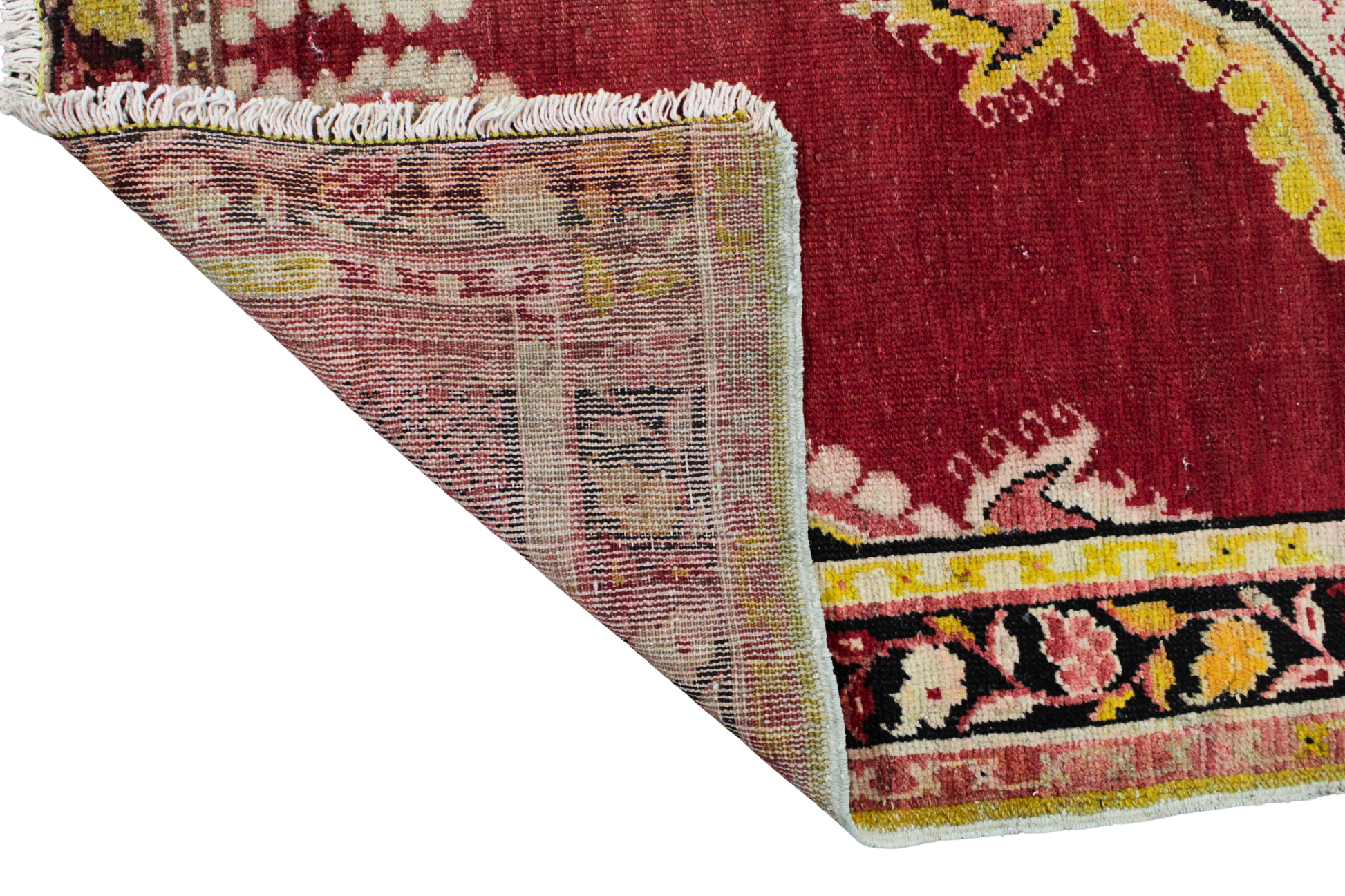 Brimming with old-world charm, this antique Turkish Oushak rug (3 × 6 ft) showcases a striking central medallion in a creamy ivory field surrounded by a rich red background. The medallion features an intricate lattice pattern framed with soft yellow scalloping, adding dimension and vintage refinement. Each corner is adorned with stylized vine motifs, gently mirrored to echo the symmetry of traditional Anatolian design.