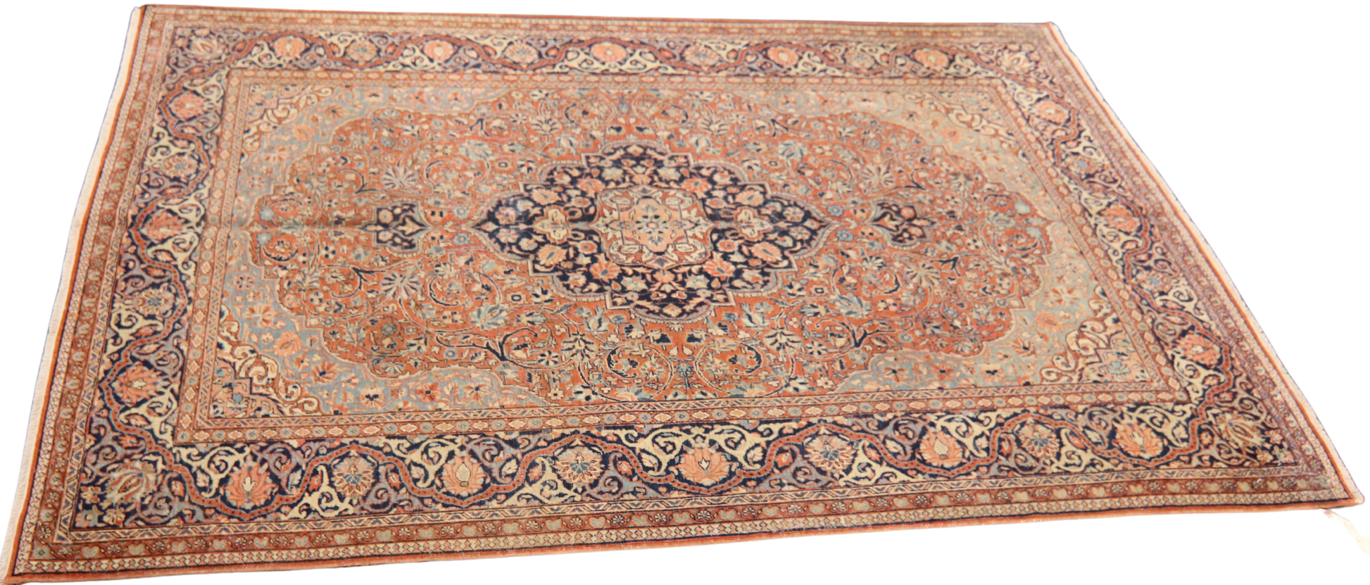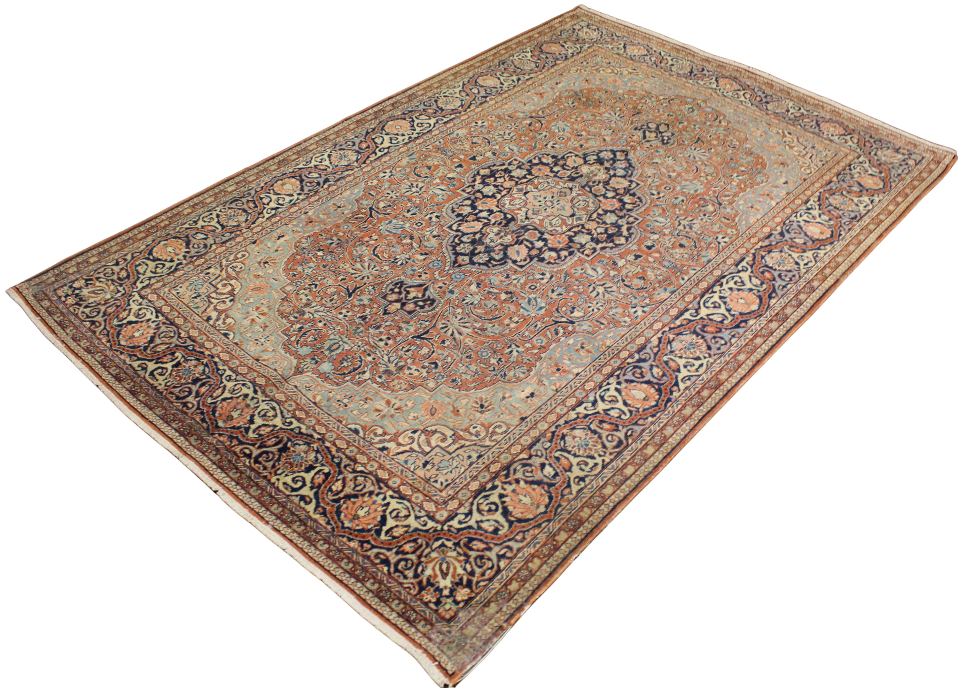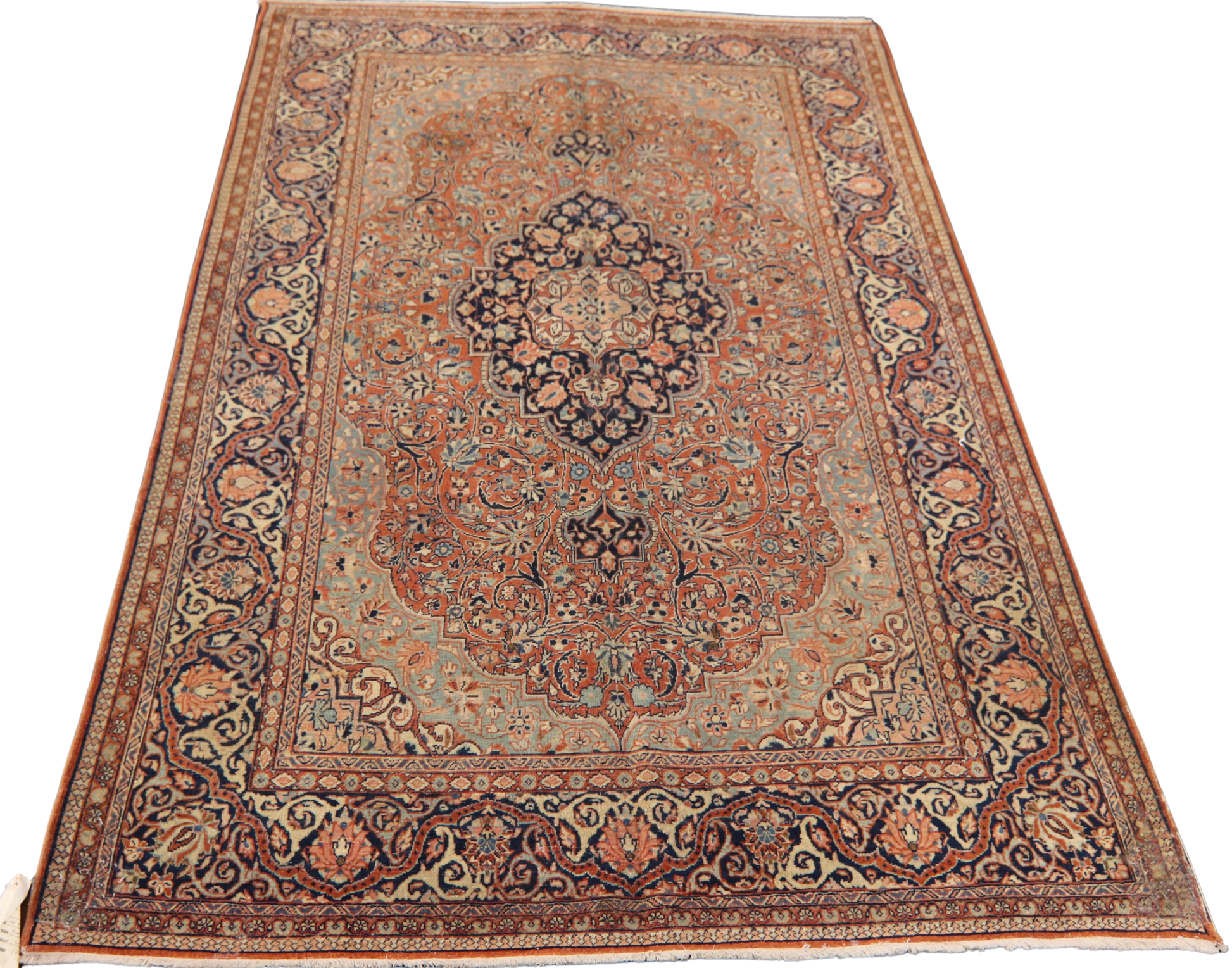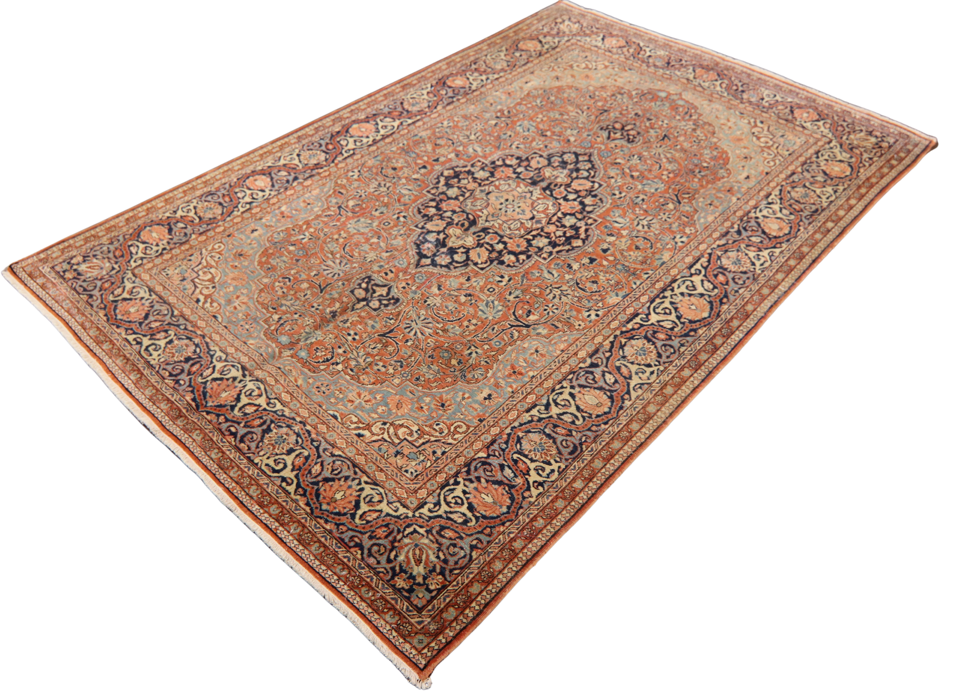 This antique Kashan rug (4.4 × 6.7 ft) radiates classical refinement with its meticulously drawn central medallion and floral arabesques, embodying the grace and precision of Persian court weaving. The navy medallion is nested within a pale sky-blue and soft coral-red field filled with swirling vines, rosettes, and palmettes — all woven with painterly finesse.