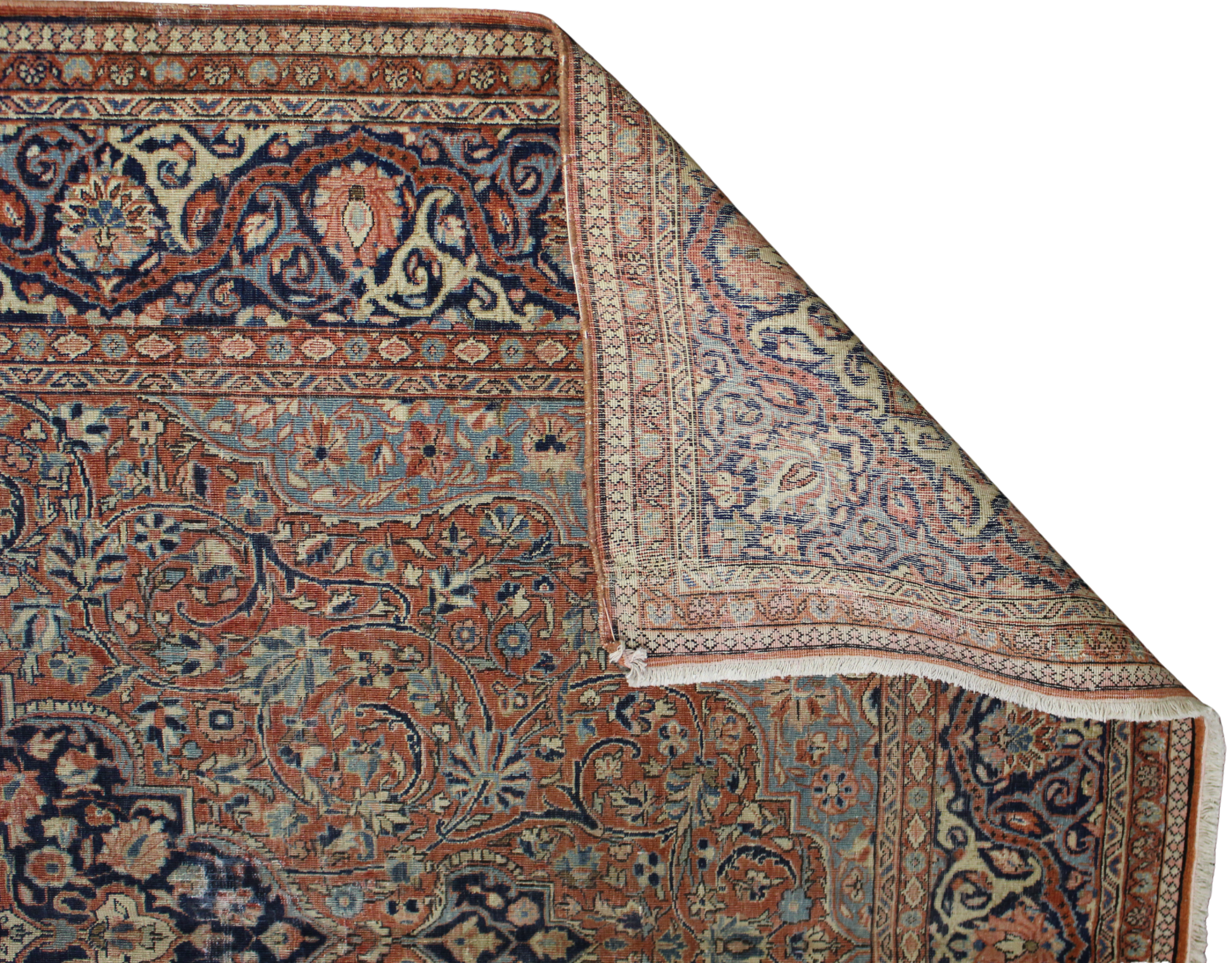 The wide border, in deep indigo with ivory and rose floral scrolls, beautifully frames the composition, emphasizing symmetry and balance. A true representation of Kashan’s renowned craftsmanship, this piece is ideal for elegant interiors where traditional sophistication is prized.