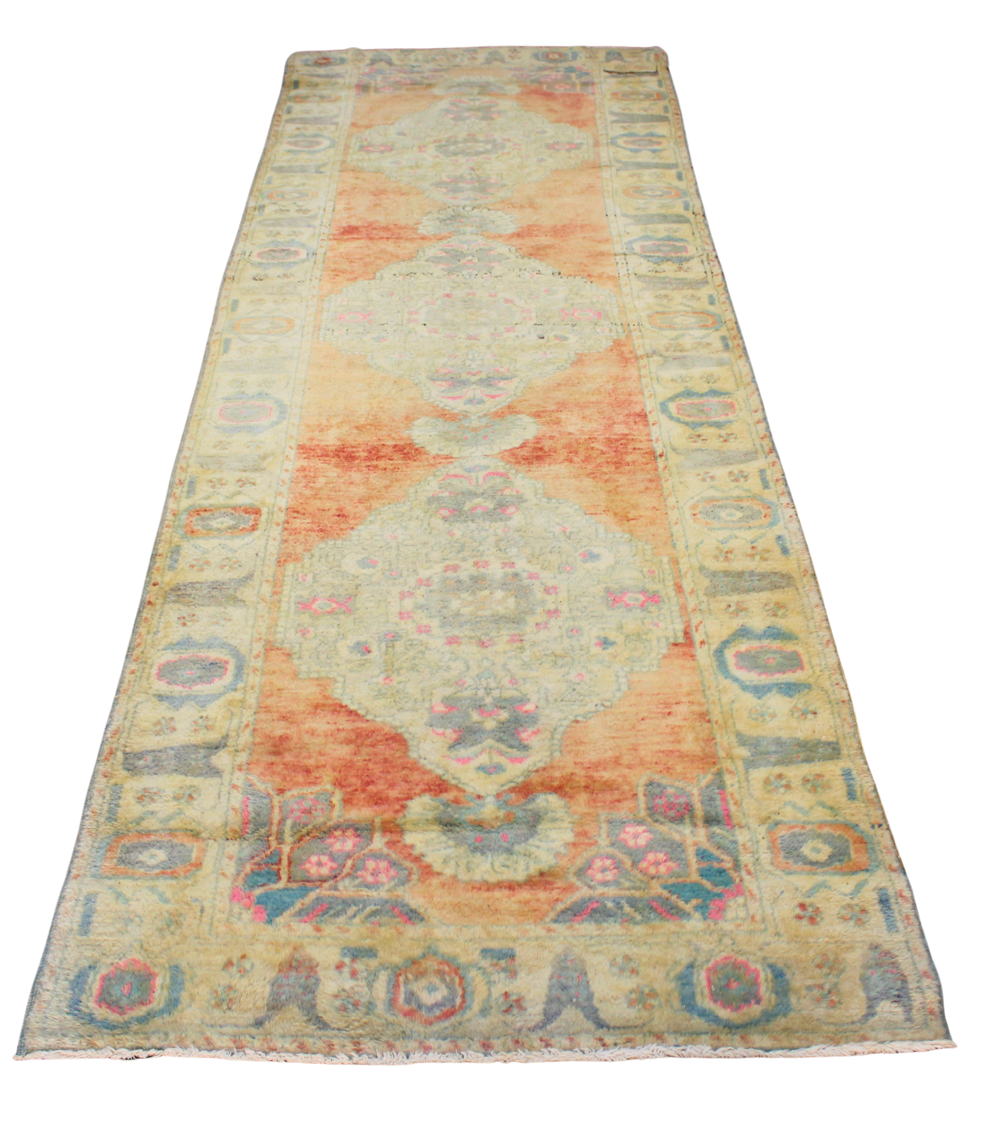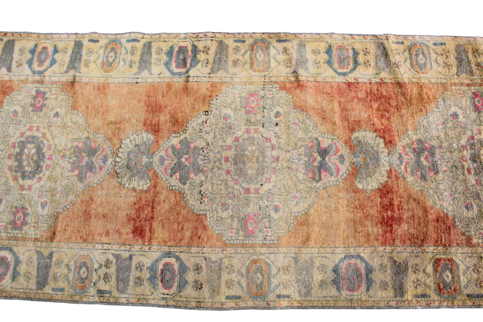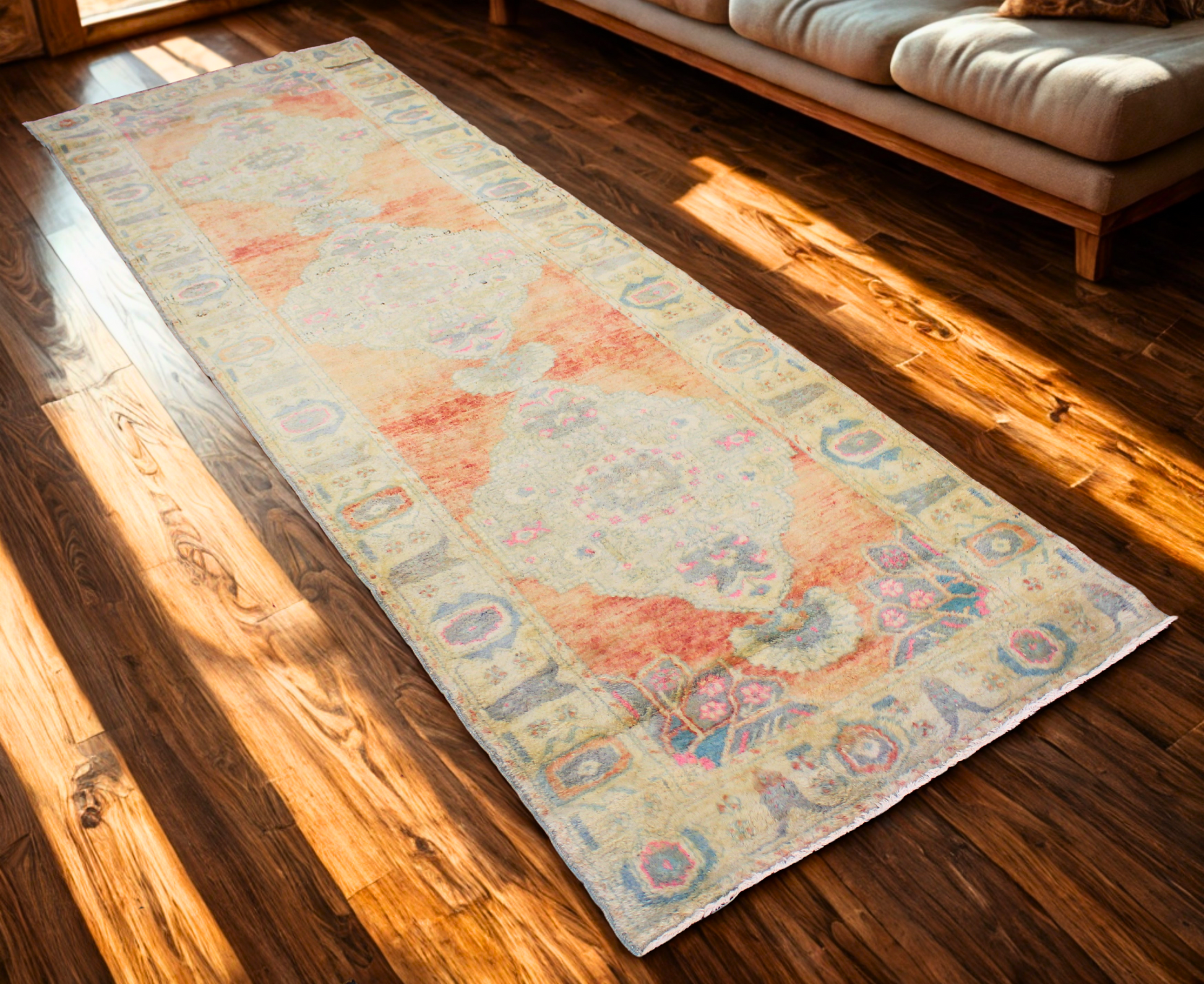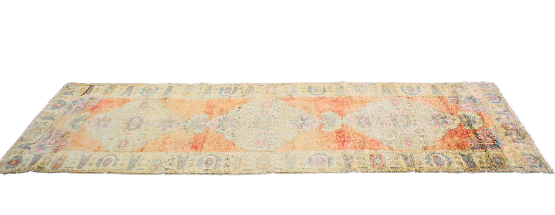 Bask in the gentle warmth of this antique Turkish Oushak runner (3.5 × 10.8 ft), where time has softened every detail into a dreamy, sun-washed glow. Faded apricot fields are layered with soft medallions in powdery teal and washed coral, creating a delicate balance of contrast and age-earned serenity.