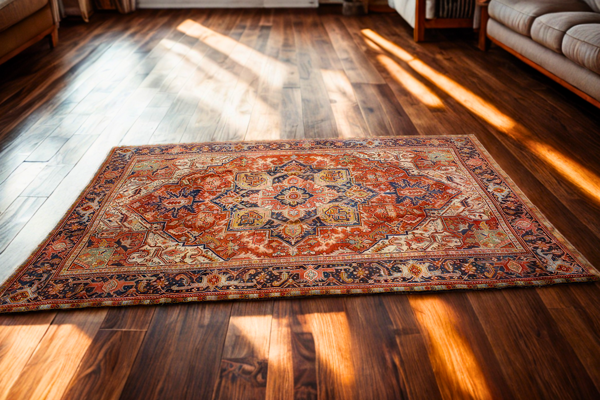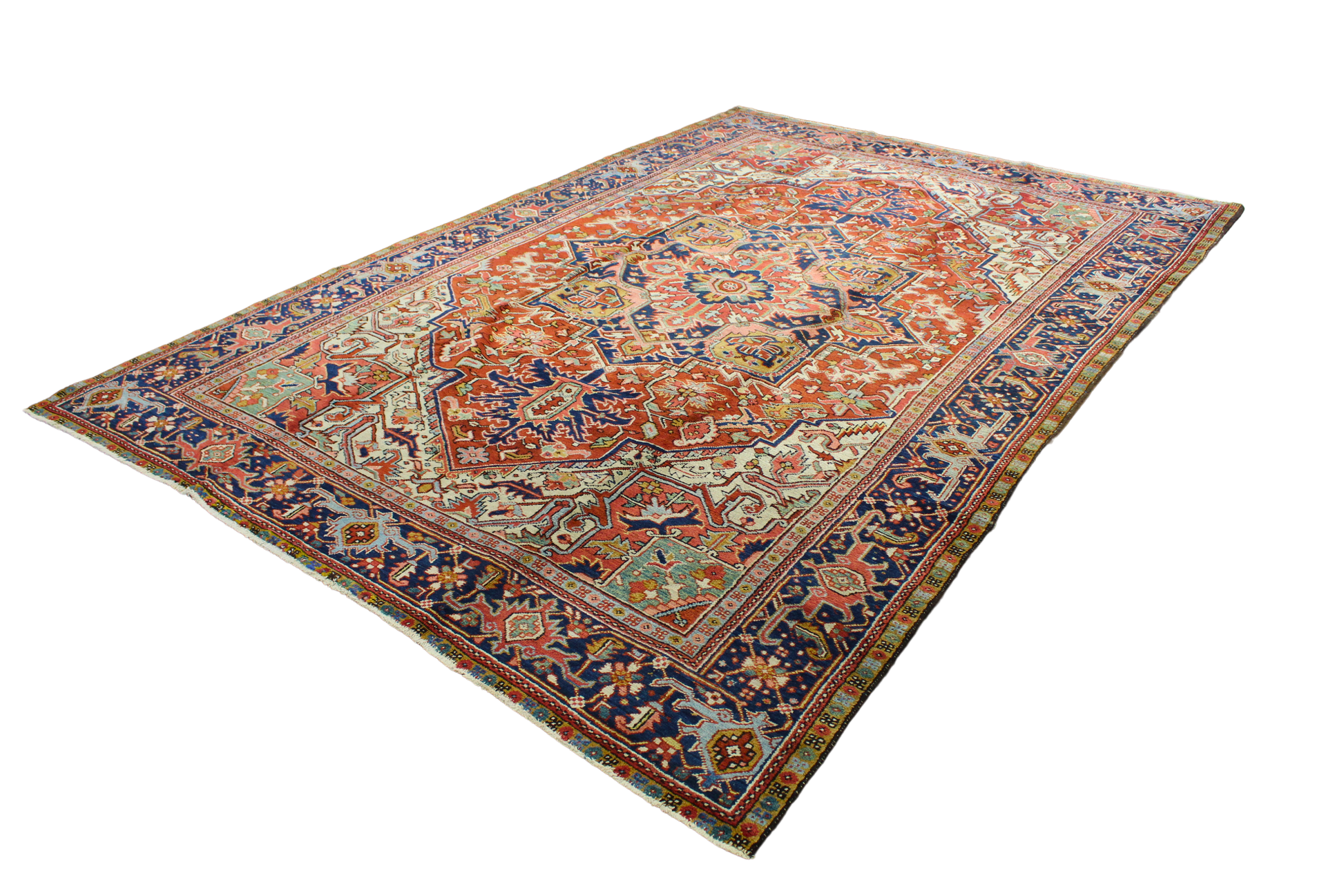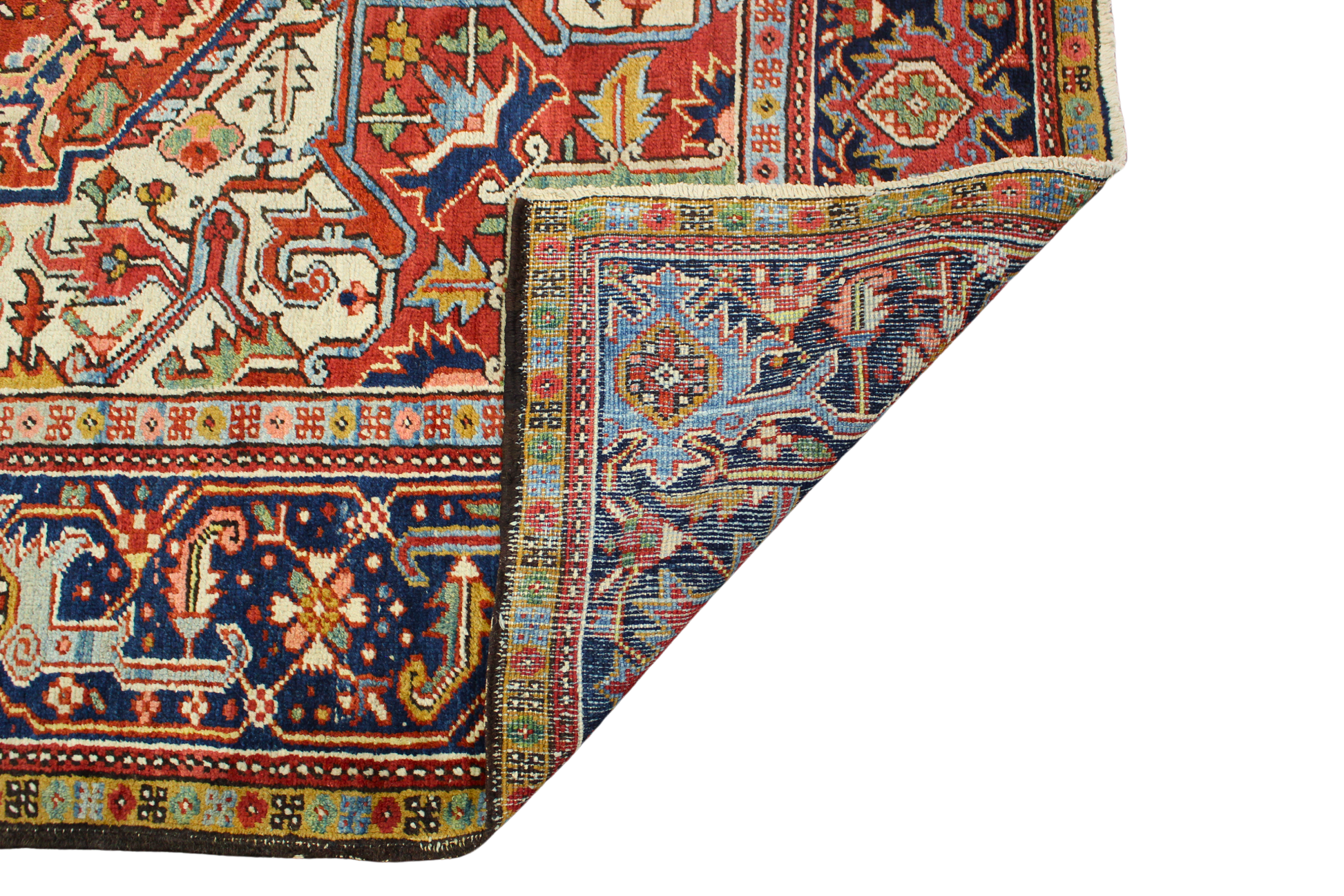 Commanding in presence and steeped in tradition, this antique Heriz rug is a bold statement piece featuring the classic geometric medallion that defines the Heriz style. The vibrant brick red field is anchored by a majestic central medallion in deep indigo and ivory, flanked by stepped spandrels and angular botanical motifs. Every element is crisply drawn and deeply saturated, showcasing the enduring artistry of Persian village weaving.