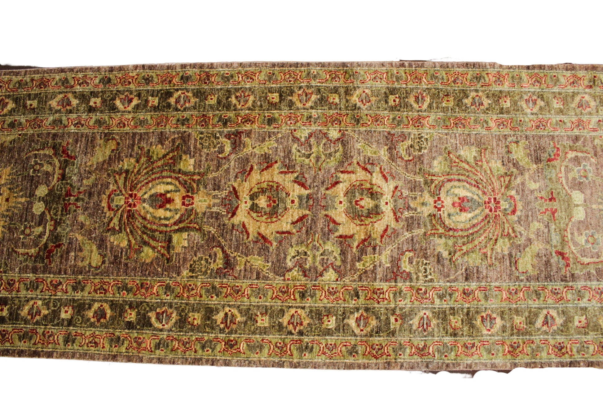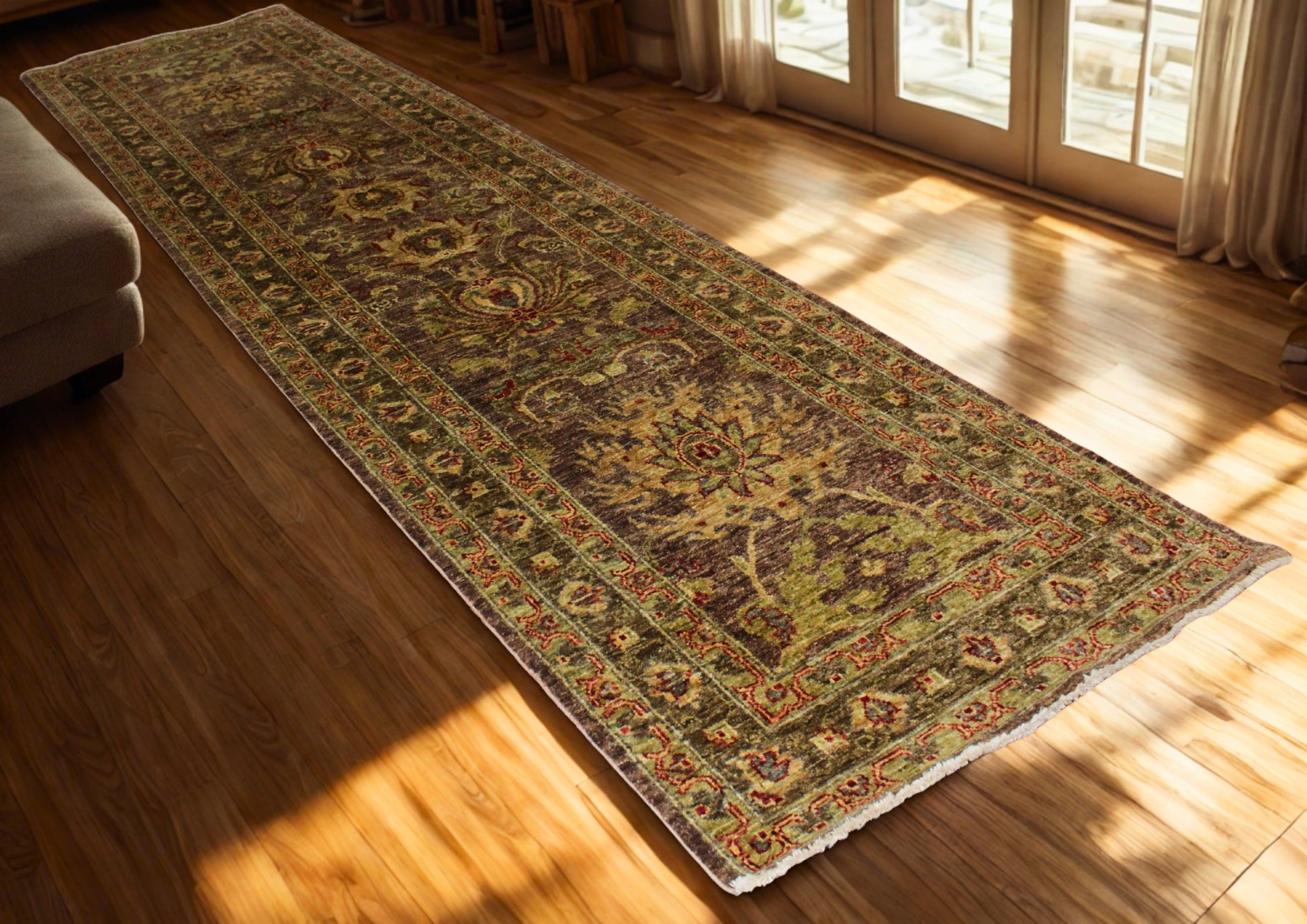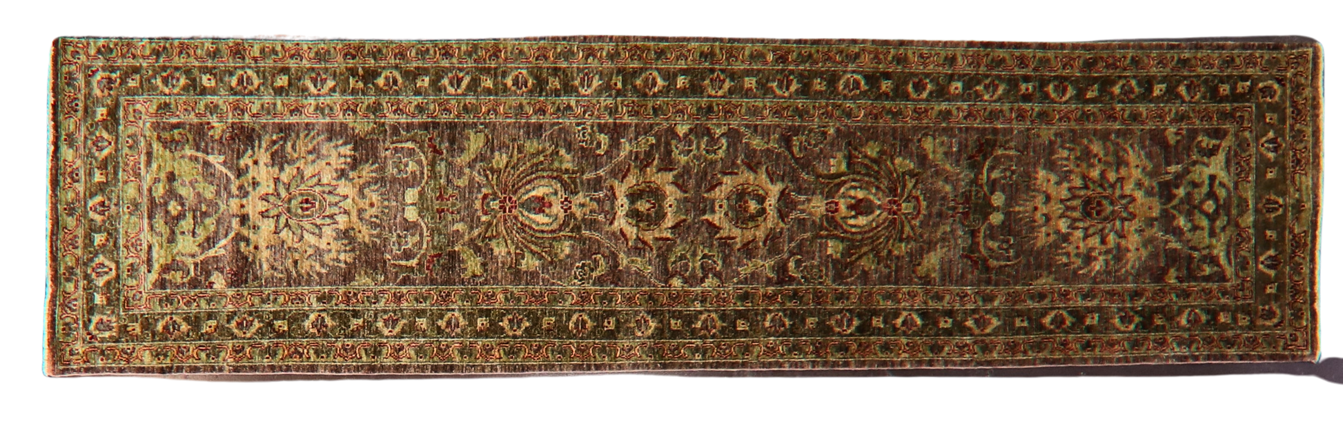 With its regal, earthy tones and grand scale, this Pakistani Oushak runner brings the depth of the forest indoors. A symphony of olive green, moss, and soft brown tones forms the backdrop for palmettes and stylized florals in rich reds, creams, and golds, all set within an elegantly layered border. The medallion motifs across the field feel rooted in tradition, while the saturated palette offers bold contemporary appeal.