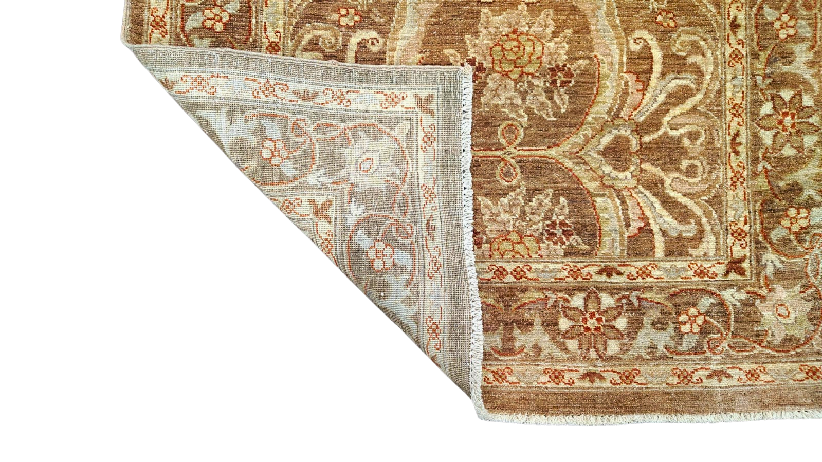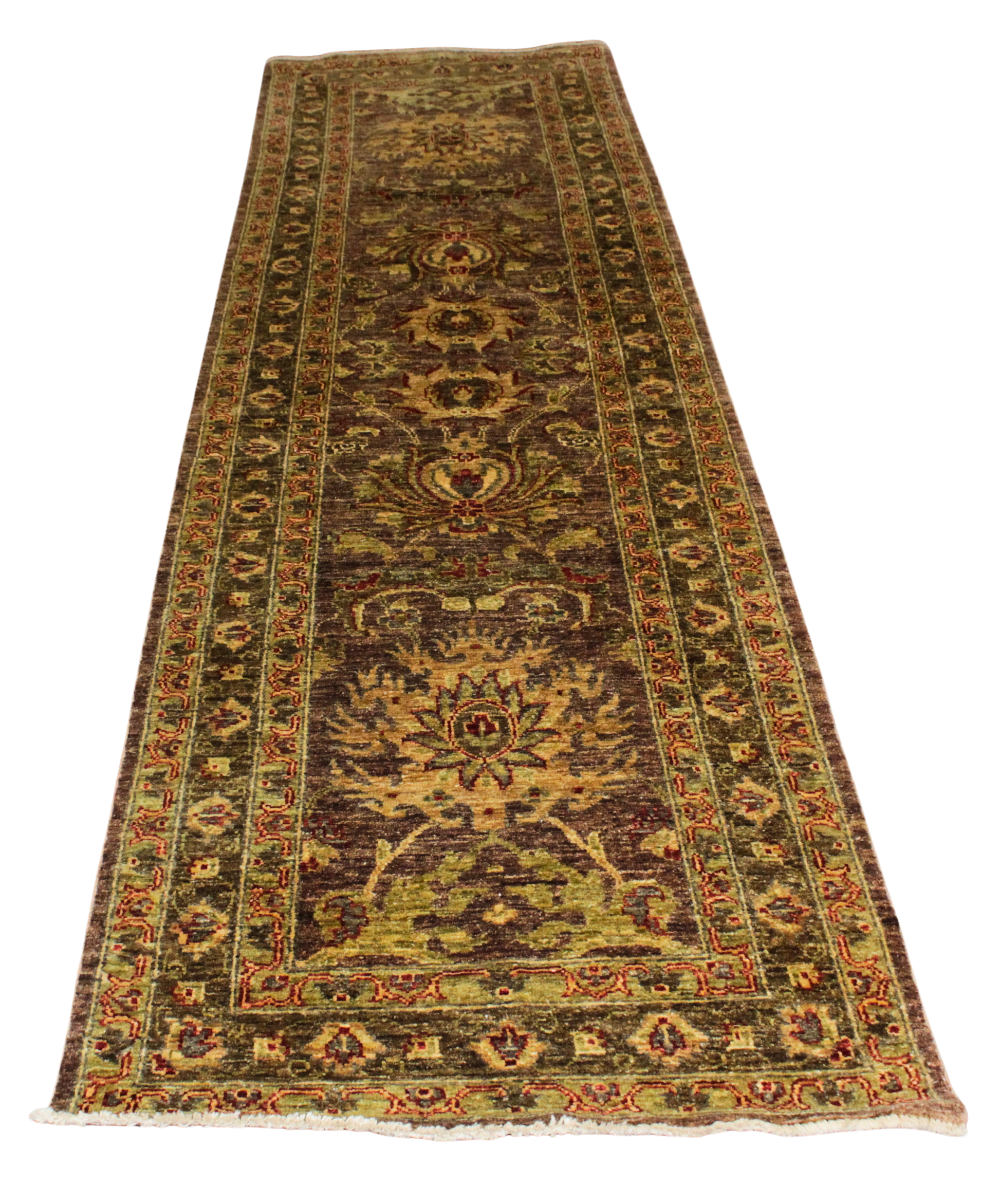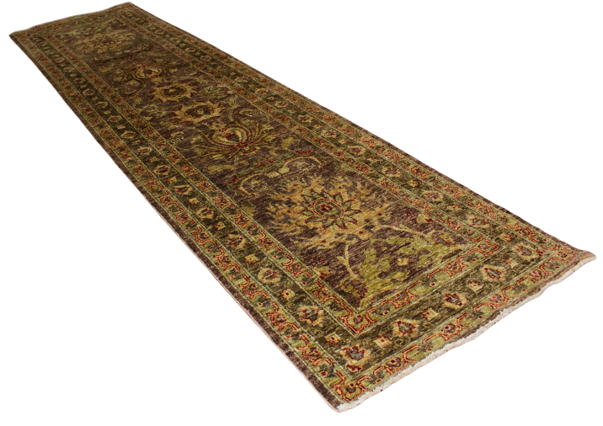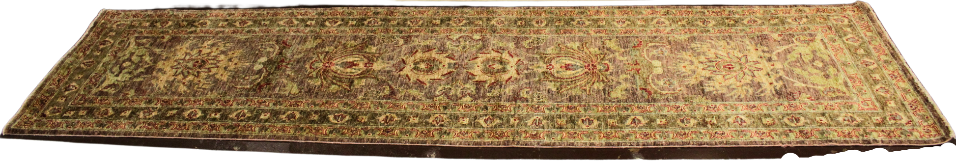 With its regal, earthy tones and grand scale, this Pakistani Oushak runner brings the depth of the forest indoors. A symphony of olive green, moss, and soft brown tones forms the backdrop for palmettes and stylized florals in rich reds, creams, and golds, all set within an elegantly layered border. The medallion motifs across the field feel rooted in tradition, while the saturated palette offers bold contemporary appeal.