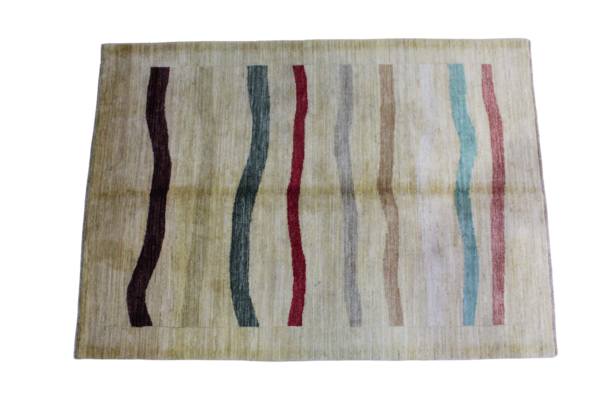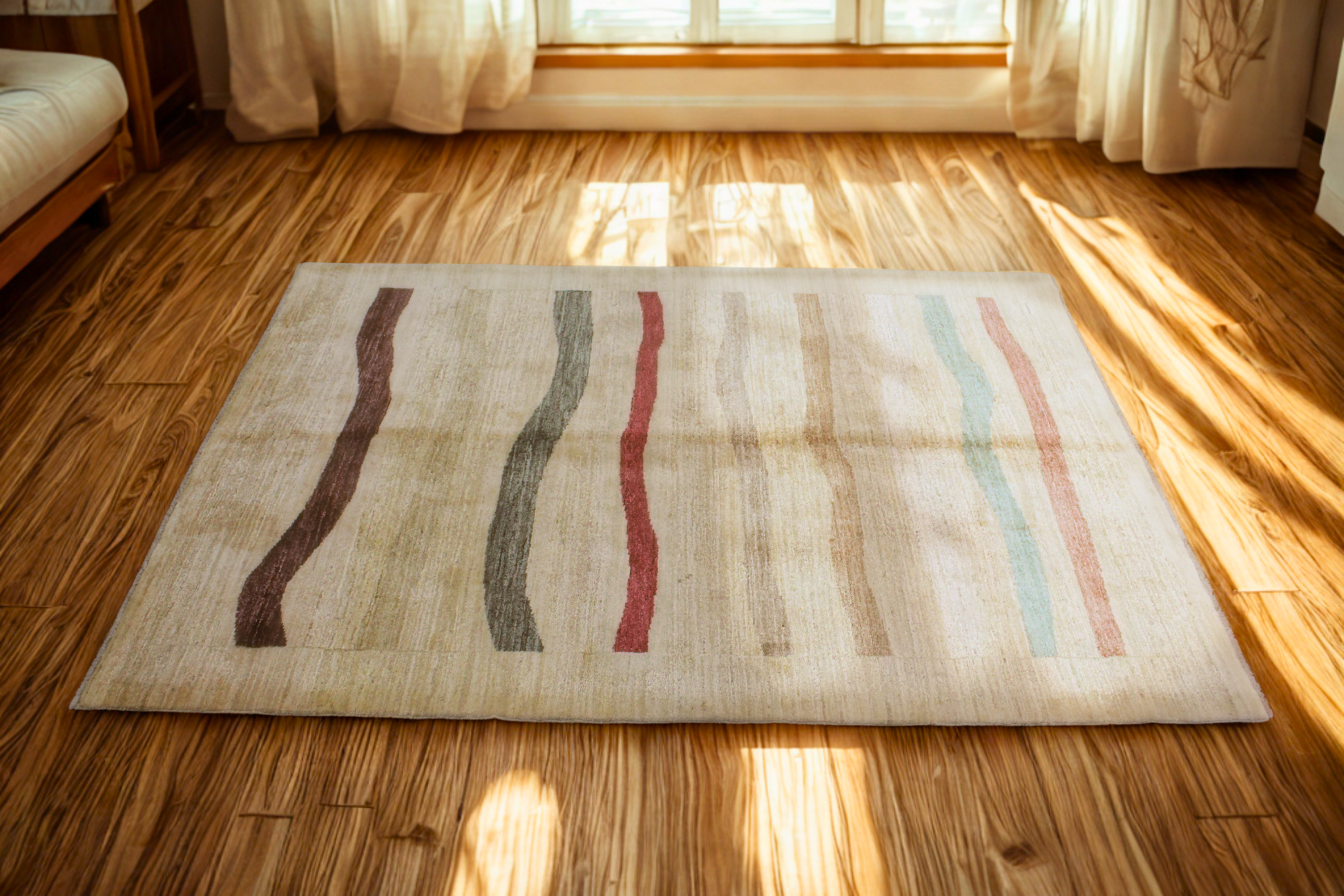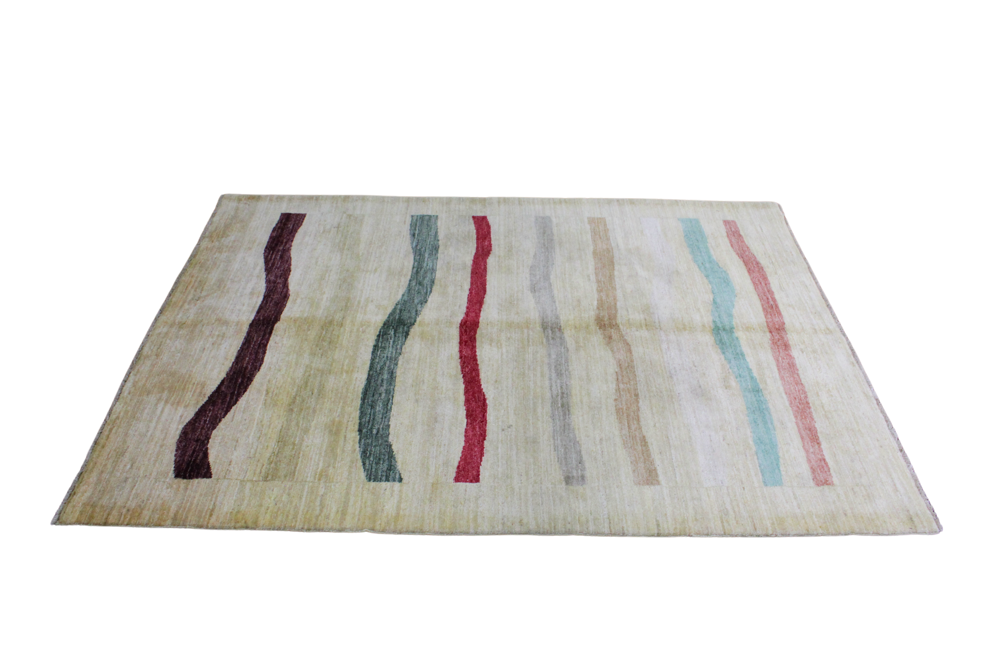 Rug 1942 is a 4.3 x 6 hand-knotted Gabbeh rug from Afghanistan, merging minimalist sensibility with rich cultural artistry. Set on a soft ivory and beige field, the rug features a series of vertical, organically curved stripes in a rainbow of earthy tones—burgundy, forest green, crimson, charcoal, taupe, aqua, and clay red. The playful movement of these stripes adds a modern, artistic energy while preserving the handcrafted warmth that Gabbeh rugs are known for.