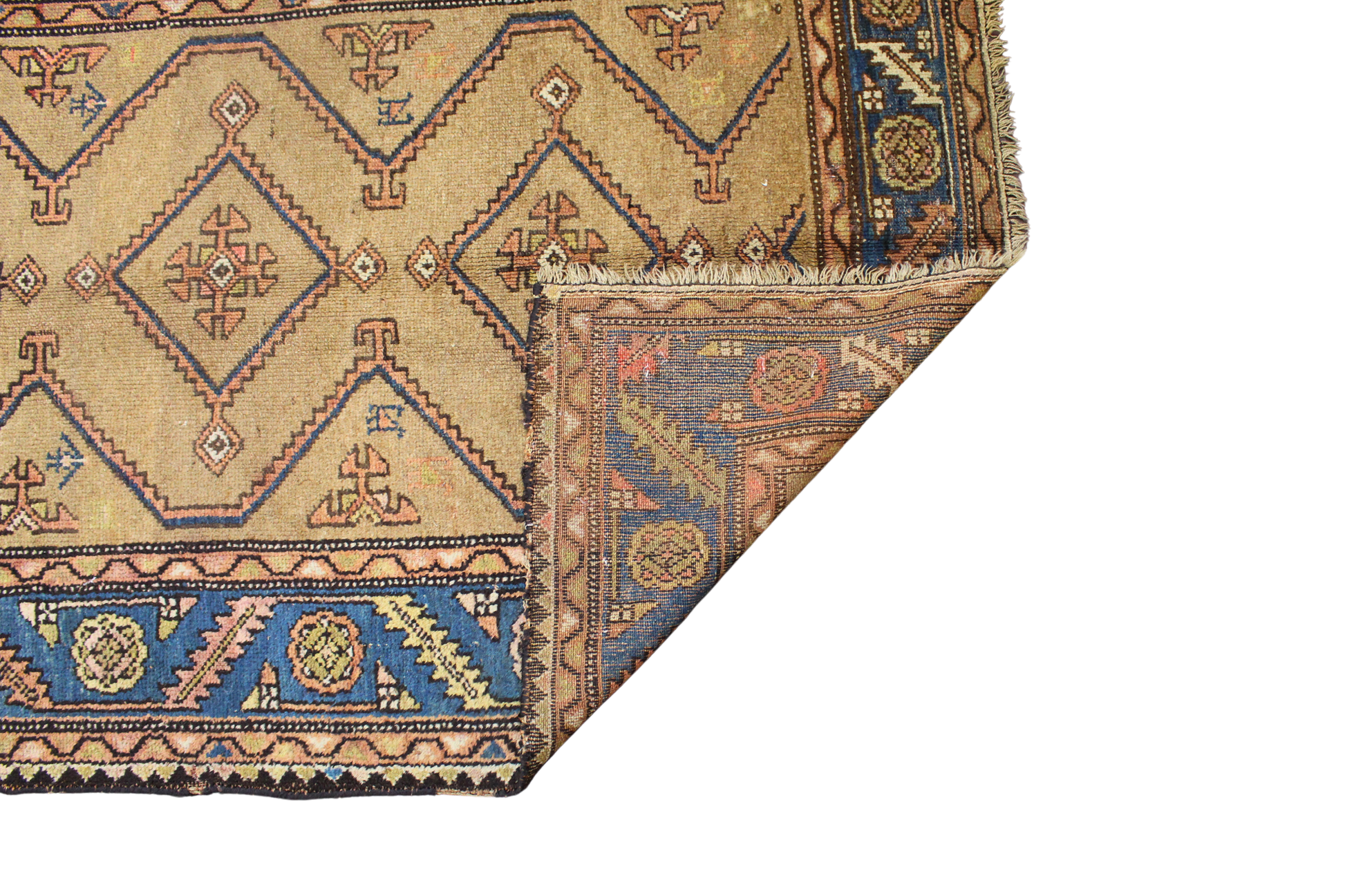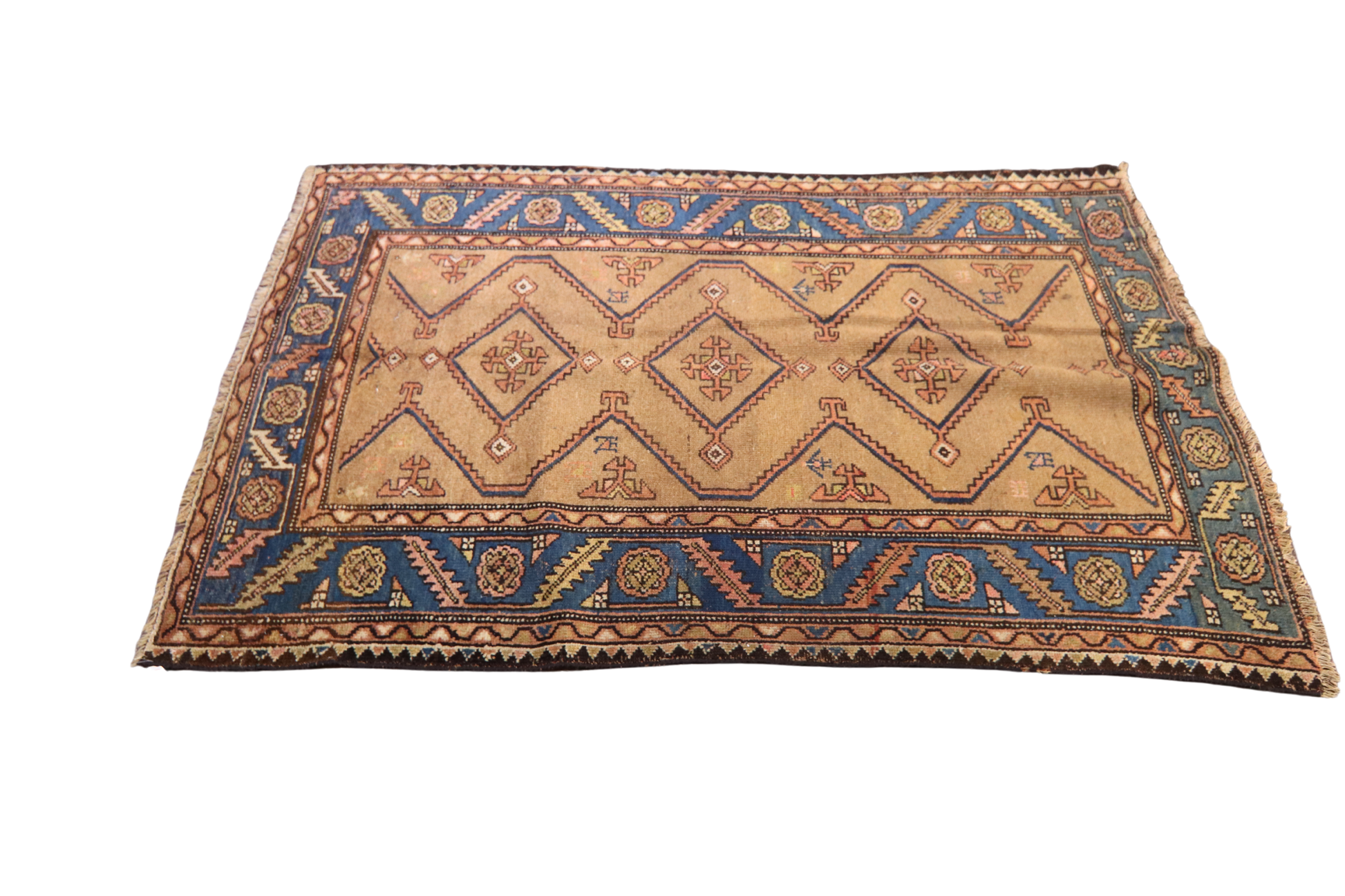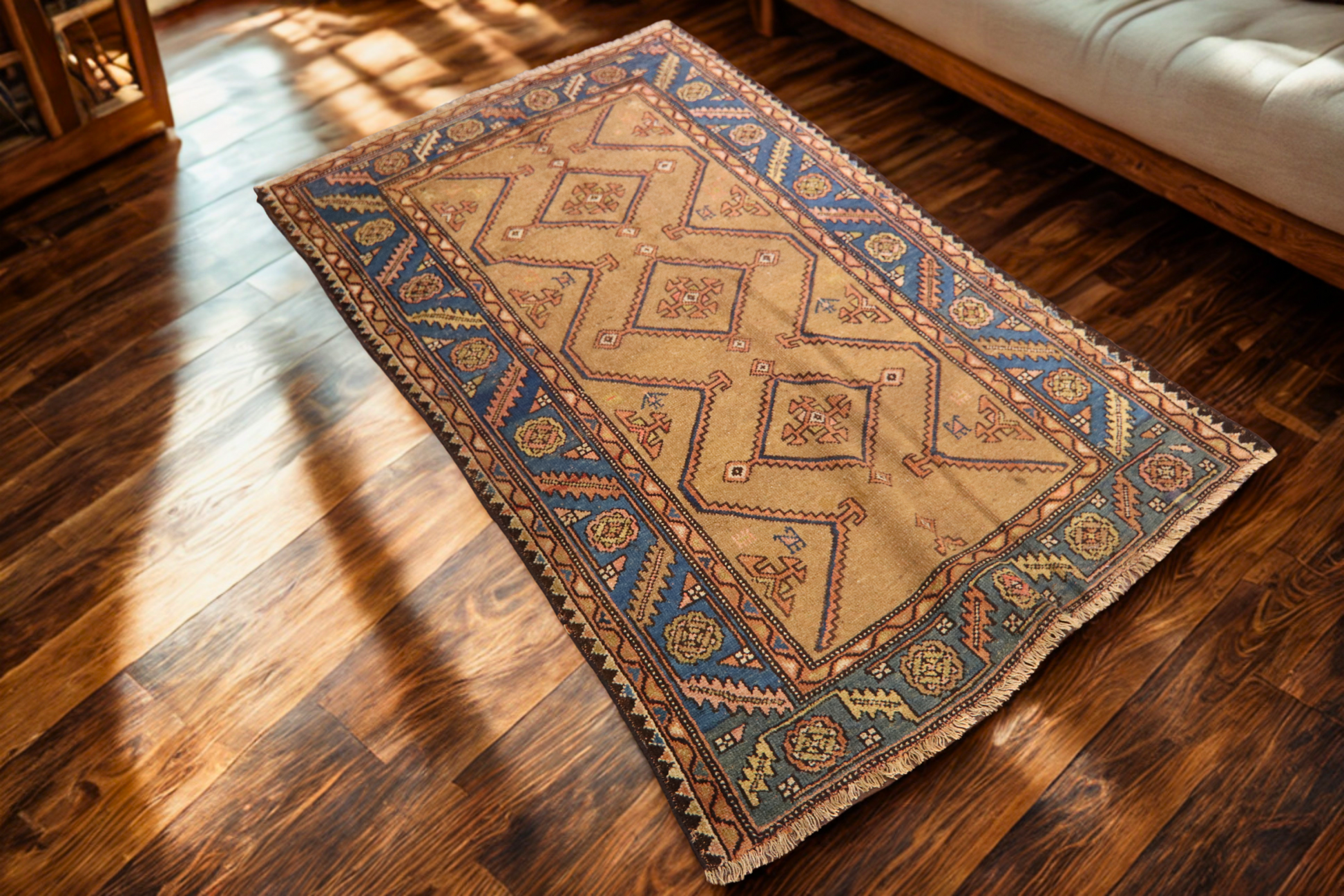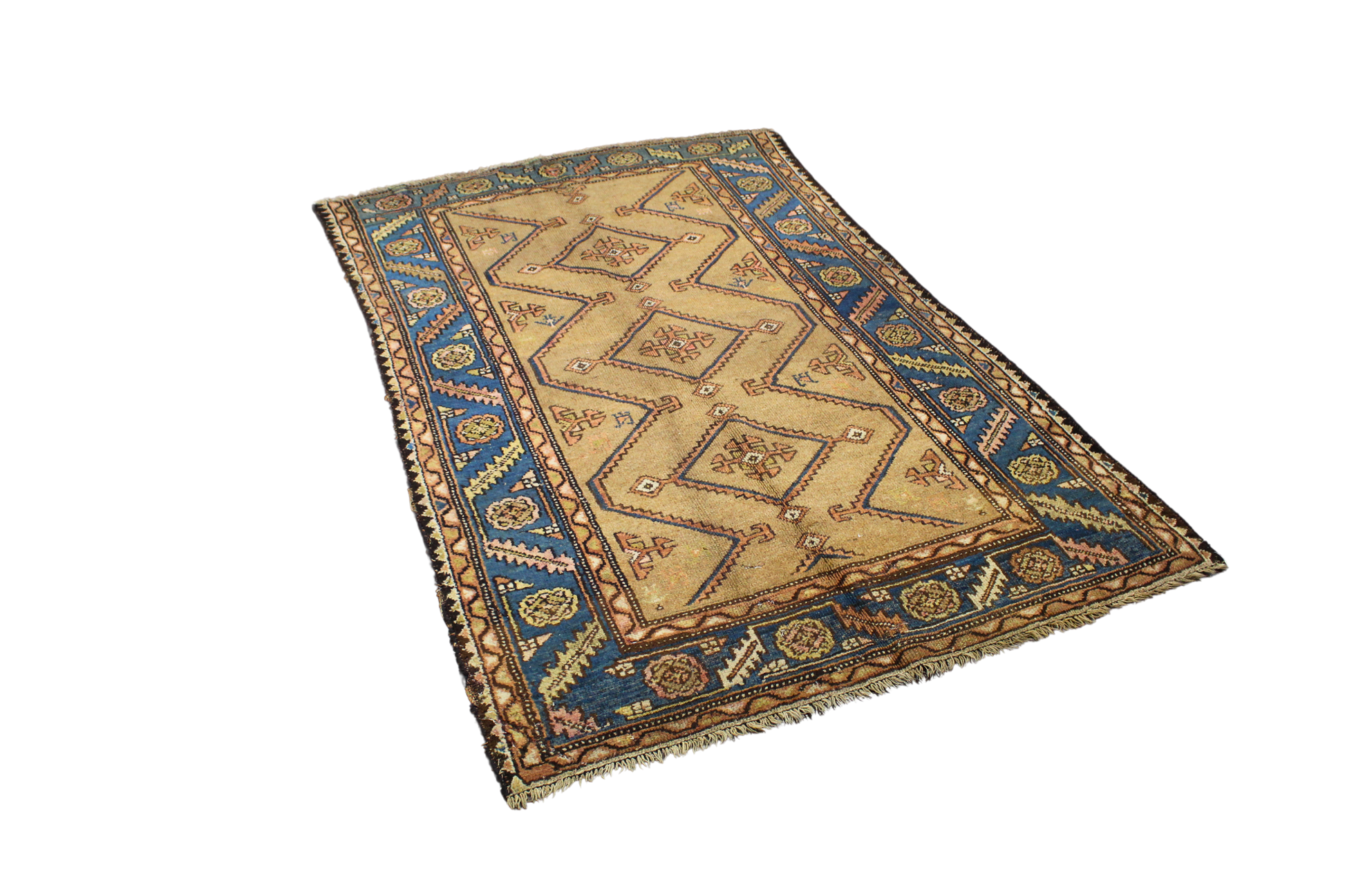 This antique Bidjar rug (3.10 × 5.10 ft) showcases the bold, graphic rhythm that defines tribal Persian weaving. Its central field is arranged with a series of repeating hooked diamonds, each enclosing stylized floral rosettes and tribal glyphs. The camel-toned ground gives the design a rustic warmth, while crisp outlines in indigo and brick red provide sharp contrast.