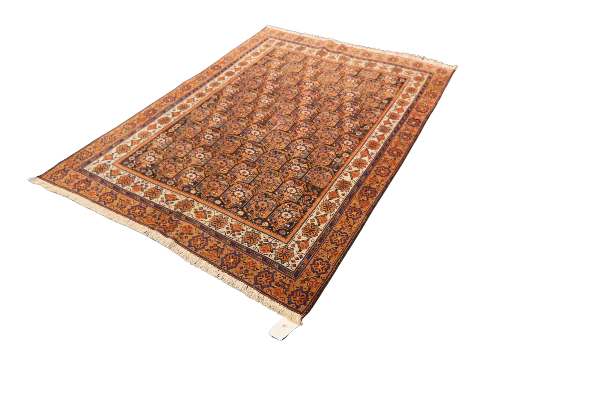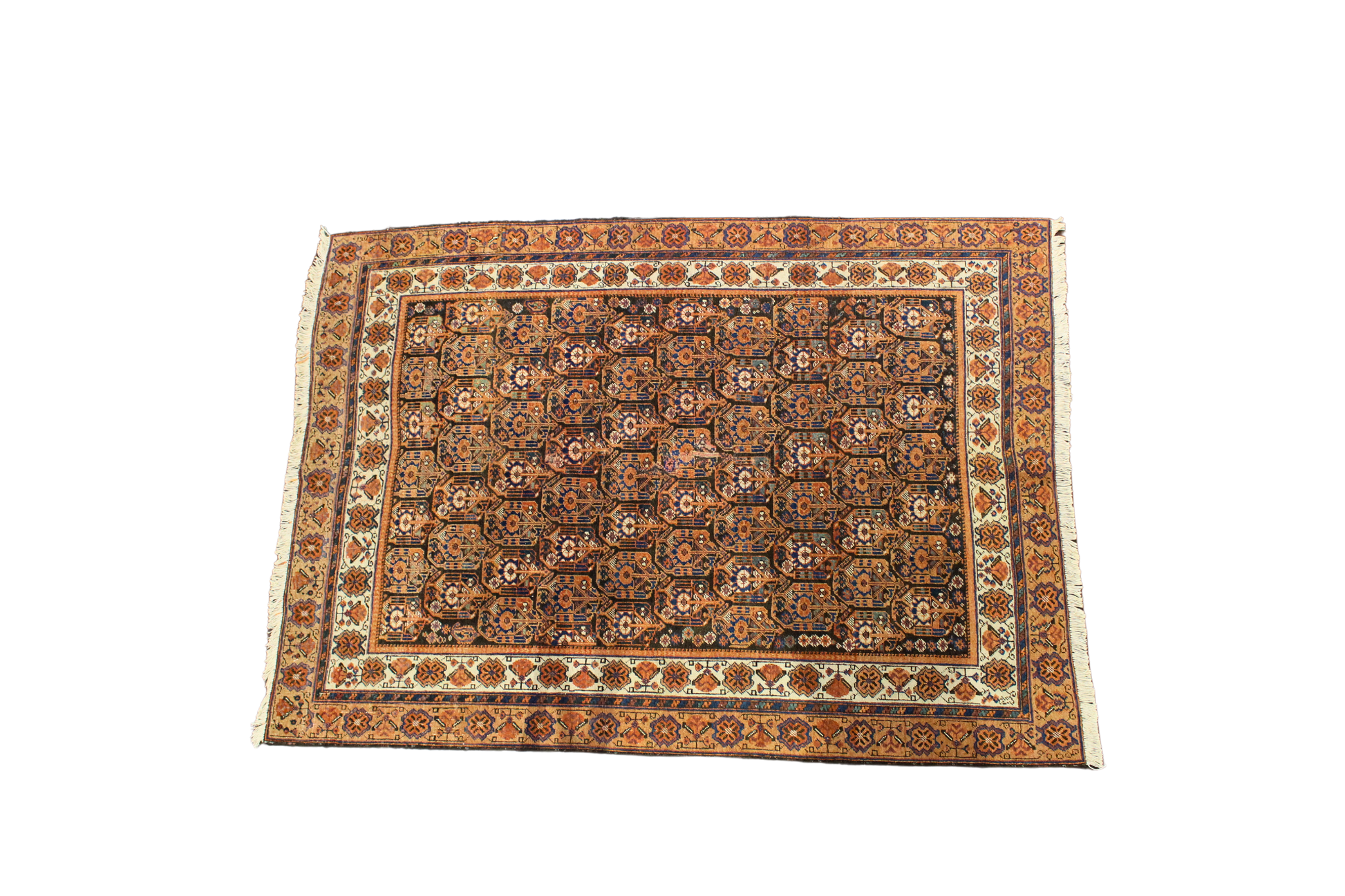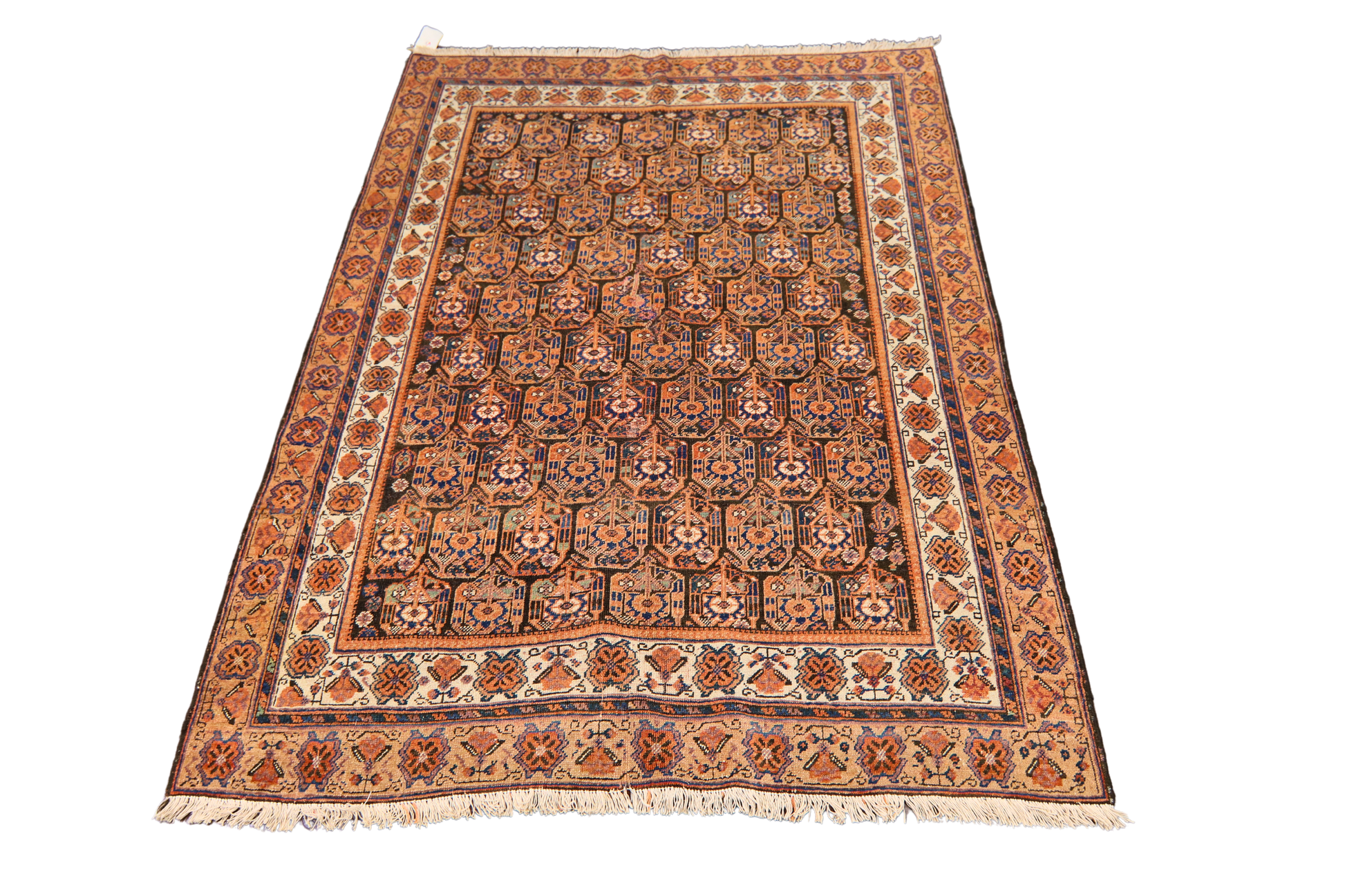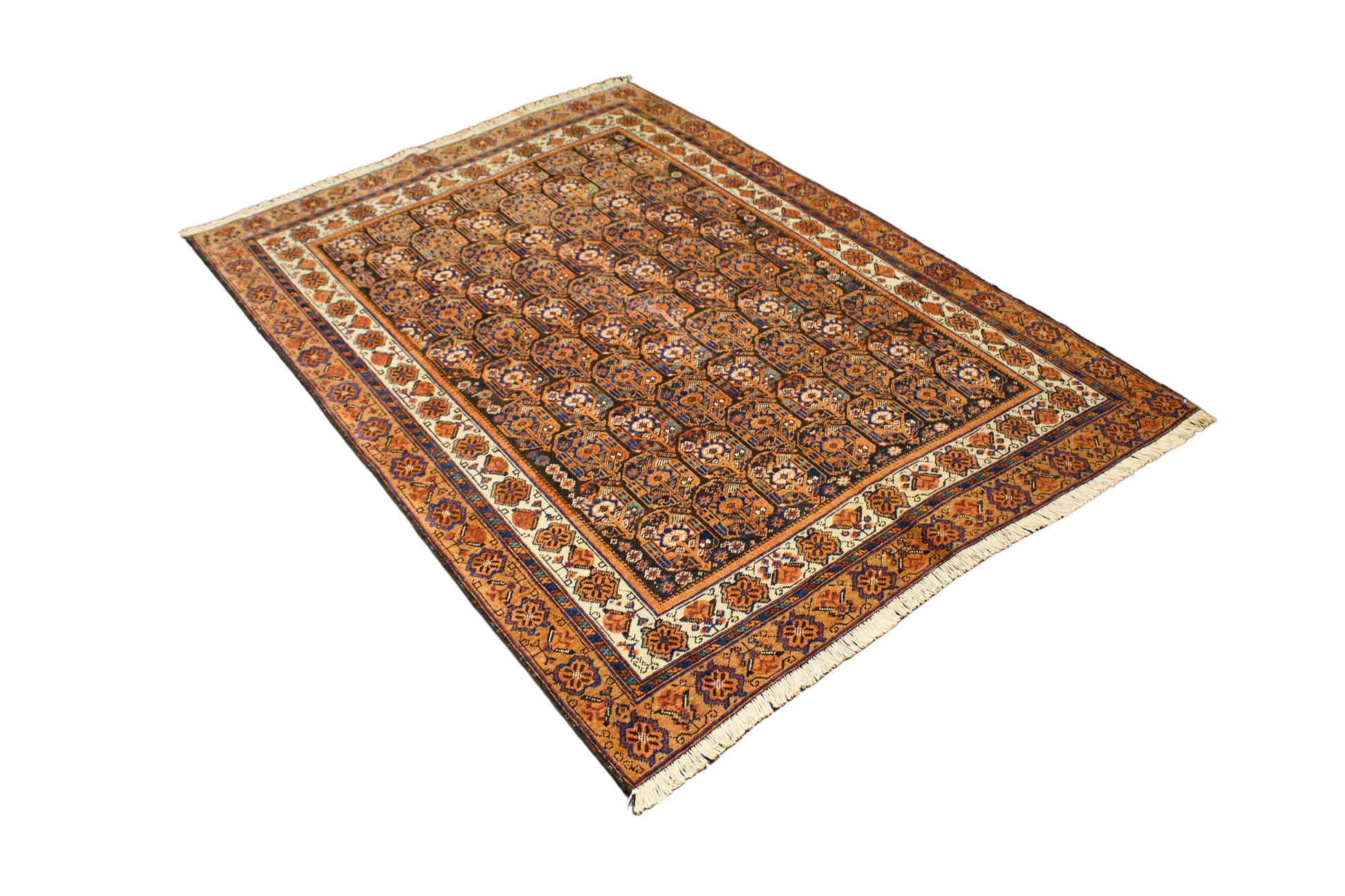 This antique Afshar rug (4.2 × 5.7 ft) is a visual symphony of balance and repetition. Its field is meticulously patterned with a grid of octagonal motifs — each housing rosettes and floral cross forms — creating a hypnotic rhythm that speaks to the precision of tribal craftsmanship. Set against a deep brown field, the palette of terracotta, ivory, navy, and soft rust adds richness and warmth.