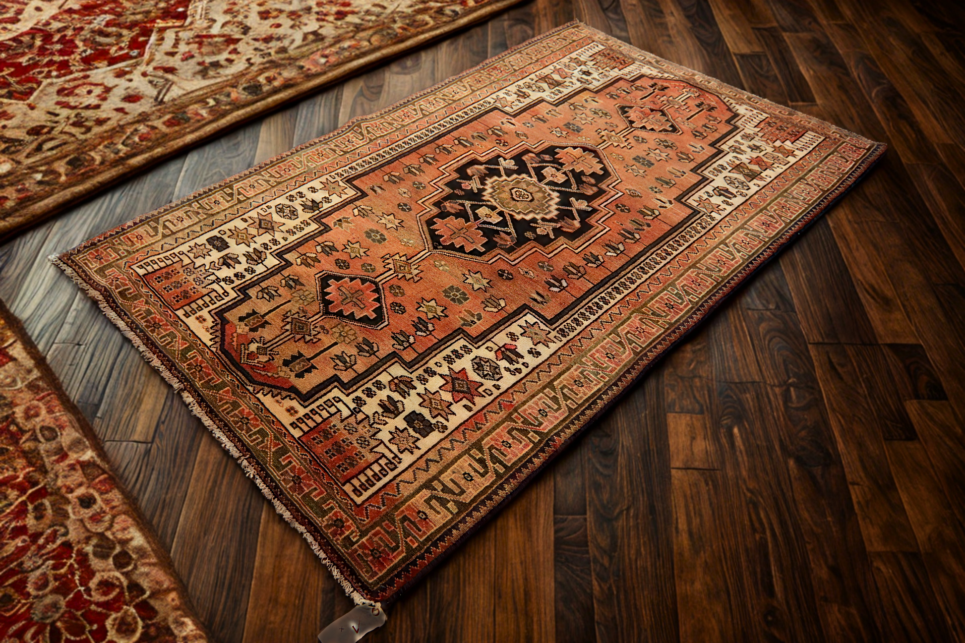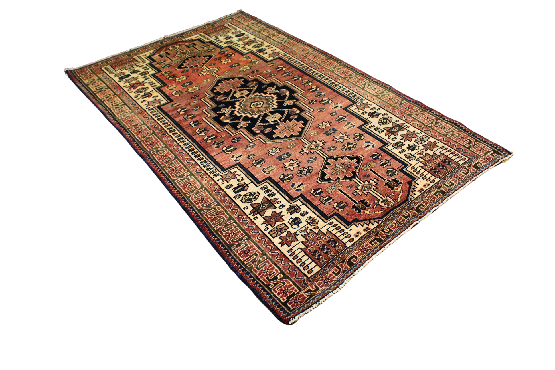 Bold yet balanced, this antique Malayer rug (4.2 × 6.6 ft) commands attention with its geometric layout and earthy color story. A midnight blue central medallion, intricately drawn with stepped floral and tribal motifs, sits against a warm rust-red field dotted with angular vines and stylized blossoms. The ivory spandrels and borders frame the composition with precision, featuring rows of geometric stars, tiny floral symbols, and serrated leaves in deep blue, green, and camel tones.