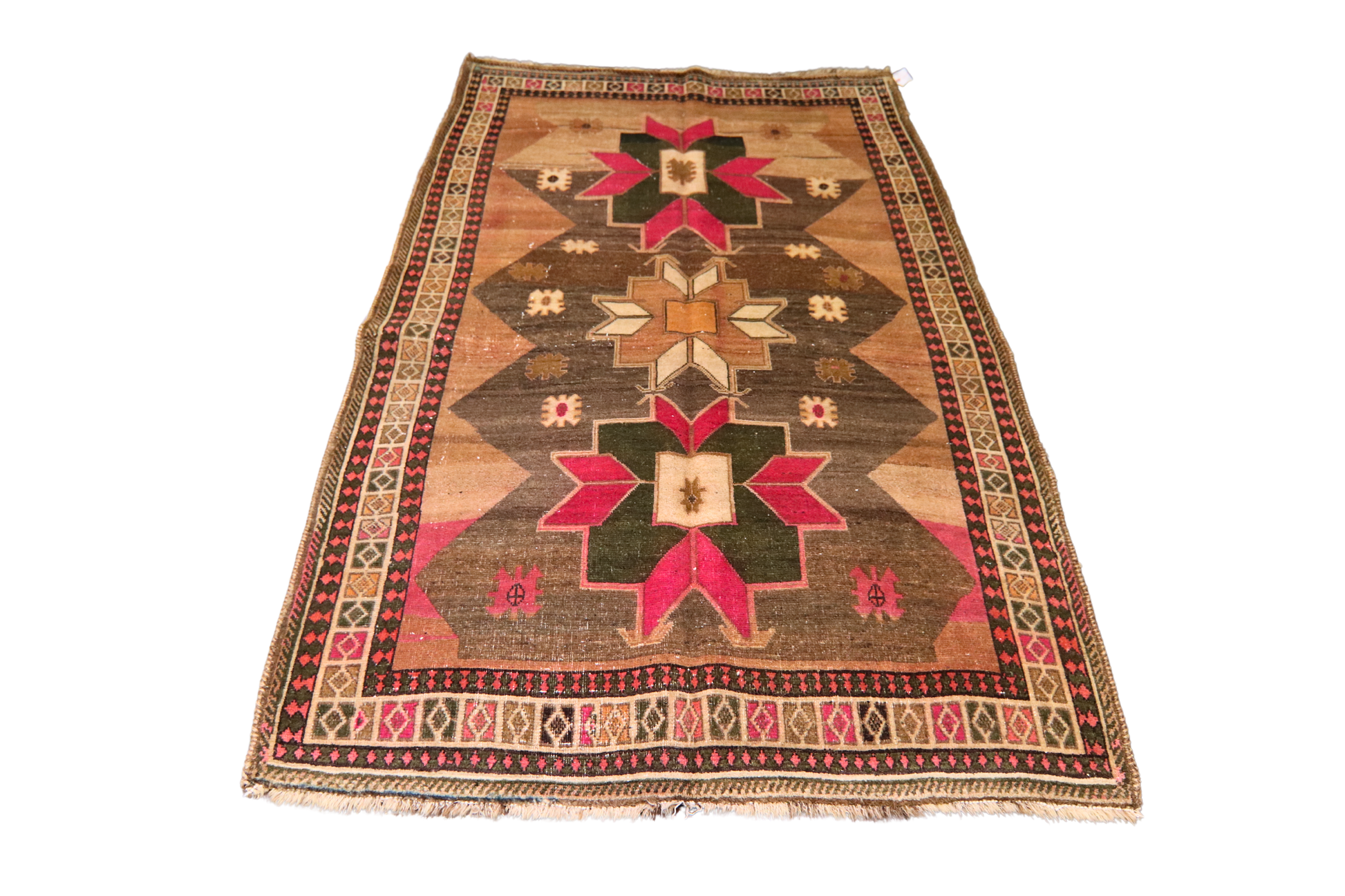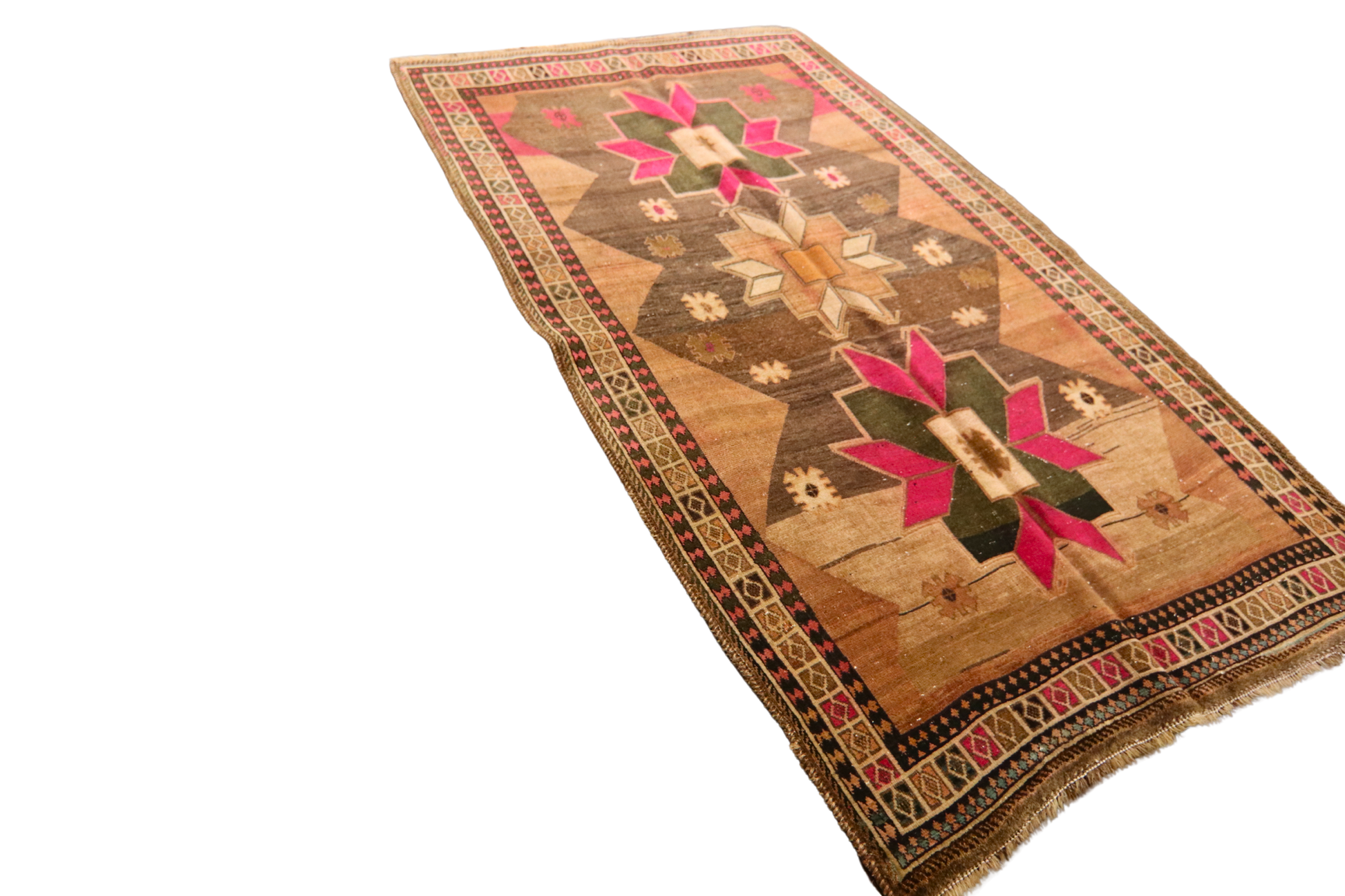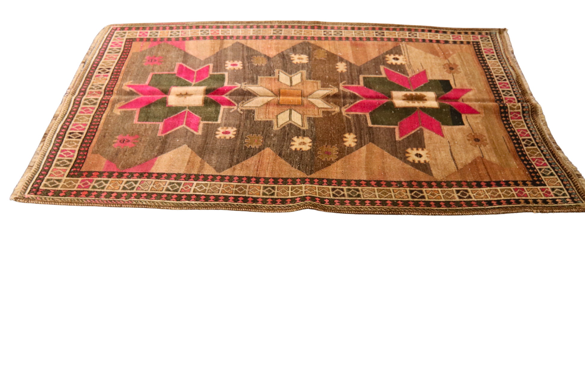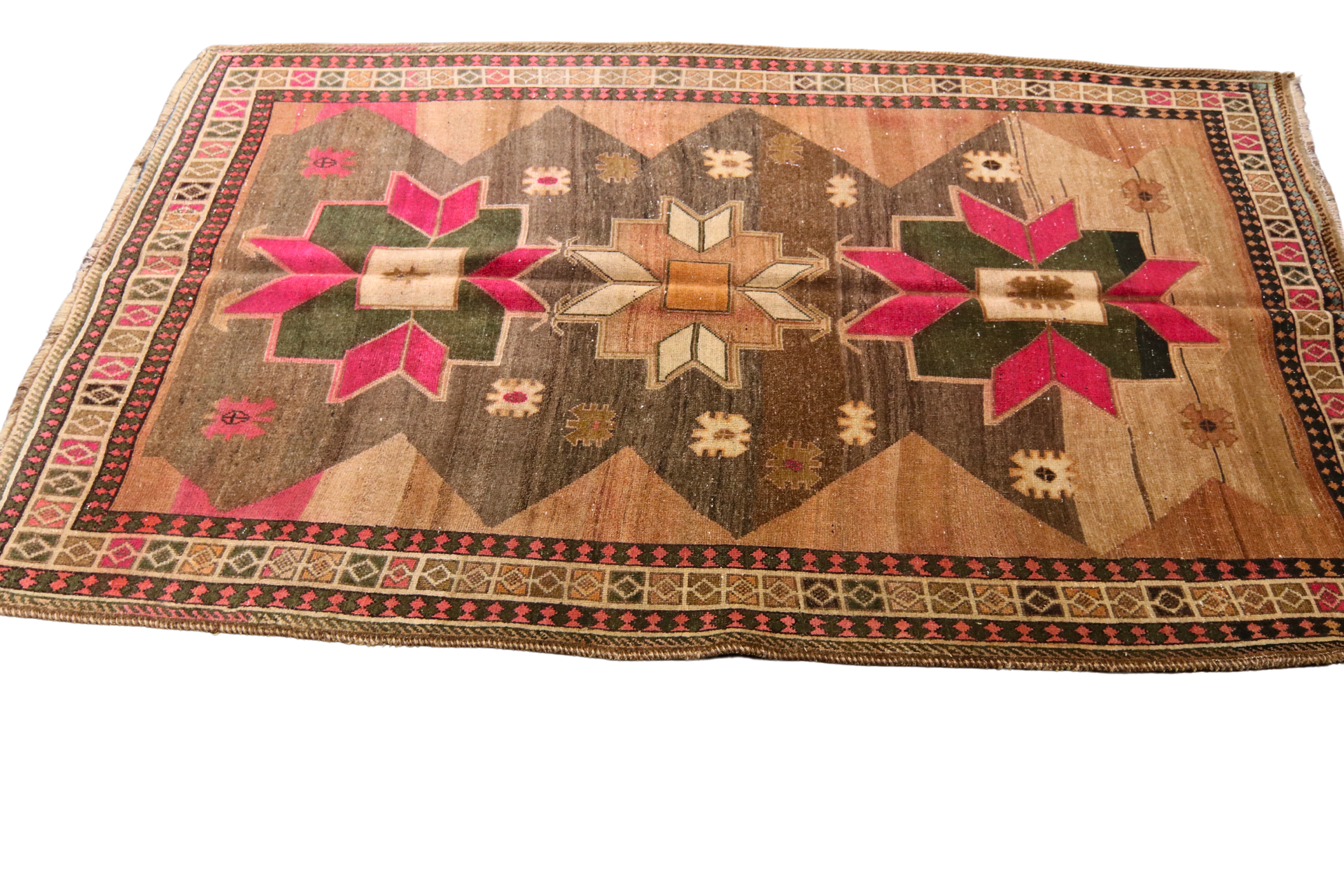 This striking antique Turkish Oushak rug (4.6 × 6.6 ft) is a masterclass in tribal geometry and saturated color. The field pulses with dynamic diamond medallions and oversized eight-pointed stars in vivid fuchsia, deep moss green, and sandy camel — all set against a naturally striated brown field that evokes hand-dyed wool aged over time.