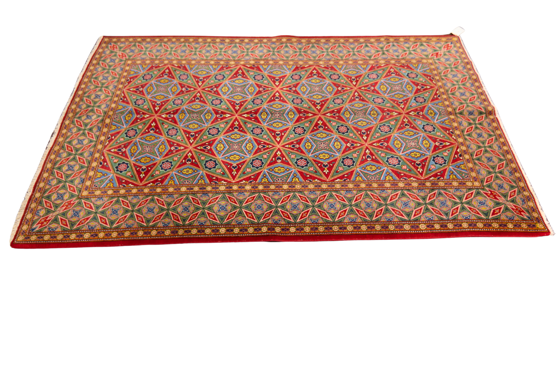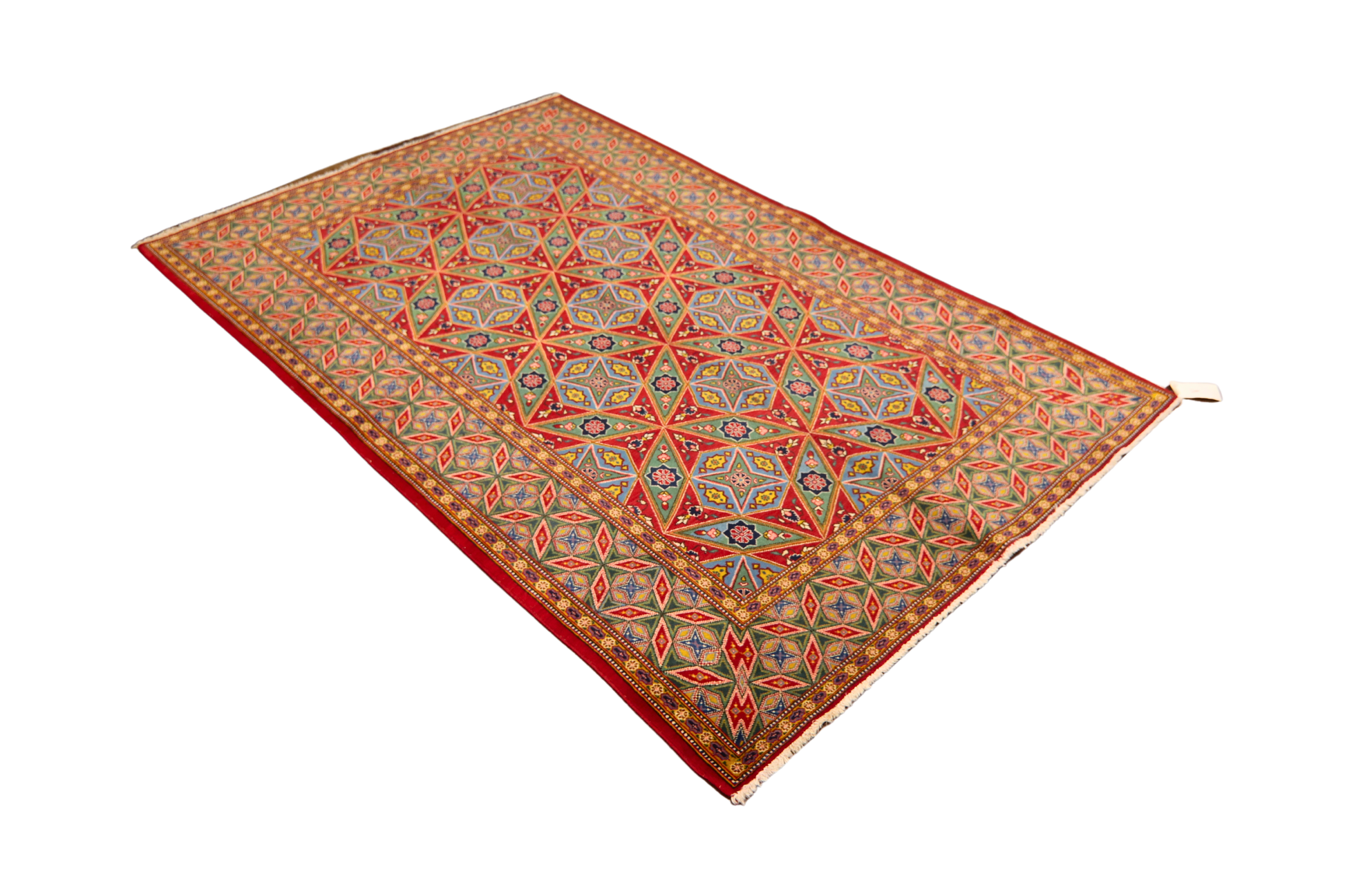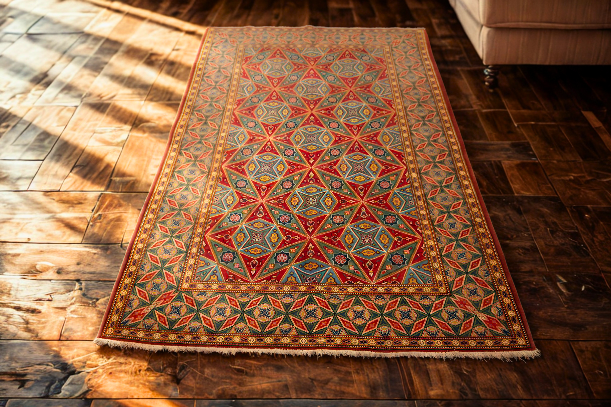 A strong red lattice anchors the design, filled with alternating stars and rosettes in a mesmerizing symmetry that feels almost regal. The detailed borders echo the geometry of the field, creating a bold frame that intensifies the visual energy of the rug.
