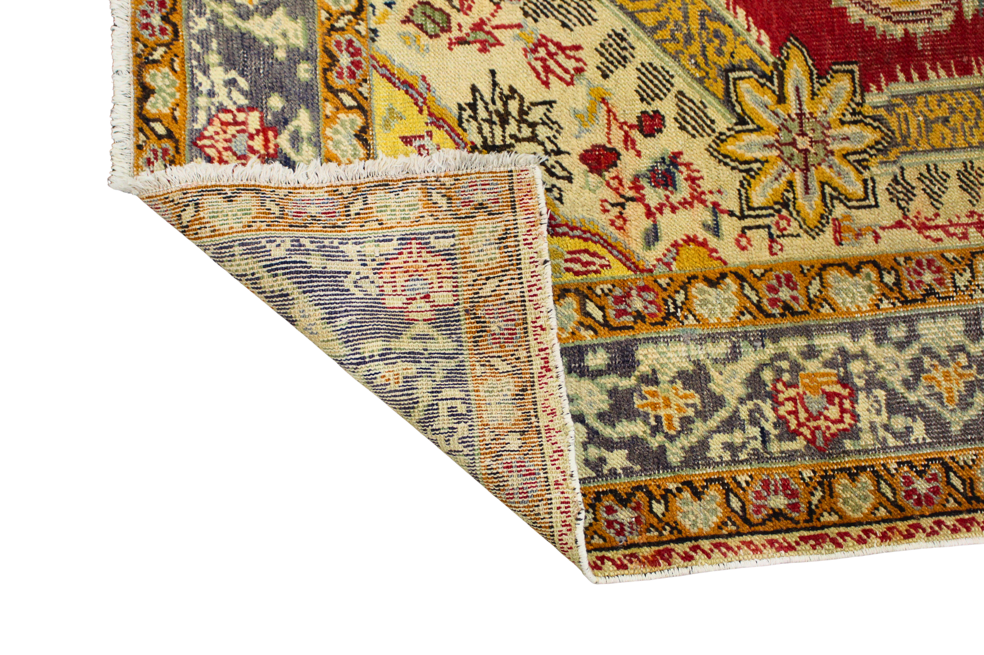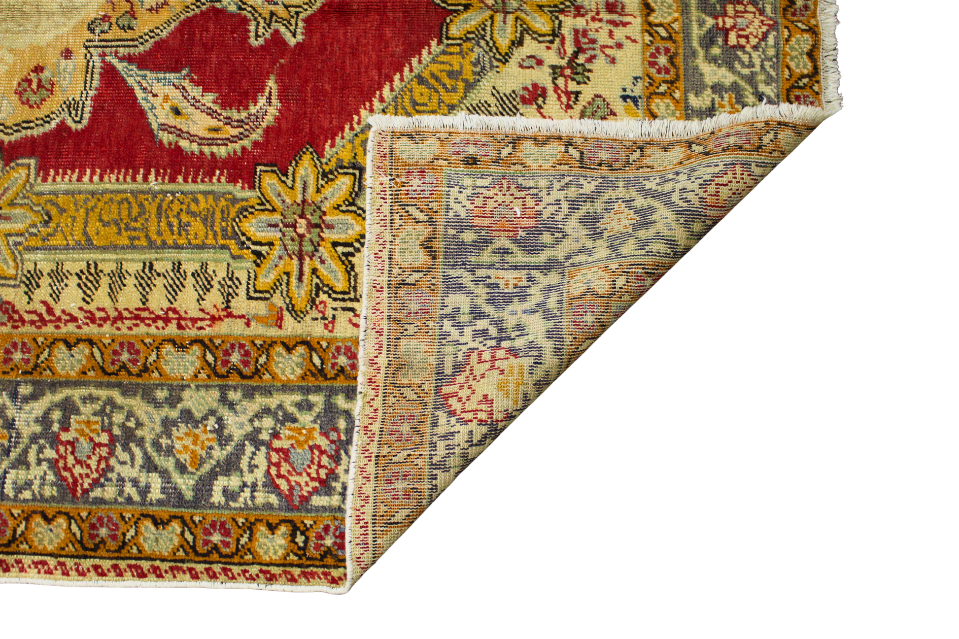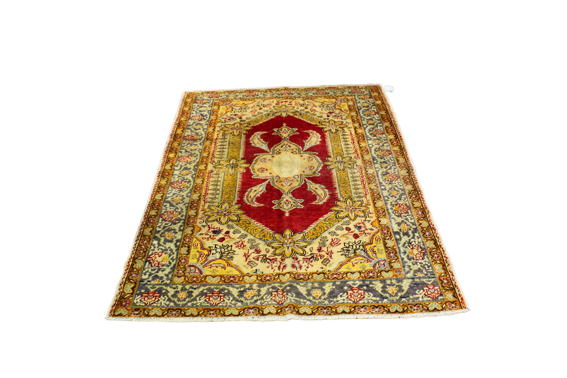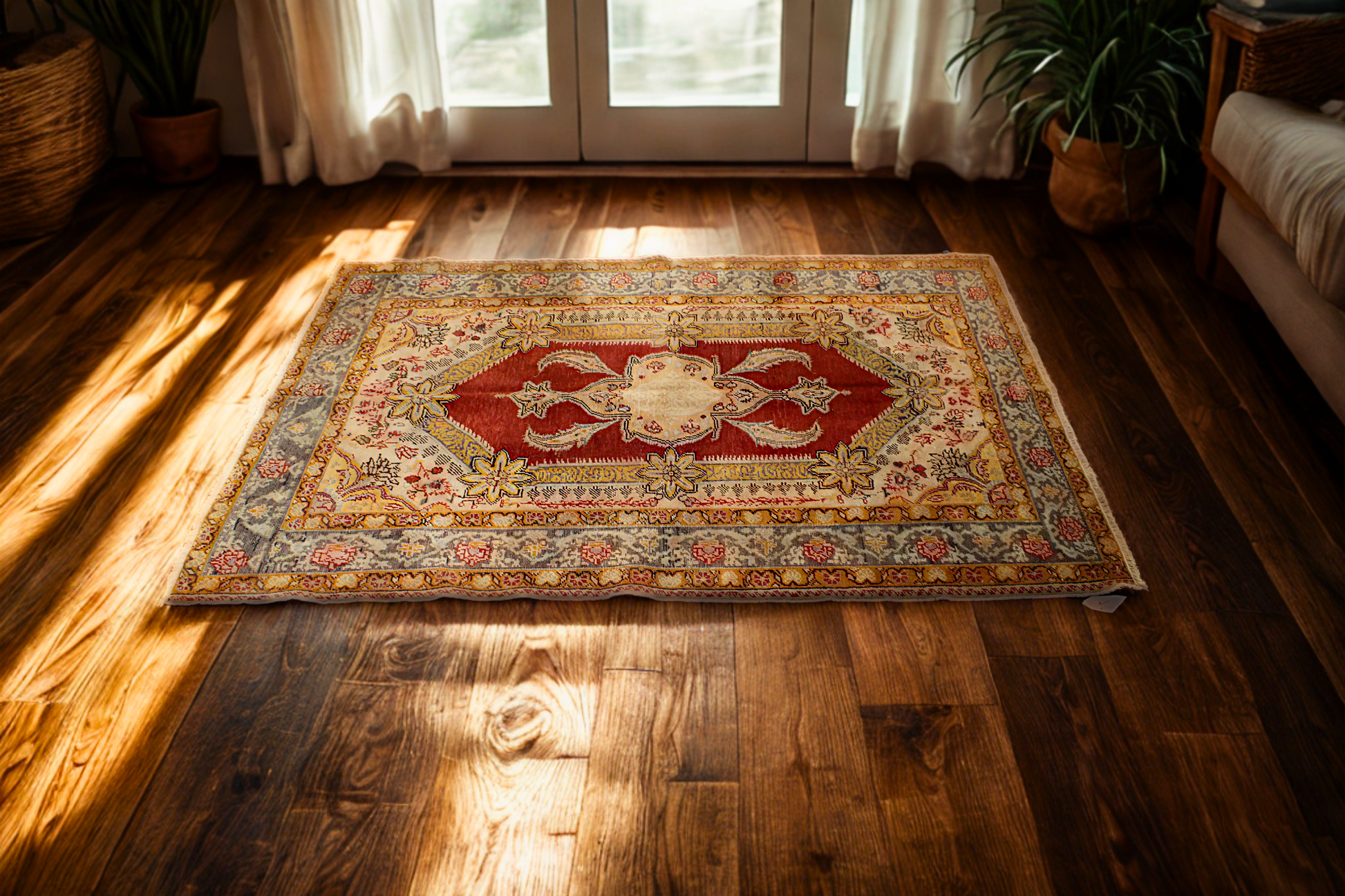 This Turkish Oushak rug (4.3 × 5.10 ft) is a radiant display of classical Anatolian design, bursting with warm, uplifting hues and iconic floral forms. At its heart lies a dramatic medallion with stylized palmettes and scrolling leaves, set against a vivid crimson red field. Pale gold and soft ivory surround the central medallion, adding lightness and visual contrast.