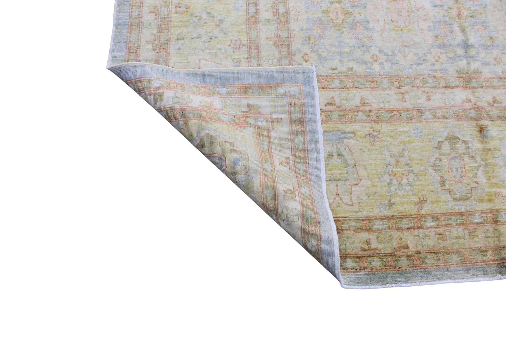 Washed in delicate hues that seem kissed by desert light and open skies, this grand Afghan Oushak rug (11.2 × 15 ft) embodies a quiet, timeless beauty. The design unfolds in a harmonious lattice of floral medallions and rosettes, woven in soft pastels of celadon blue, faded coral, and sandy ivory. Its subtle abrash and gracefully muted tones lend the piece an antique sensibility, ideal for interiors that favor elegance without excess.