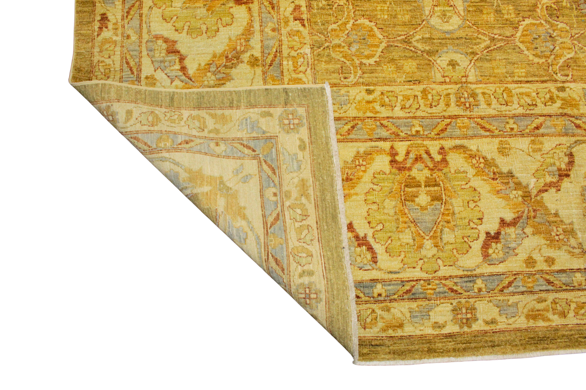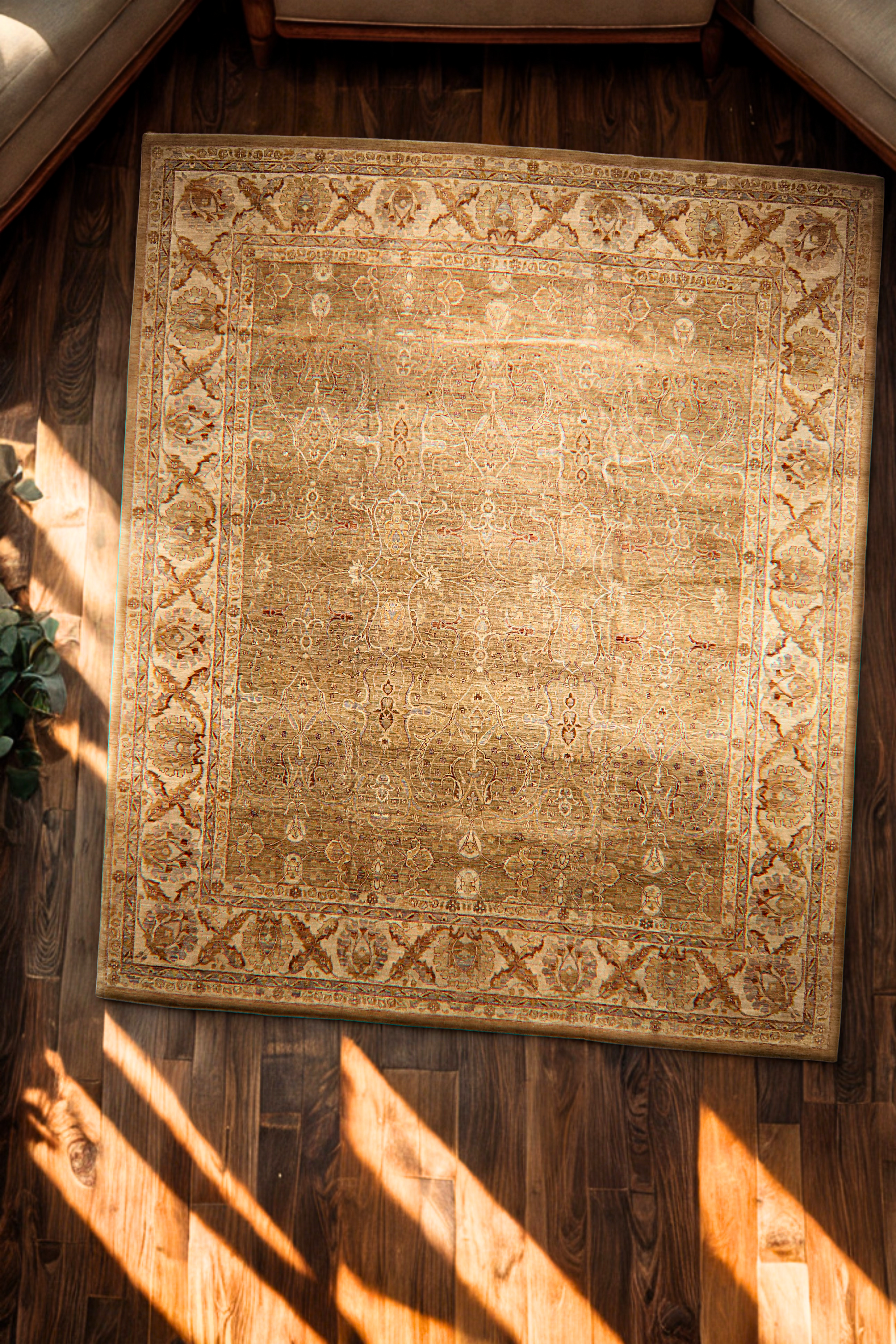 Regal and refined, this grand Afghan Tabriz rug (12.4 × 15.3 ft) radiates a quiet opulence. Its rich, golden-olive field is adorned with an intricate floral arabesque — a delicate interplay of stylized palmettes, curving tendrils, and lattice-like symmetry. The expansive border, woven in soft celadon and honey tones, frames the composition like architectural molding, giving the rug a stately presence.