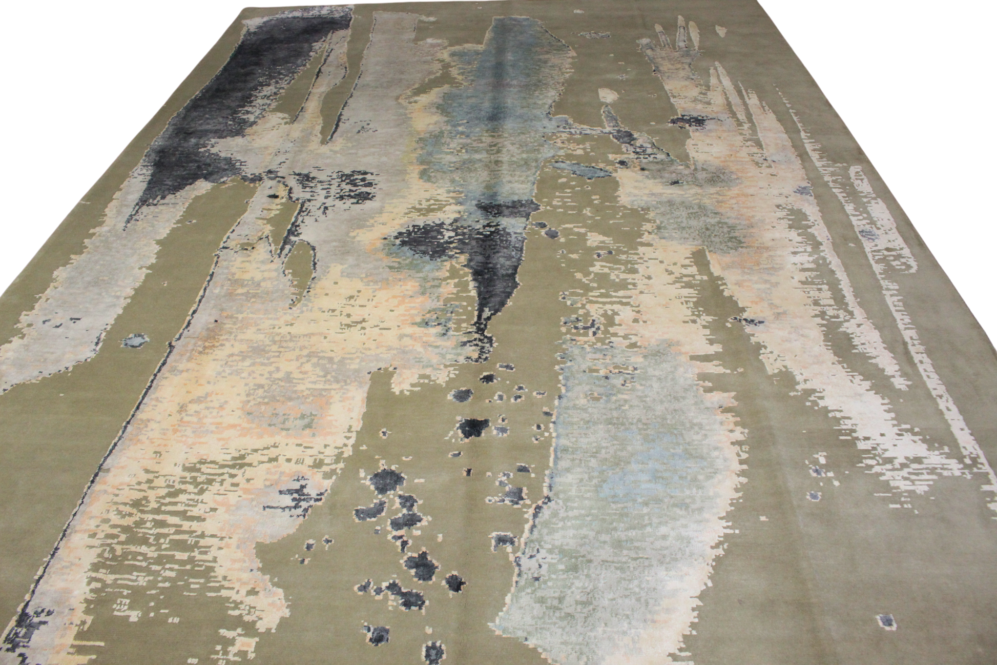 A bold stroke of contemporary sophistication, this striking 10 × 14 ft rug from India channels the energy of abstract expressionist art. Like a painted canvas, its sweeping horizontal brushstrokes seem to drift across the surface — layered in smoky blue, ivory, ash, and faded graphite over a cool olive-beige ground. The composition suggests motion and mood, evoking cloudscapes, shifting water, or textured walls.