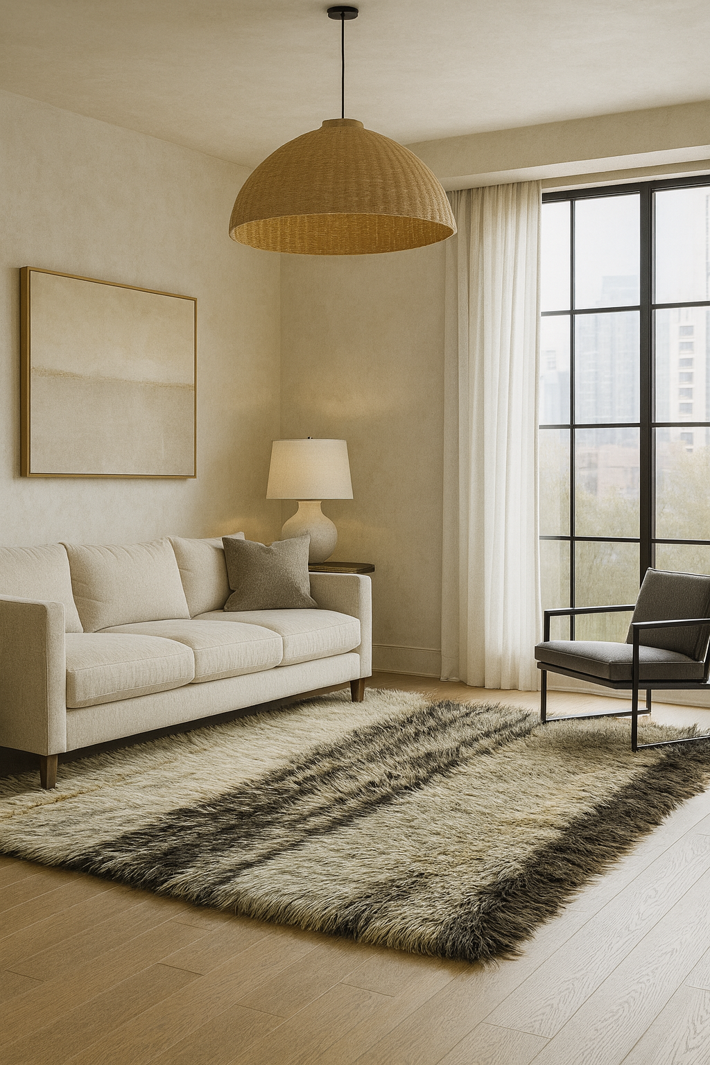 Its irregular stripe pattern gives the impression of organic movement, almost like windswept reeds or cascading rain. The high-pile wool lends not only visual richness but also an irresistibly soft hand underfoot, making it perfect for relaxed, barefoot living.