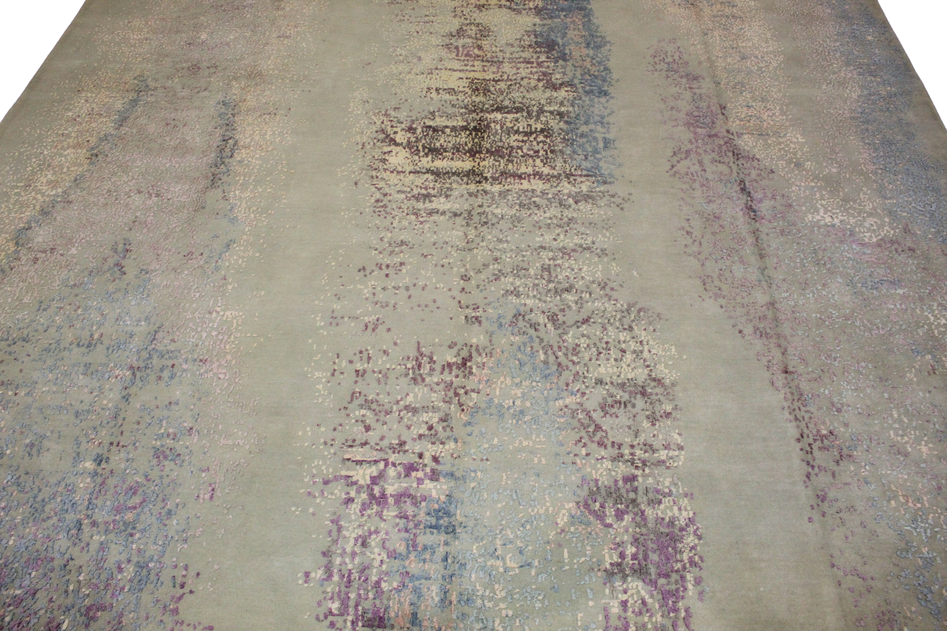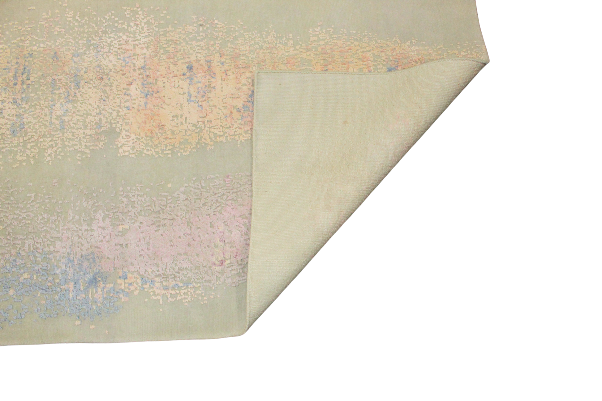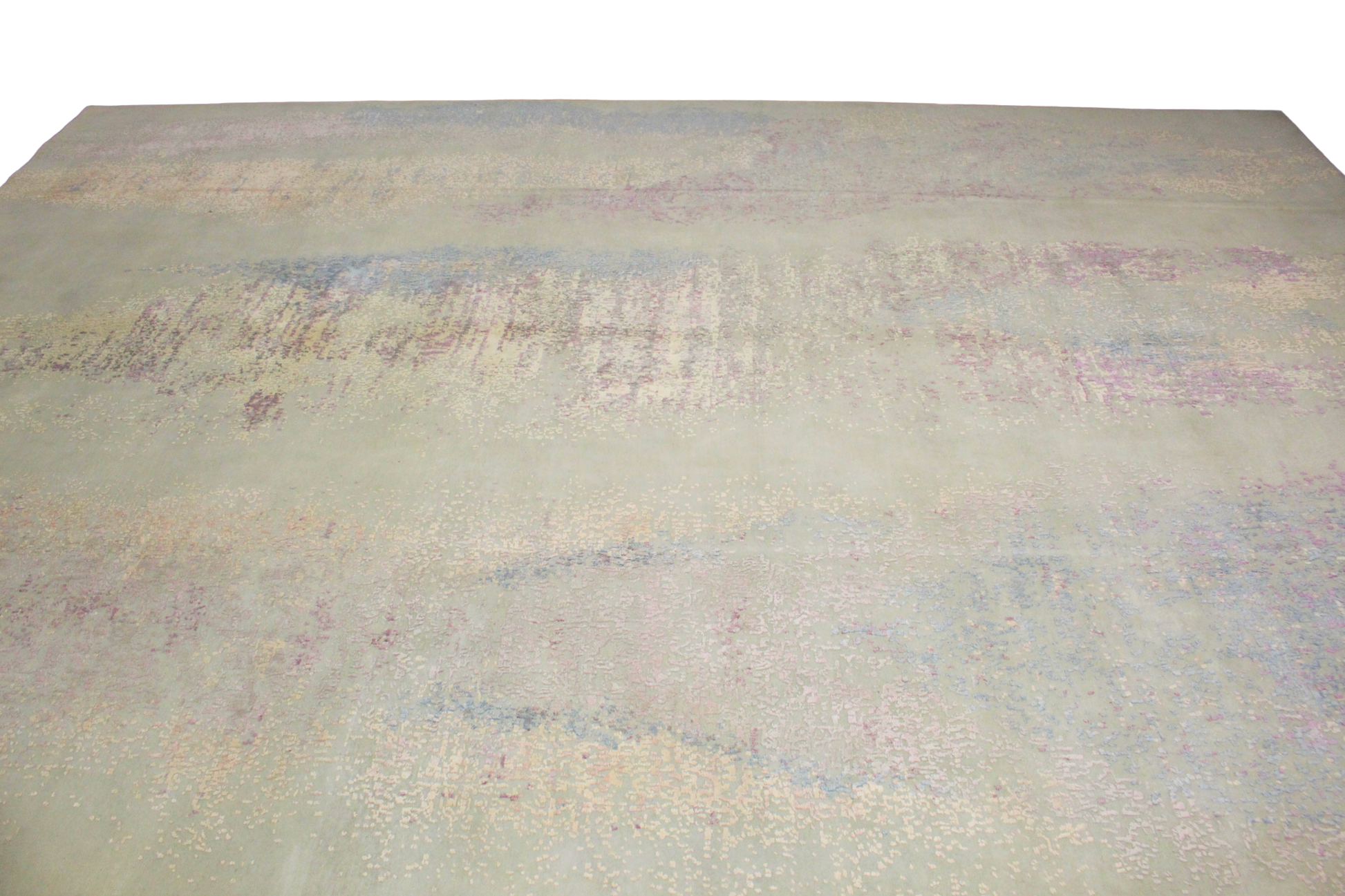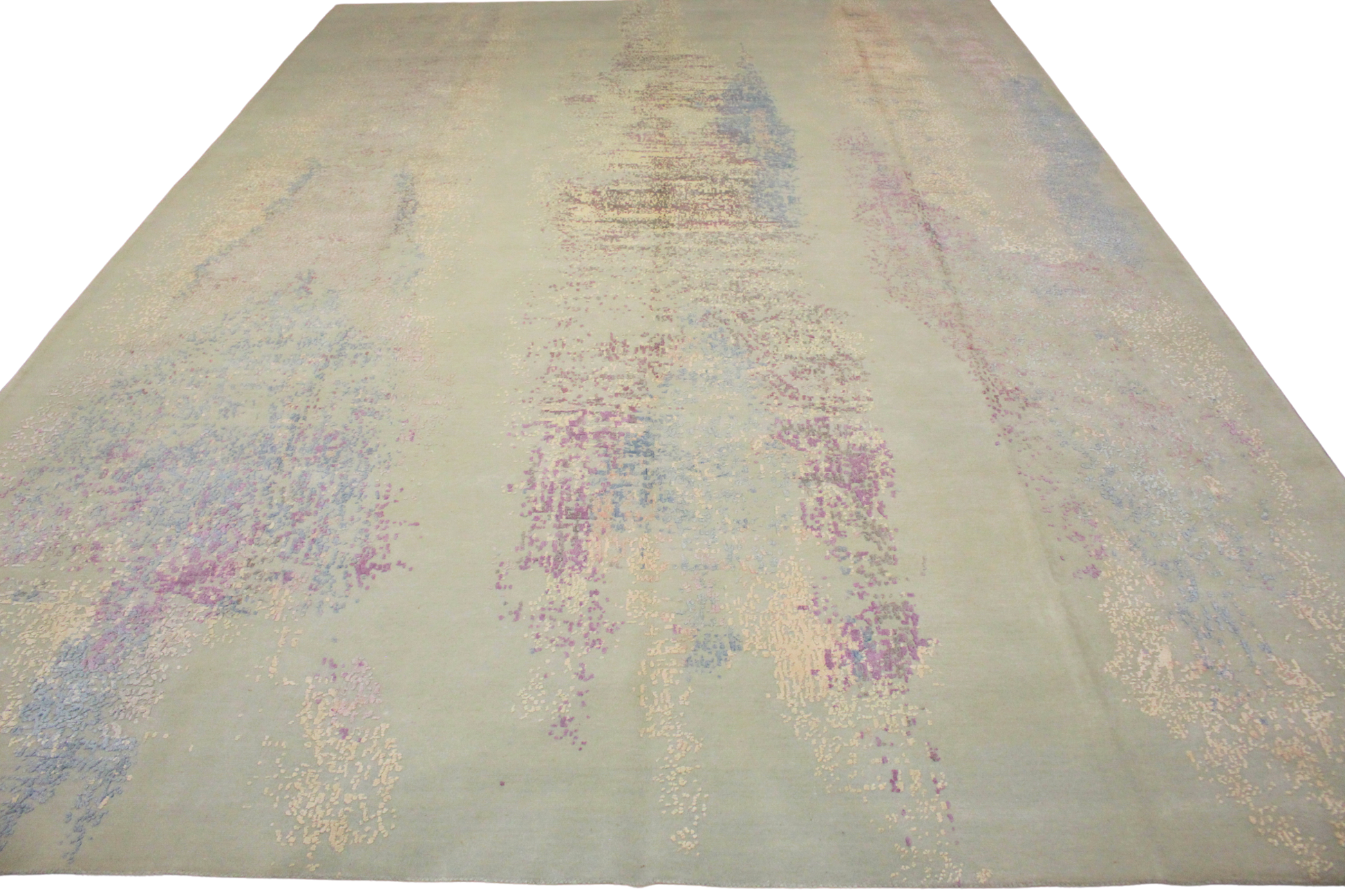 Like watercolor on silk, this expansive modern rug from India (10 × 14.3 ft) evokes a dreamlike softness through its serene palette and abstract design. Muted strokes of lavender, powder blue, blush, and silvery cream melt into a gentle ivory ground, creating a visual rhythm that feels both airy and ethereal. The vertical painterly streaks seem to drift across the surface, giving the piece movement without overwhelming its calm demeanor.