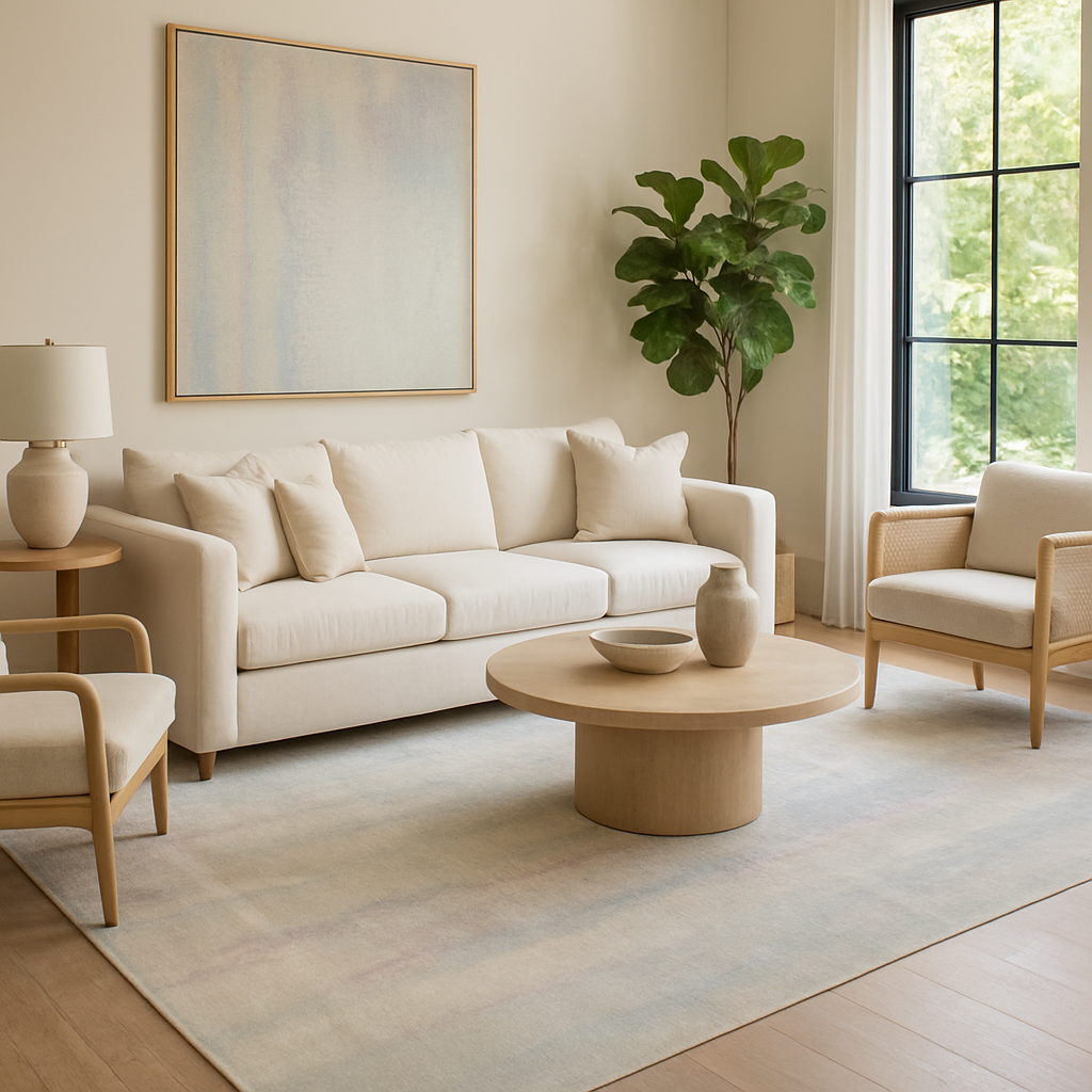 This oversized rug makes an elegant statement in large open spaces — perfect for grounding a minimalist living room, serene master suite, or a designer loft. Despite its contemporary style, the subtle play of color and texture allows it to blend seamlessly with transitional or even organic-modern interiors.