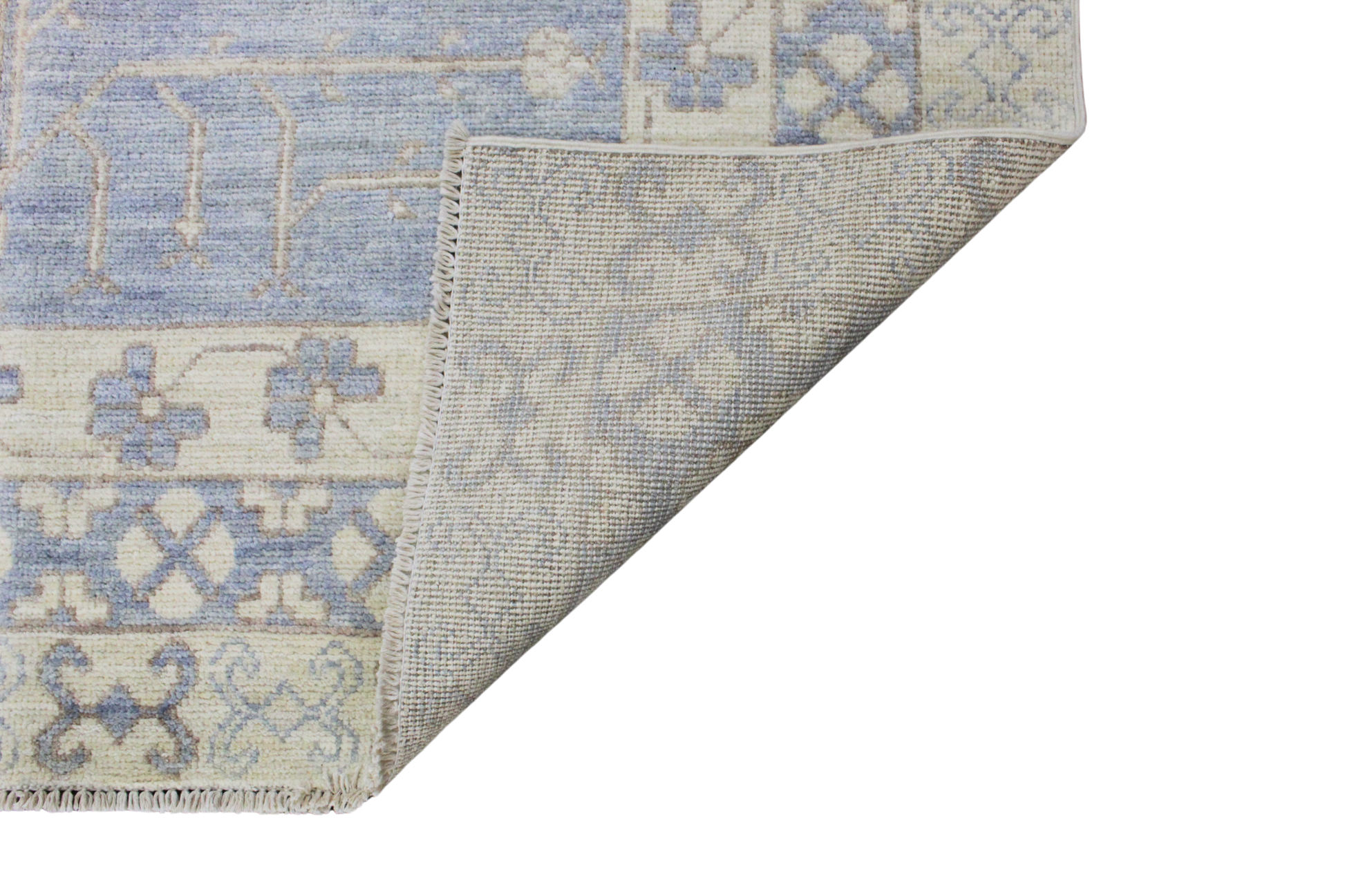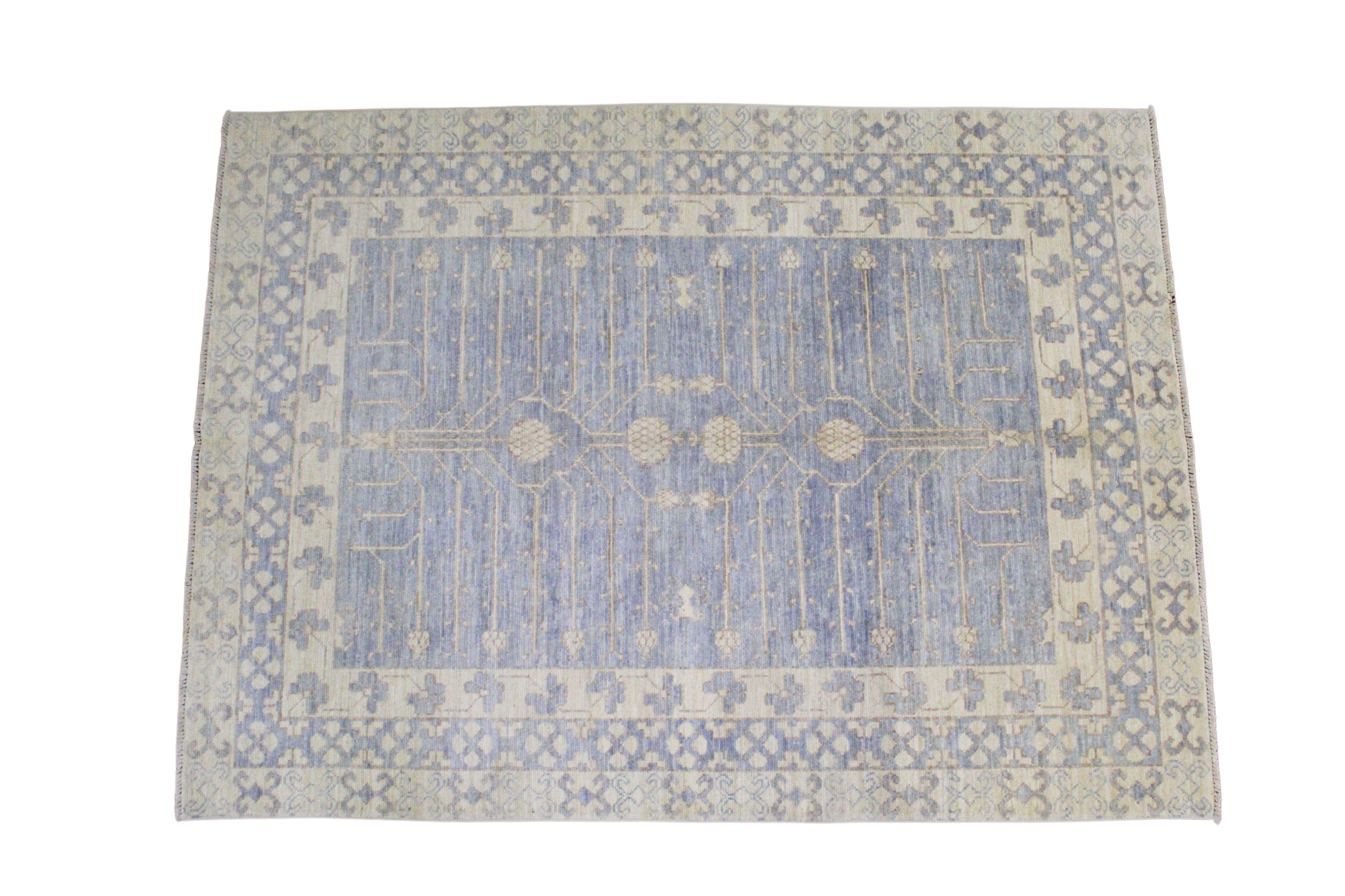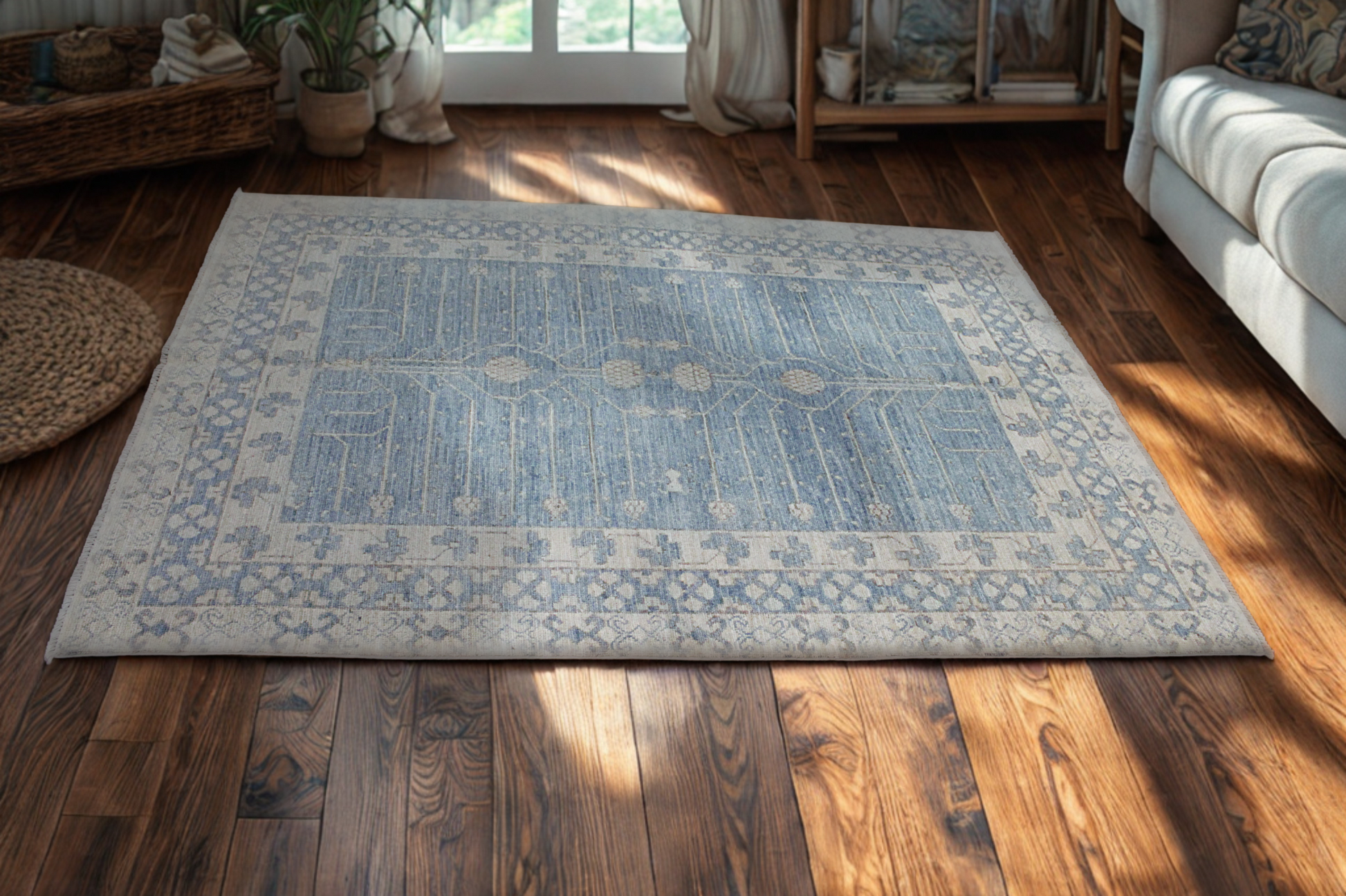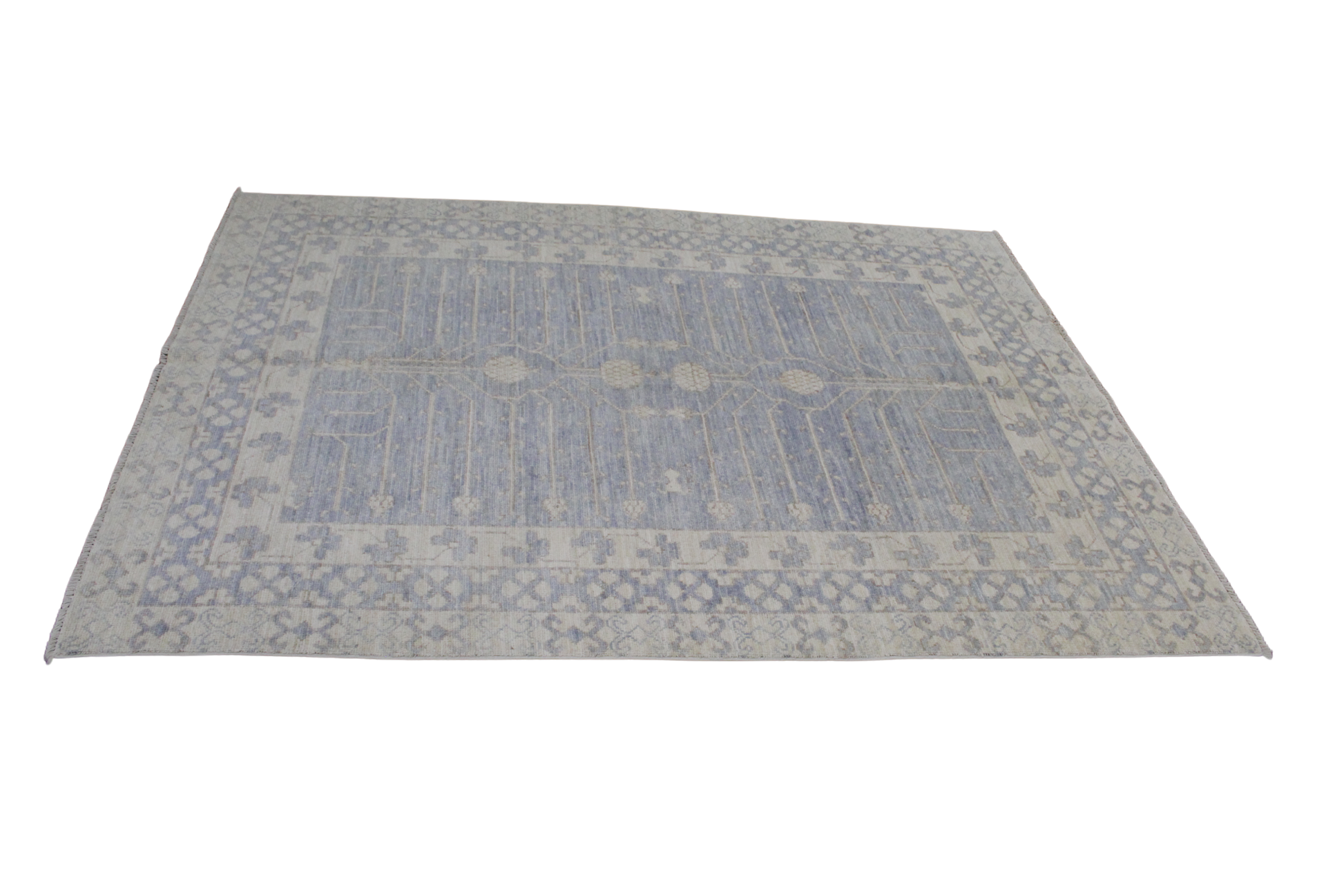 Rug 2061 is a 5 x 6.10 hand-knotted Khotan rug from Afghanistan, inspired by the ancient weaving traditions of the Silk Road. The rug’s cool slate blue field features a geometric medallion pattern that subtly references pomegranate and vine motifs, arranged in a linear, almost architectural formation. The wide border blends classic lattice and Greek key elements in soft ivory and muted blue-gray, completing the frame with quiet sophistication.