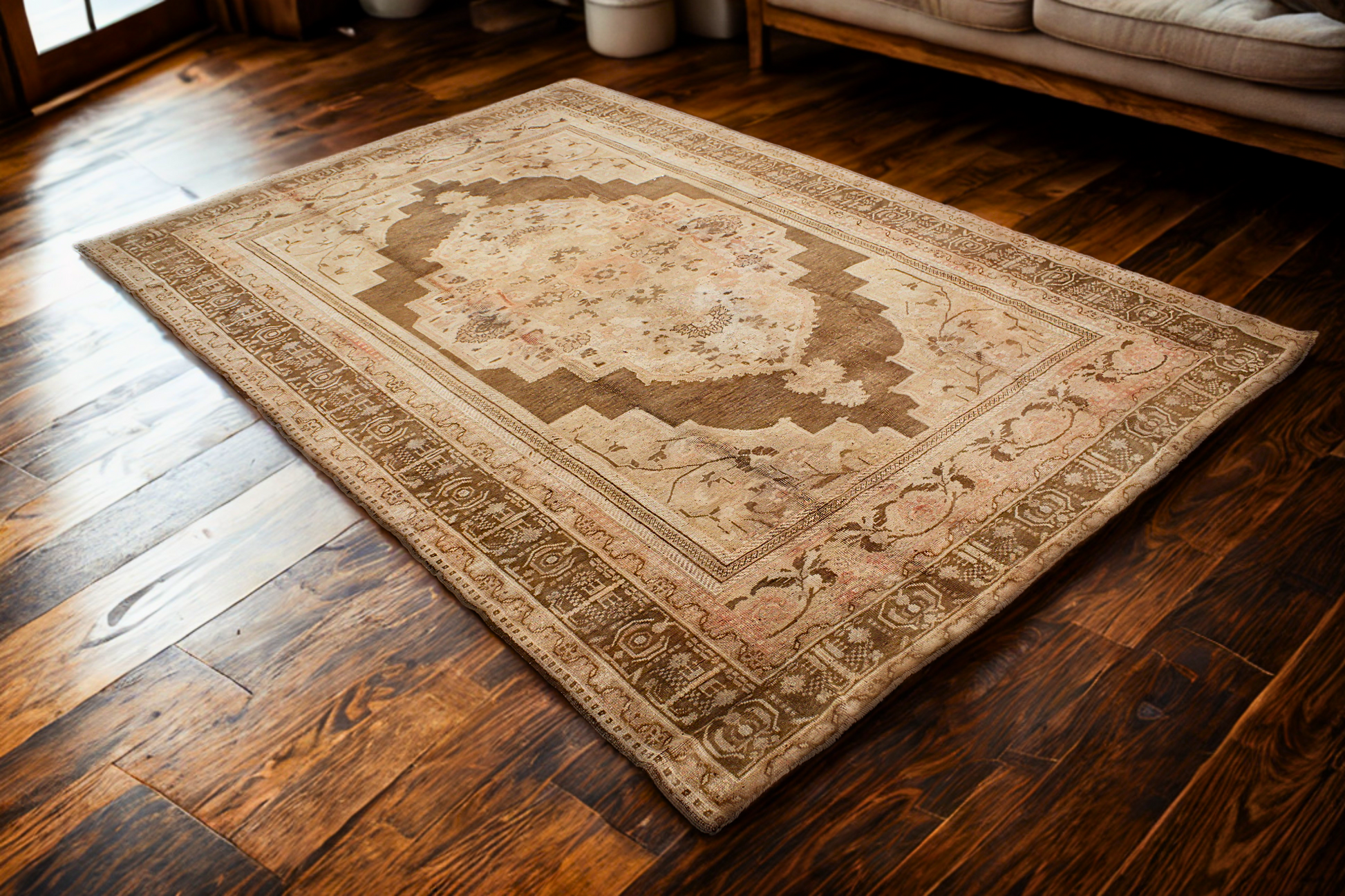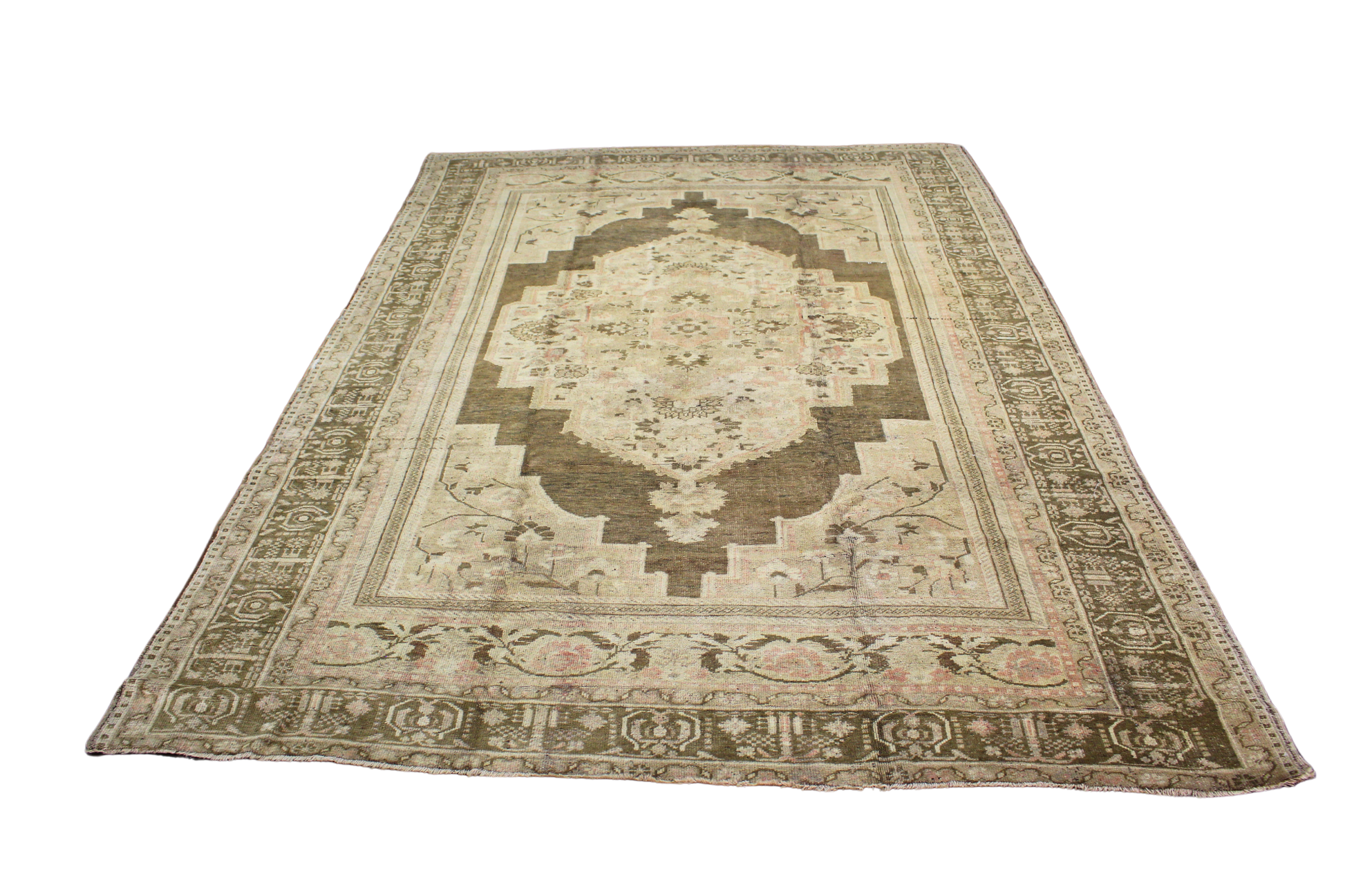 Its generously sized field and symmetrical balance make it ideal for anchoring a formal living room, under a dining table, or in a master bedroom. The subtle tonal contrasts and worn finish reflect the beloved aged look typical of handwoven Oushaks, lending character without overpowering a room.