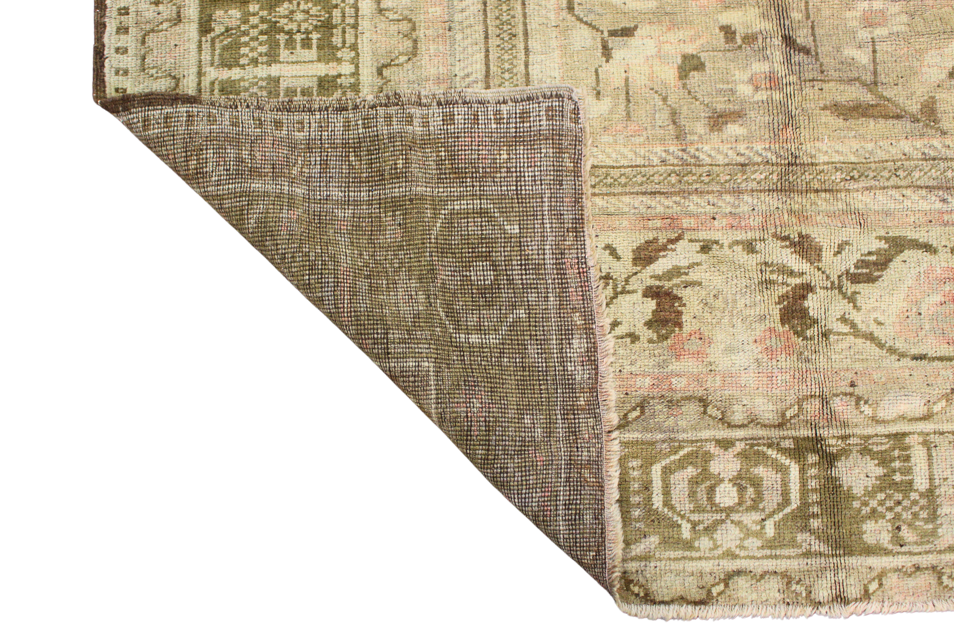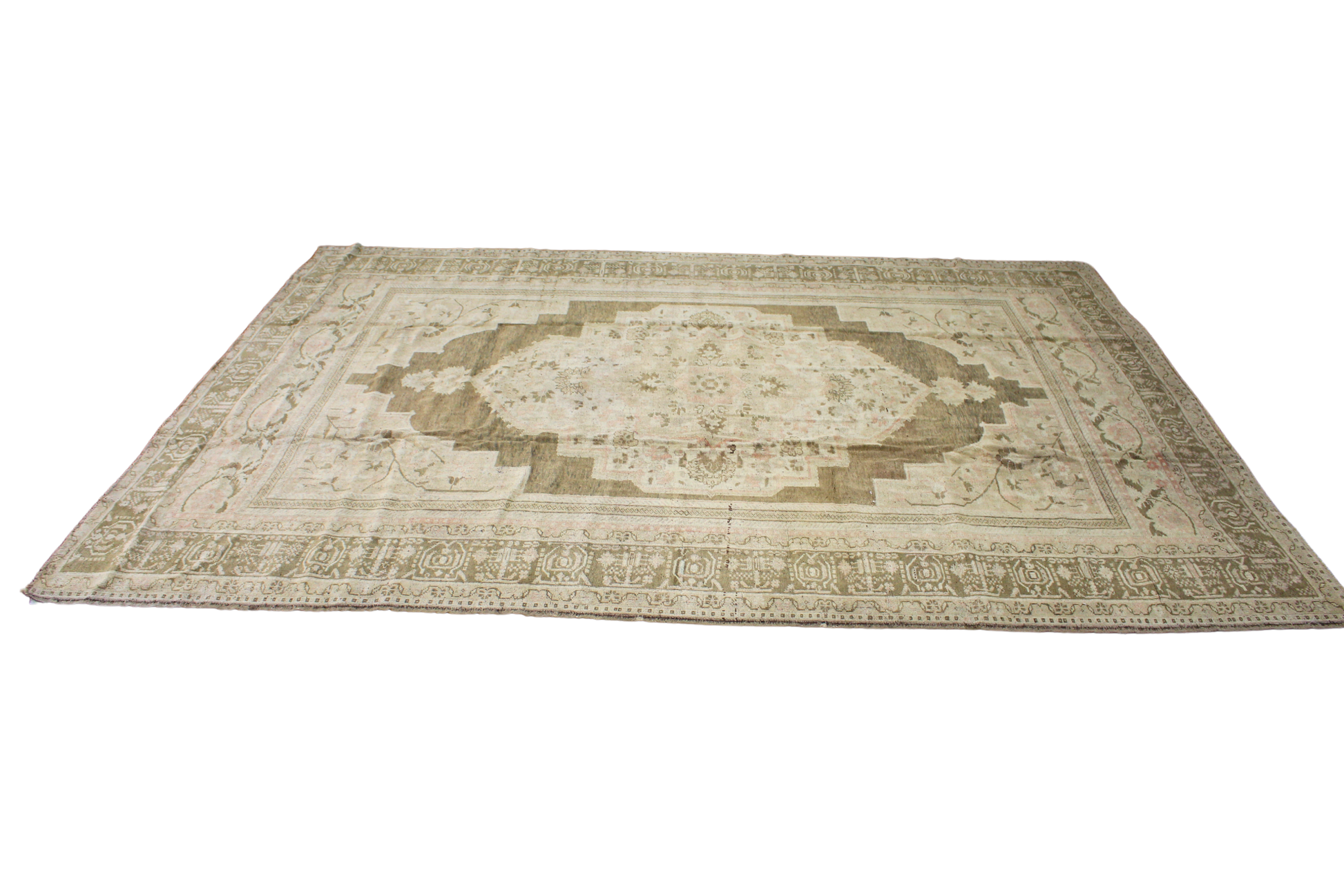 This Turkish Oushak rug features a commanding central medallion flanked by stylized floral elements and framed by a richly detailed border. Rendered in a subdued palette of olive, cream, and taupe, the rug’s soft patina and large-scale design bring both elegance and grounding presence to a space.