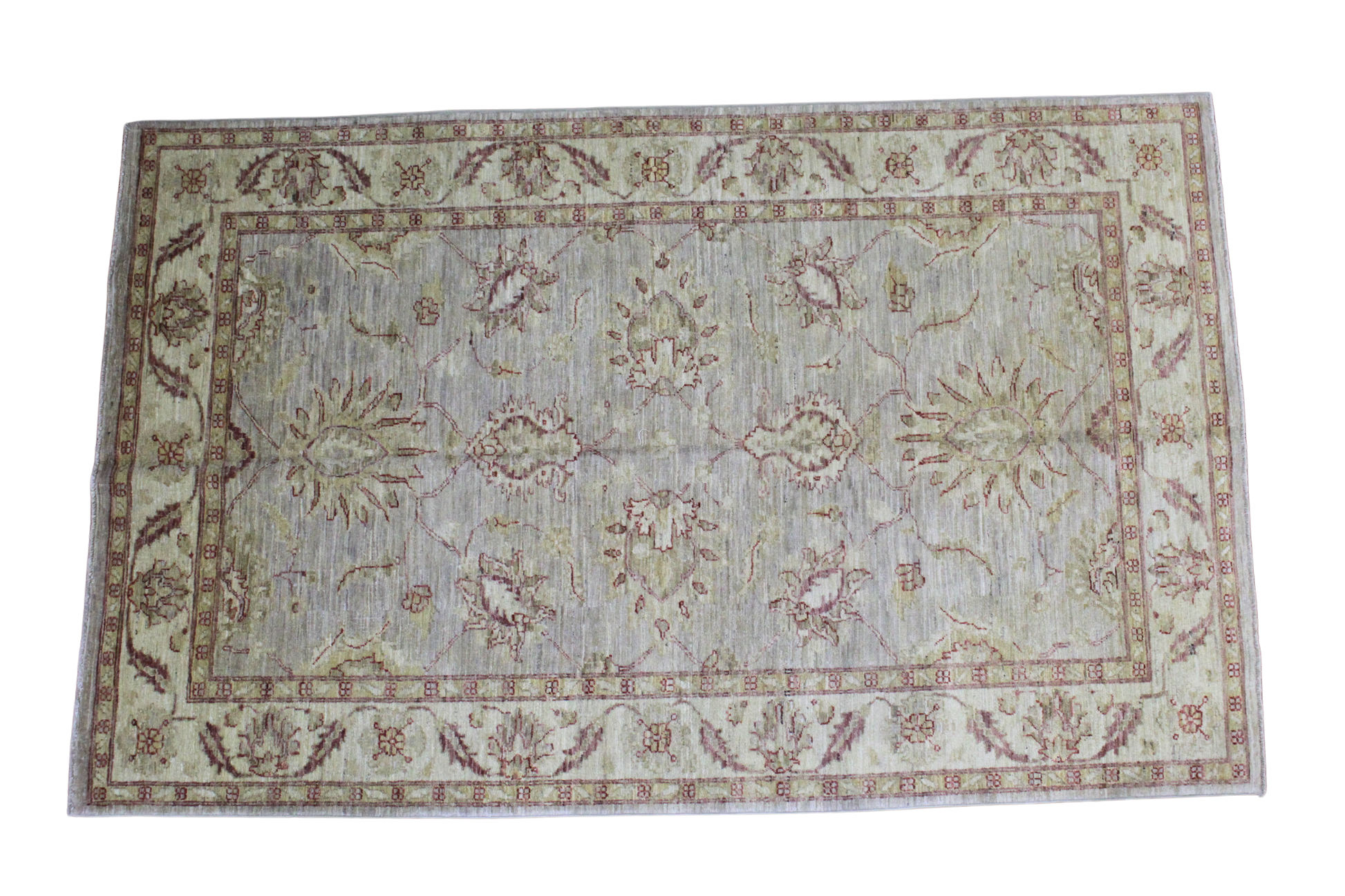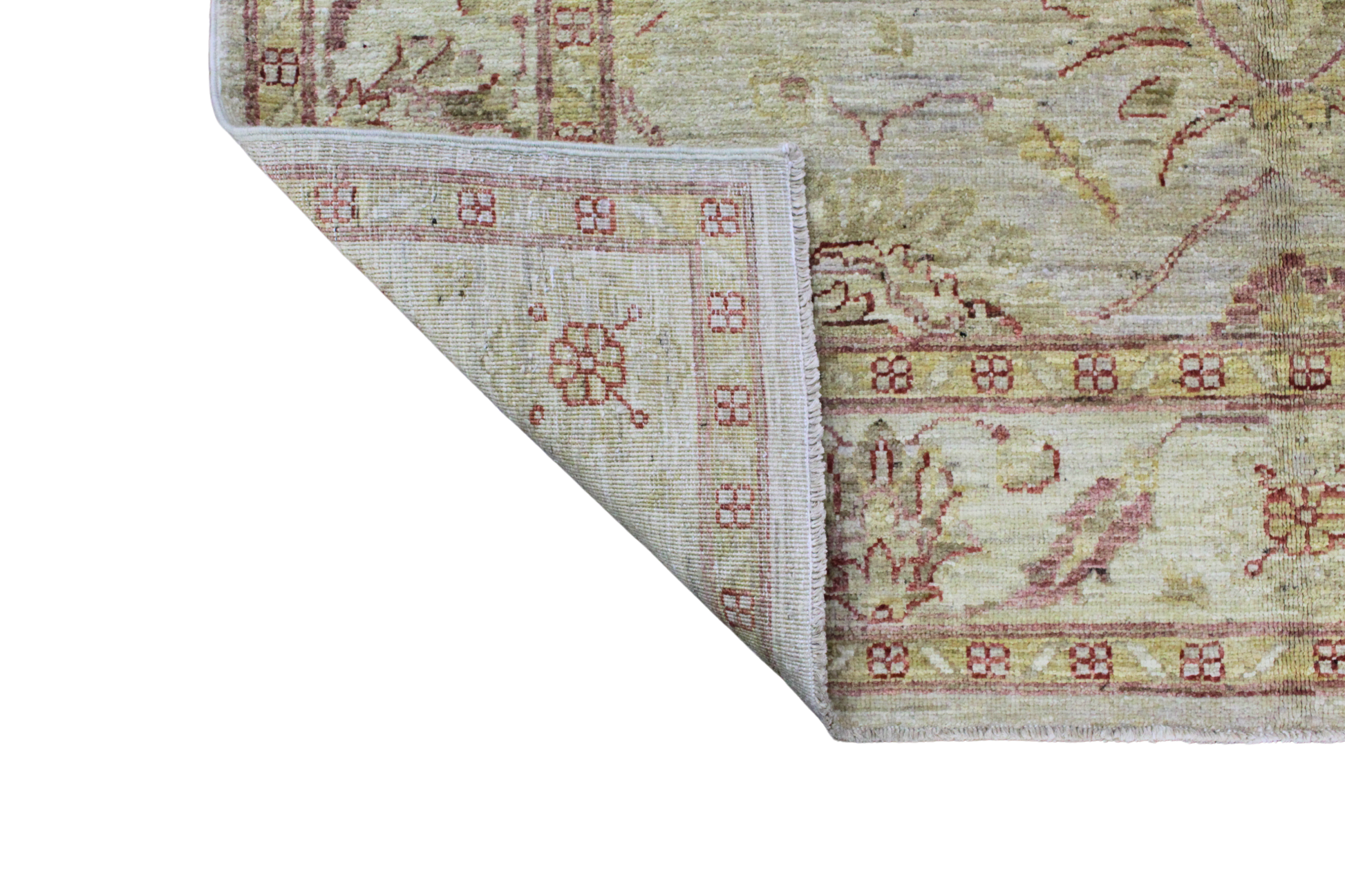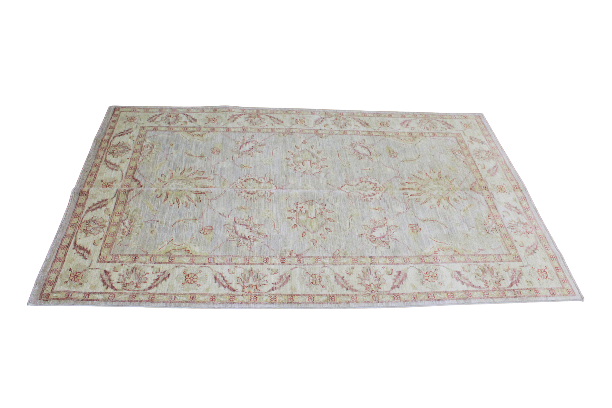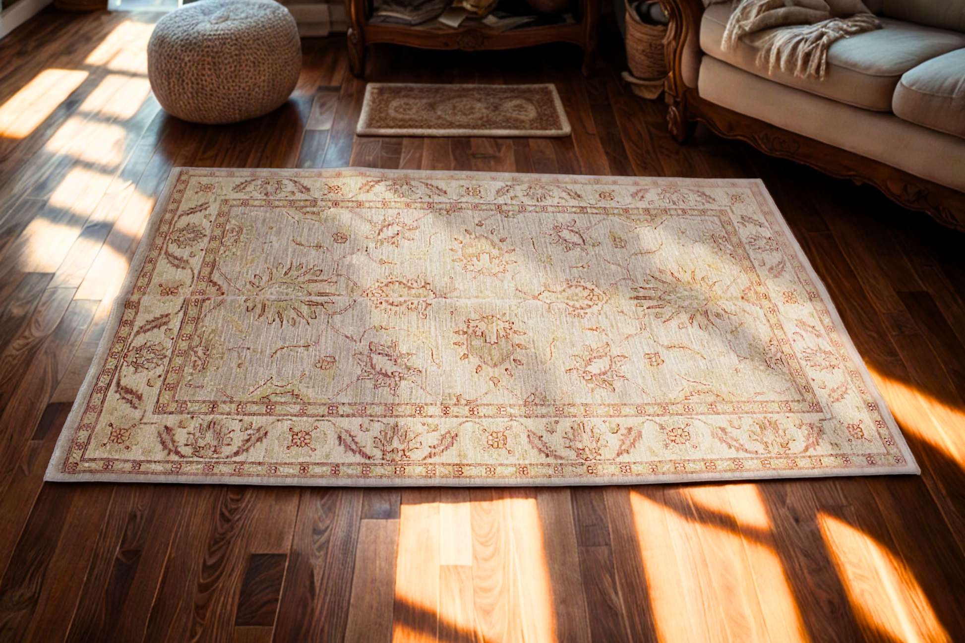 Rug 2088 is a 4.1 x 6.5 hand-knotted Oushak rug from Afghanistan, beautifully balanced in both design and tone. The sage green field is adorned with classical floral medallions and vine motifs in soft neutrals and warm russet outlines, creating a timeless aesthetic with a touch of rustic charm. The border, in a harmonious light beige, features repeating botanical elements that frame the rug with elegance.