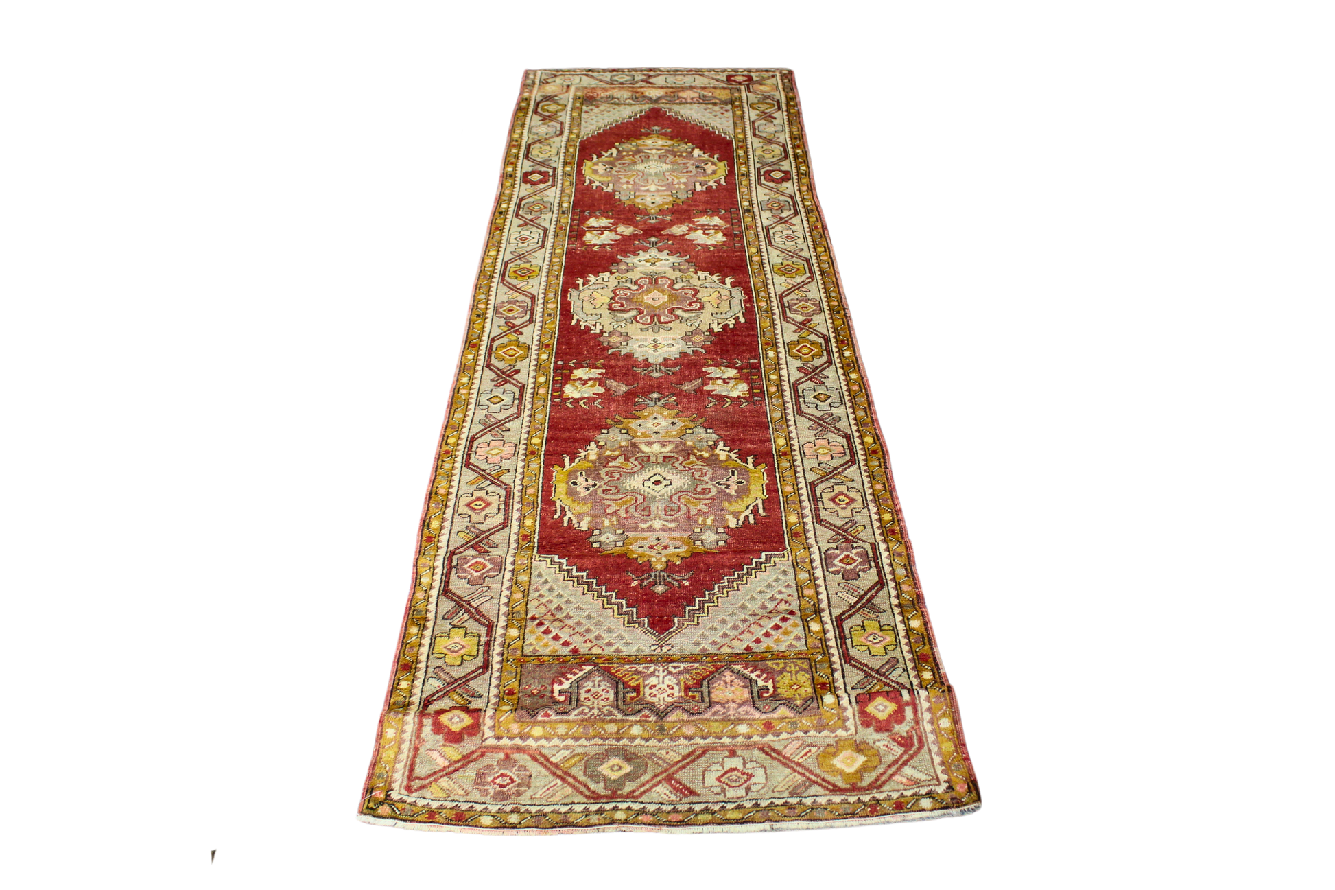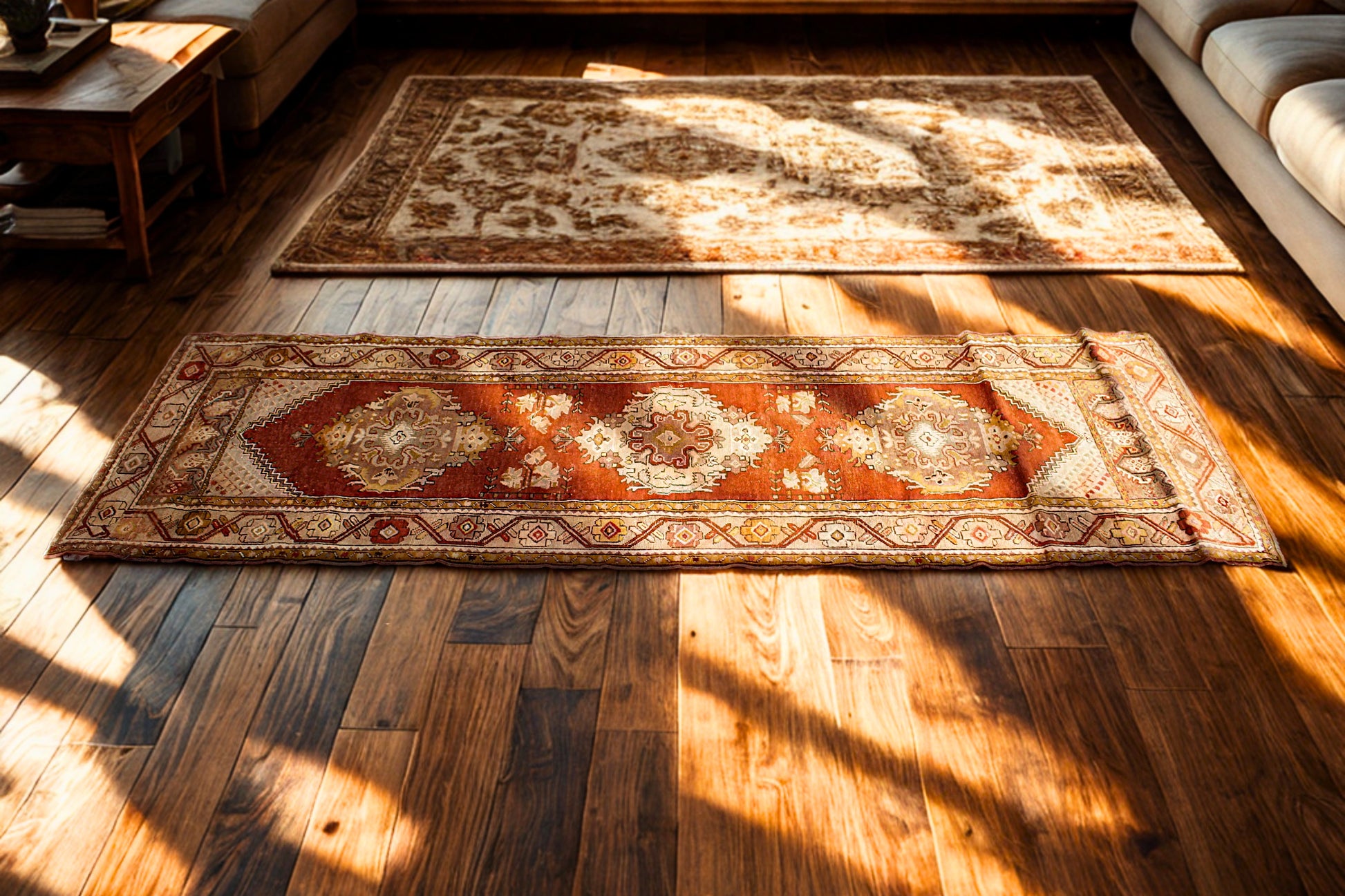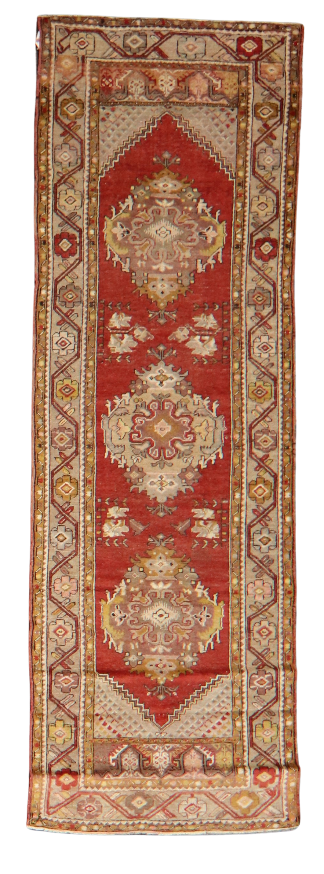 A radiant vintage character meets classical Anatolian charm in this antique Oushak runner from Turkey (2.8 × 8.3 ft). Set against a rich burnt sienna field, this piece features a vertical chain of ornate palmette medallions in muted hues of ivory, camel, taupe, and coral — softly aged to perfection.