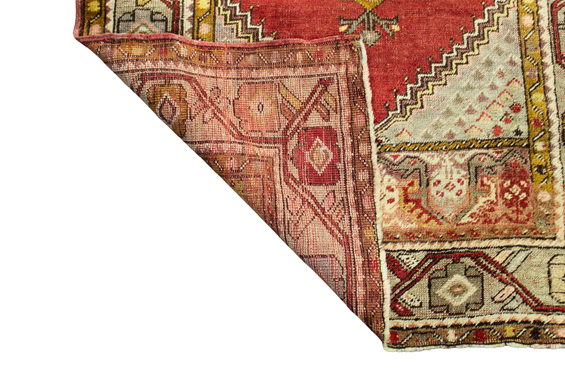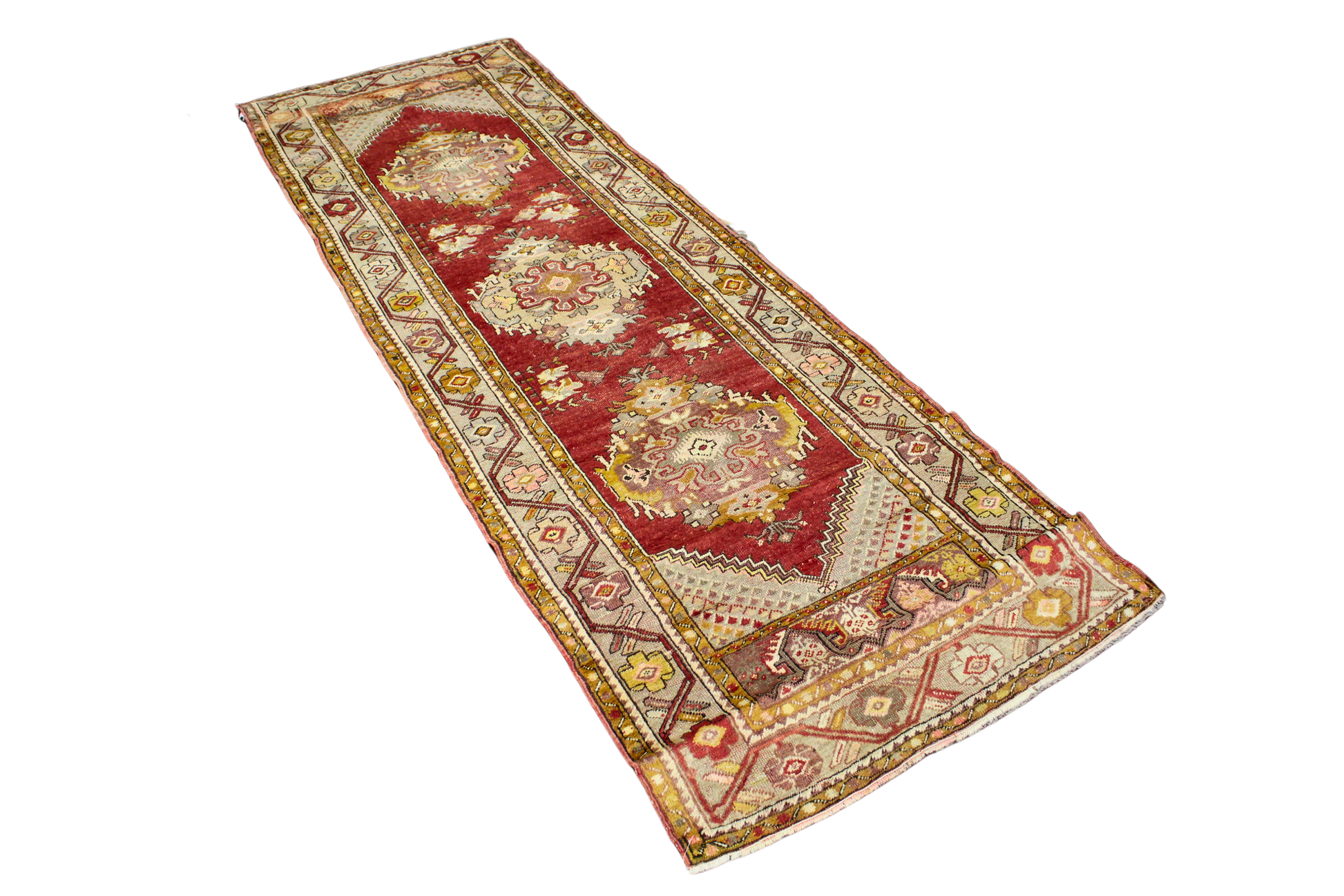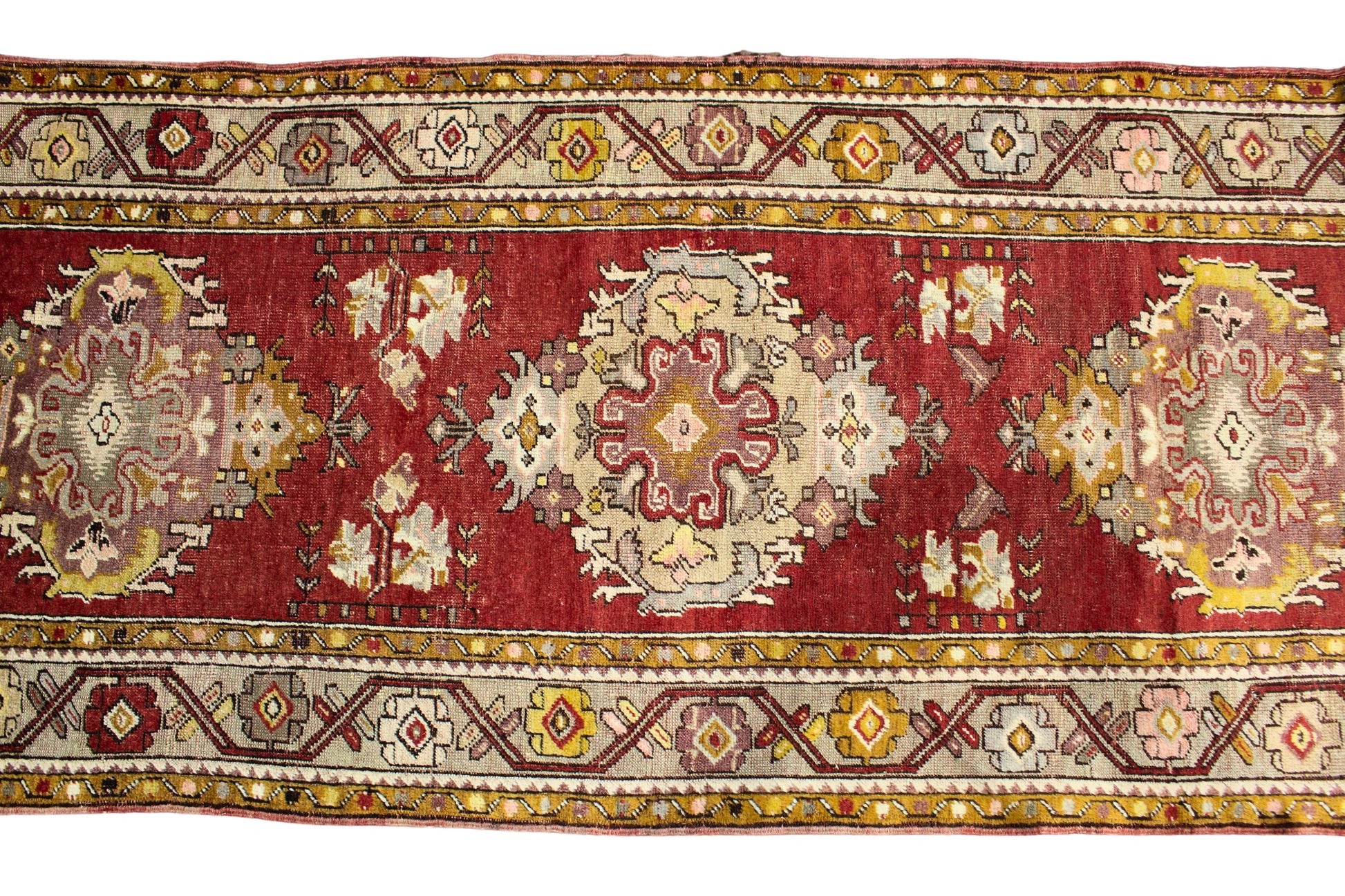 A radiant vintage character meets classical Anatolian charm in this antique Oushak runner from Turkey (2.8 × 8.3 ft). Set against a rich burnt sienna field, this piece features a vertical chain of ornate palmette medallions in muted hues of ivory, camel, taupe, and coral — softly aged to perfection.