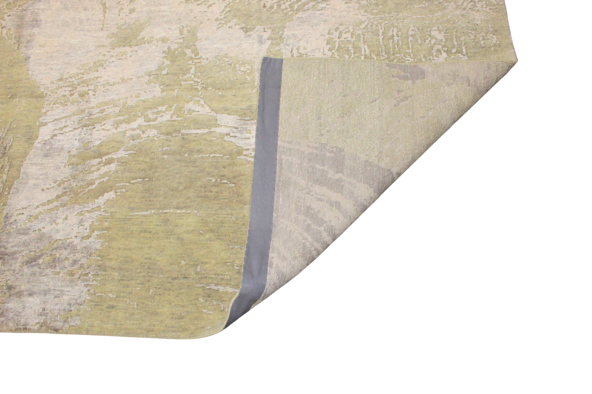 With its layered graphite sketch motif and neutral tones, this 9 × 12 ft hand-knotted Pakistani rug evokes the quiet energy of abstract expressionism. The central stacked rectangles feel like overlapping charcoal drawings, delivering a sense of movement and depth on a soft beige canvas.