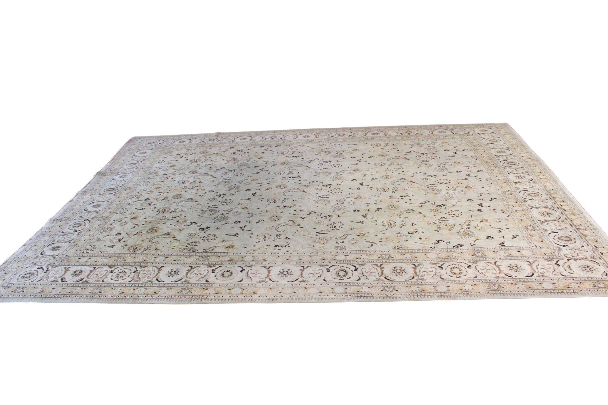 Graceful and ethereal, this antique hand-knotted Mashad rug from Persia (9′9″ × 13′5″) is a study in subtle elegance and classical symmetry. Woven in a washed ivory and misty beige palette with delicate outlines in charcoal, cocoa, and pale sand, its surface shimmers with refined botanical motifs — swirling vines, rosettes, lotus blossoms, and cloud-band arabesques that drift across the field with whisper-like fluidity.
