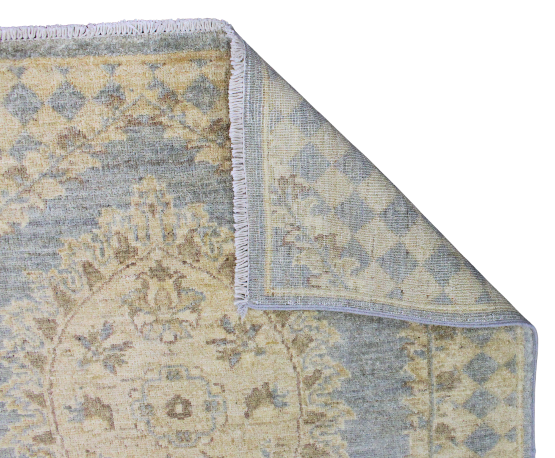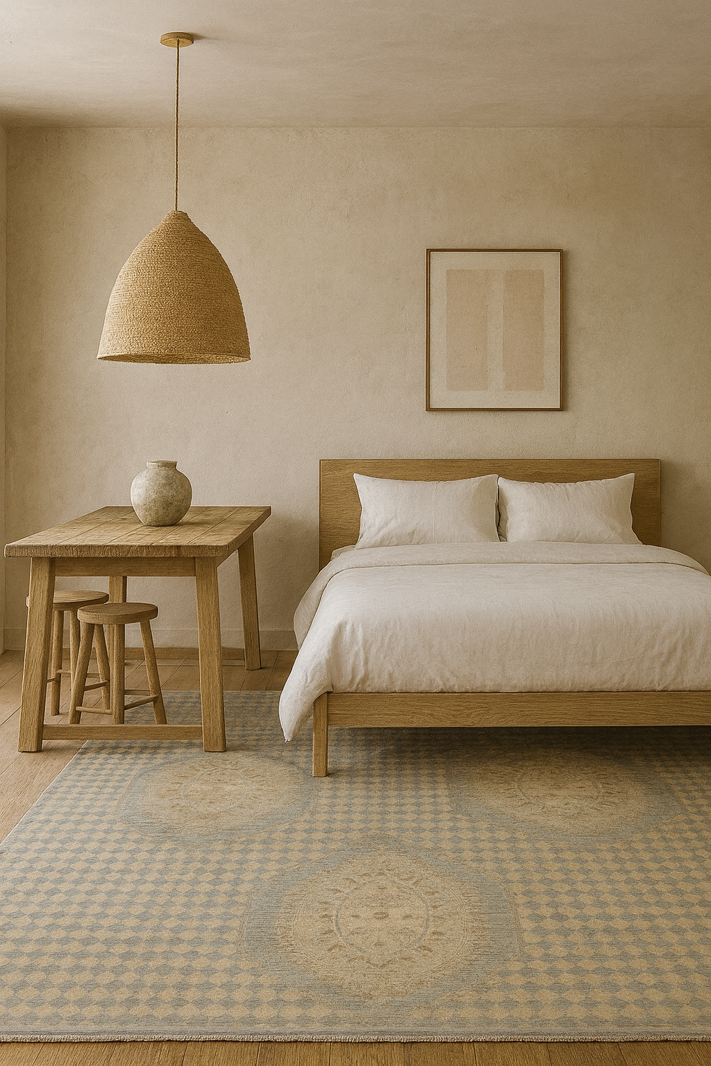 This modern interpretation of the Oushak tradition brings geometric rhythm and subtle elegance to any room. Sized at 5.11 × 8.10 ft, the rug is woven in a soft palette of pale stone, muted teal, and silvery beige. Its distinctive pattern alternates concentric medallions over a checkerboard background — a striking yet refined composition that blends classic motifs with a modern grid layout.
