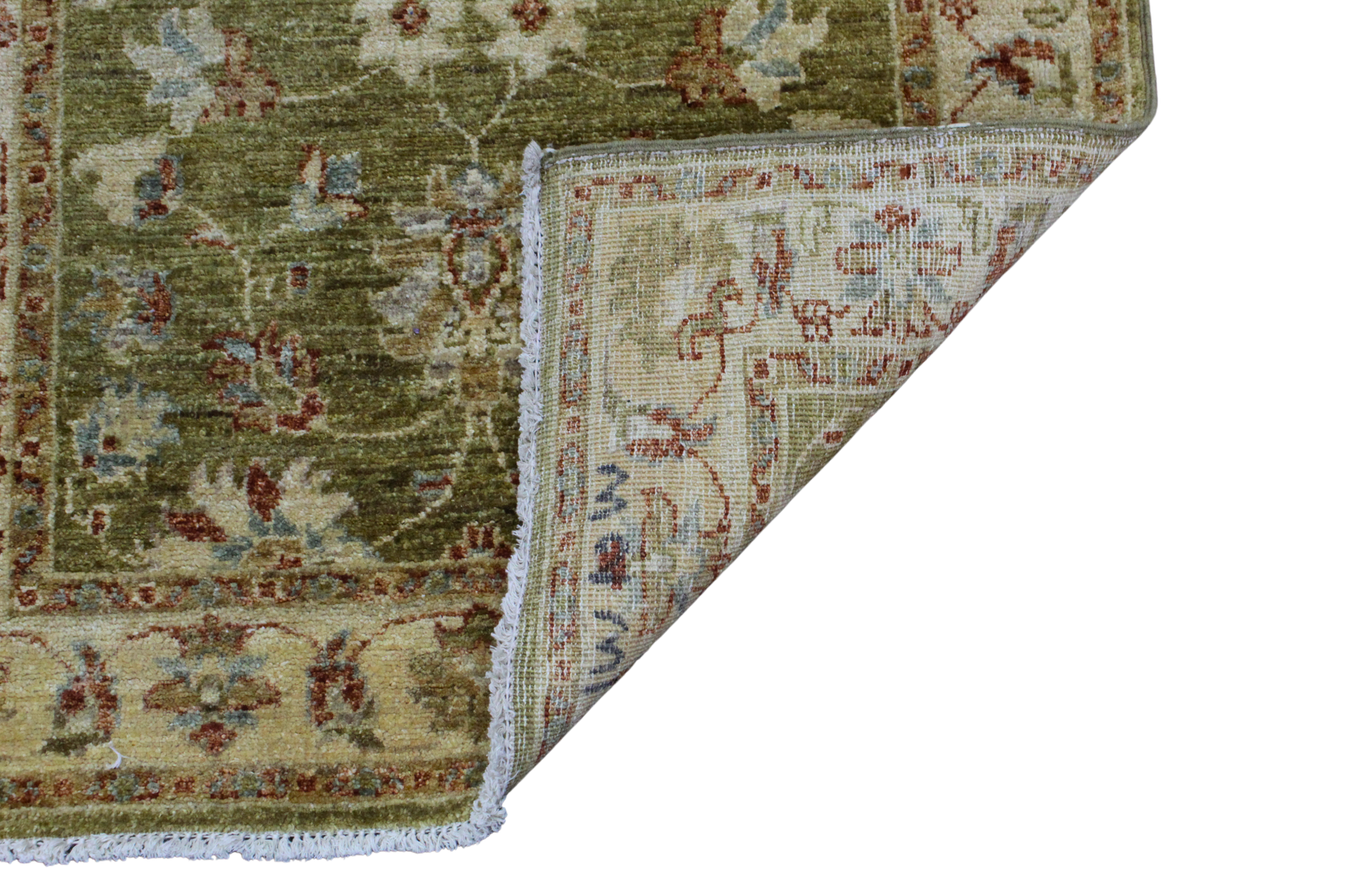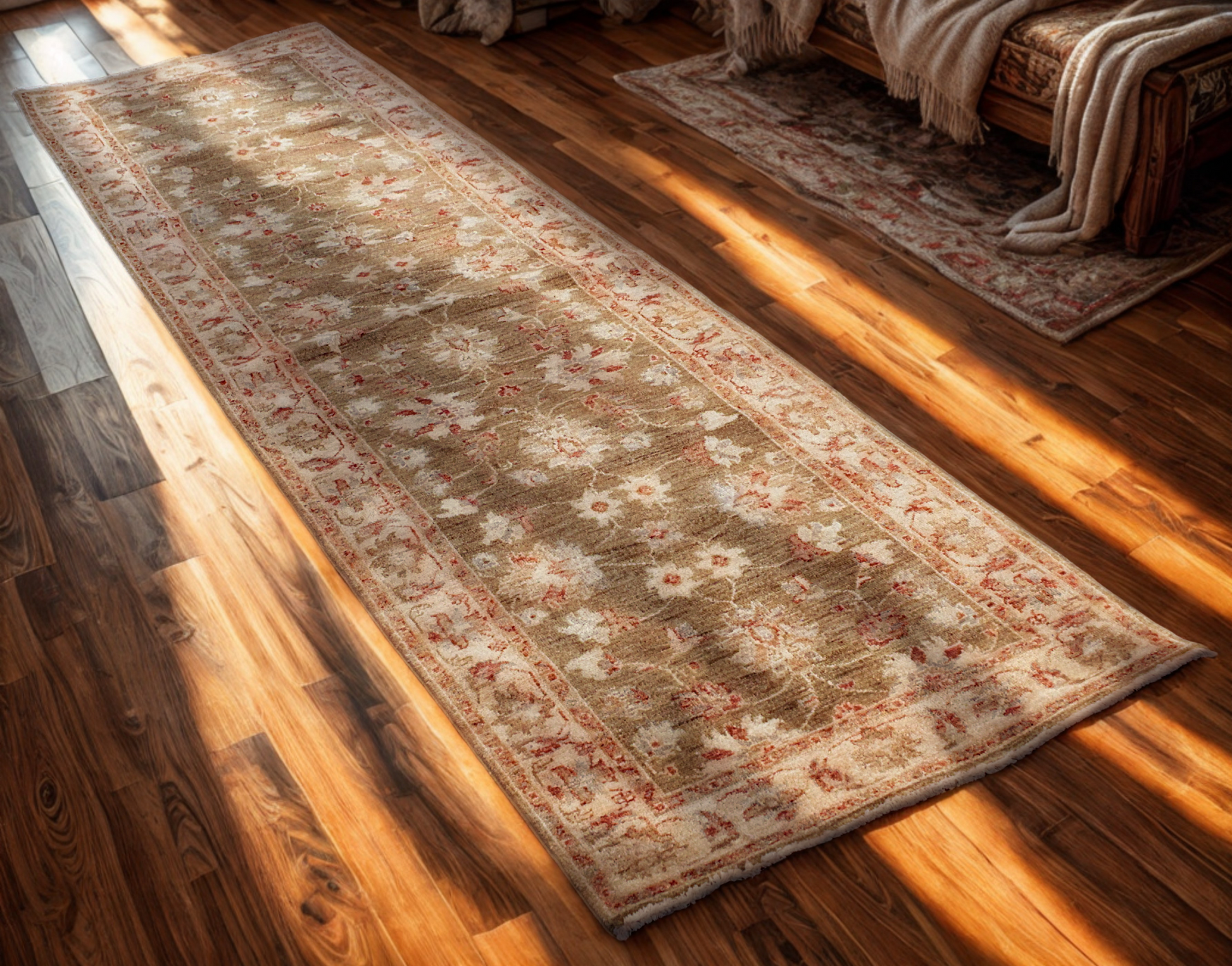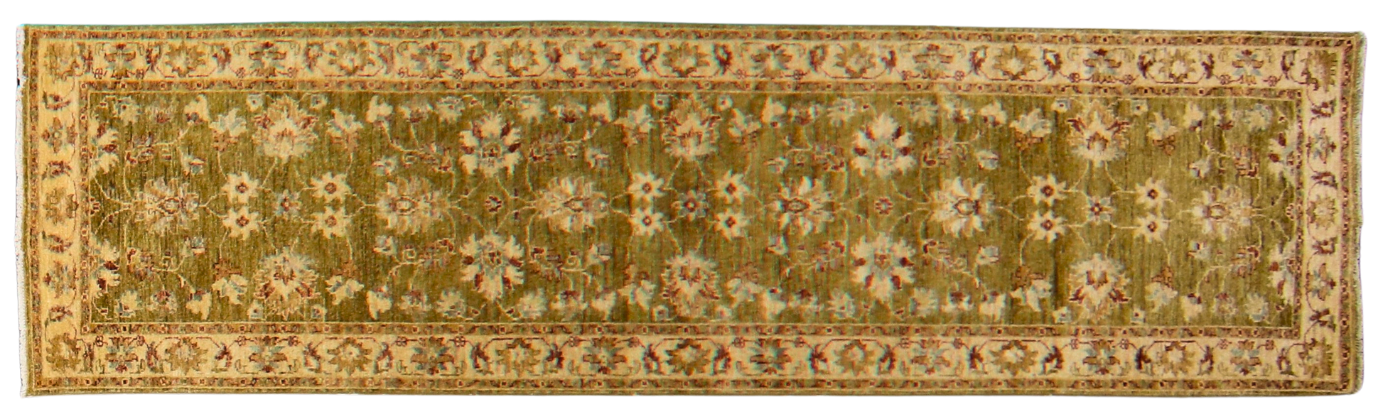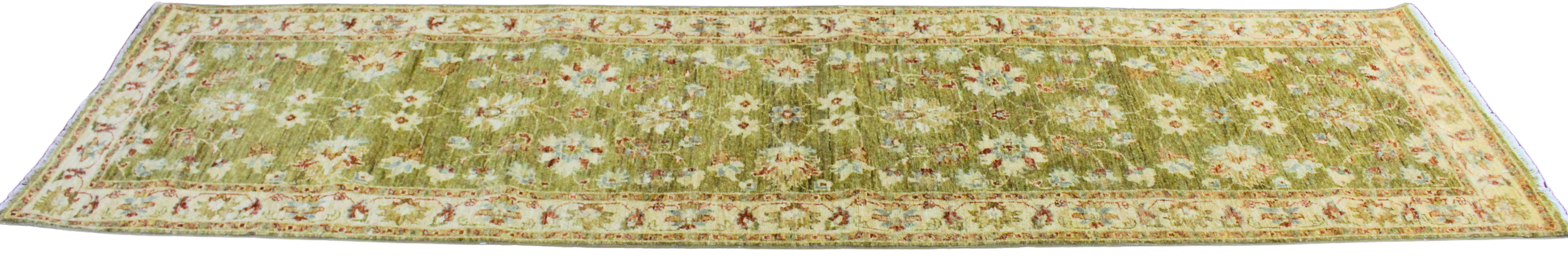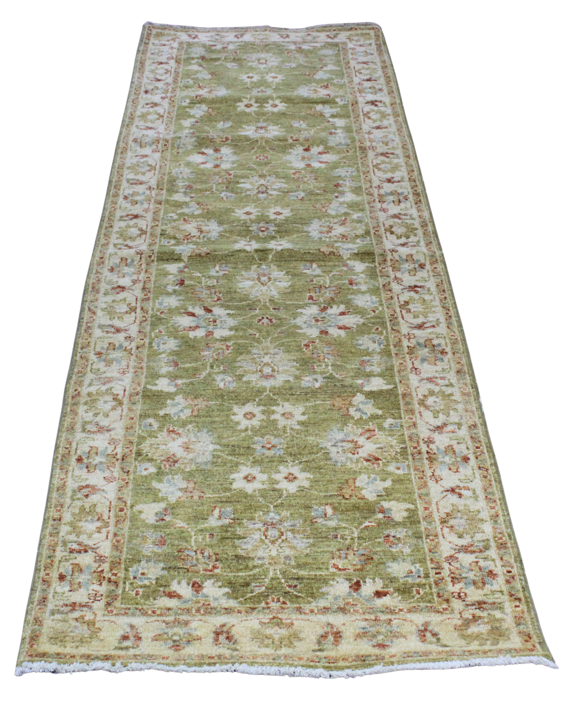 Radiating freshness and subtle elegance, this Pakistani Oushak runner features a lush olive green field adorned with delicate floral sprays in ivory, rust, and soft blue. The vines and rosettes seem to float gently across the surface, offering a sense of movement and calm. A soft ivory border, filled with detailed botanical motifs, perfectly frames the composition and adds a light contrast.
