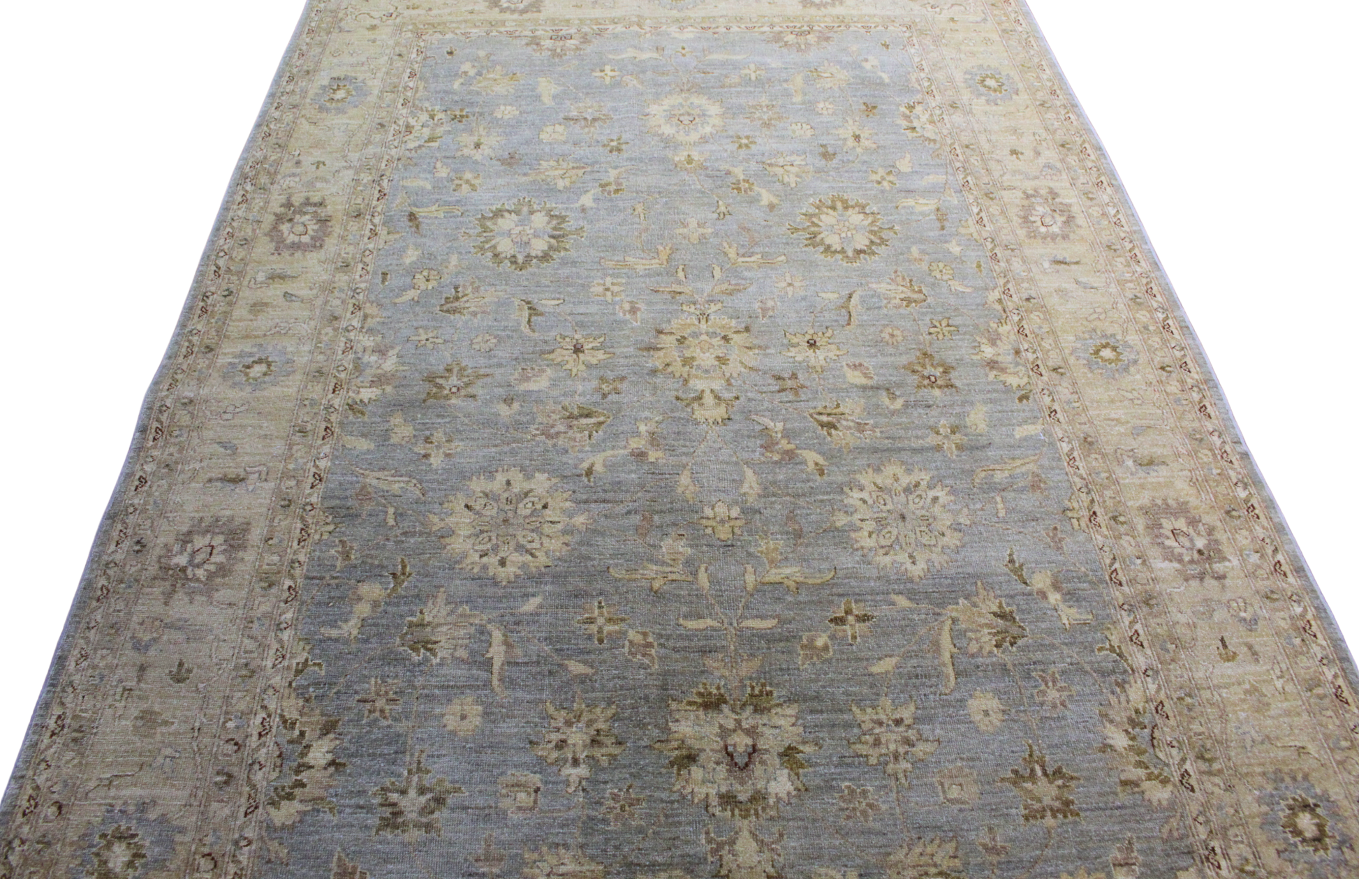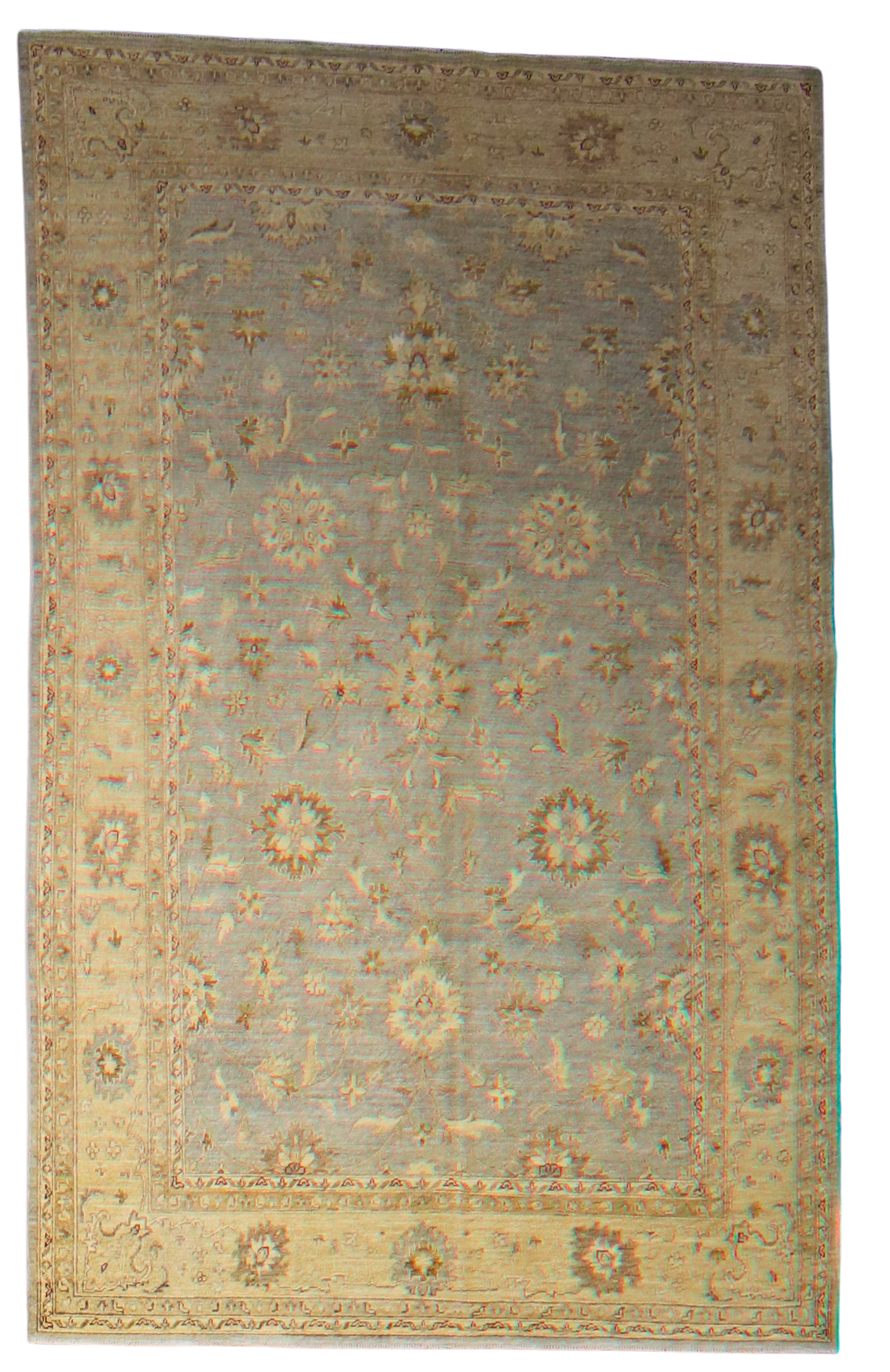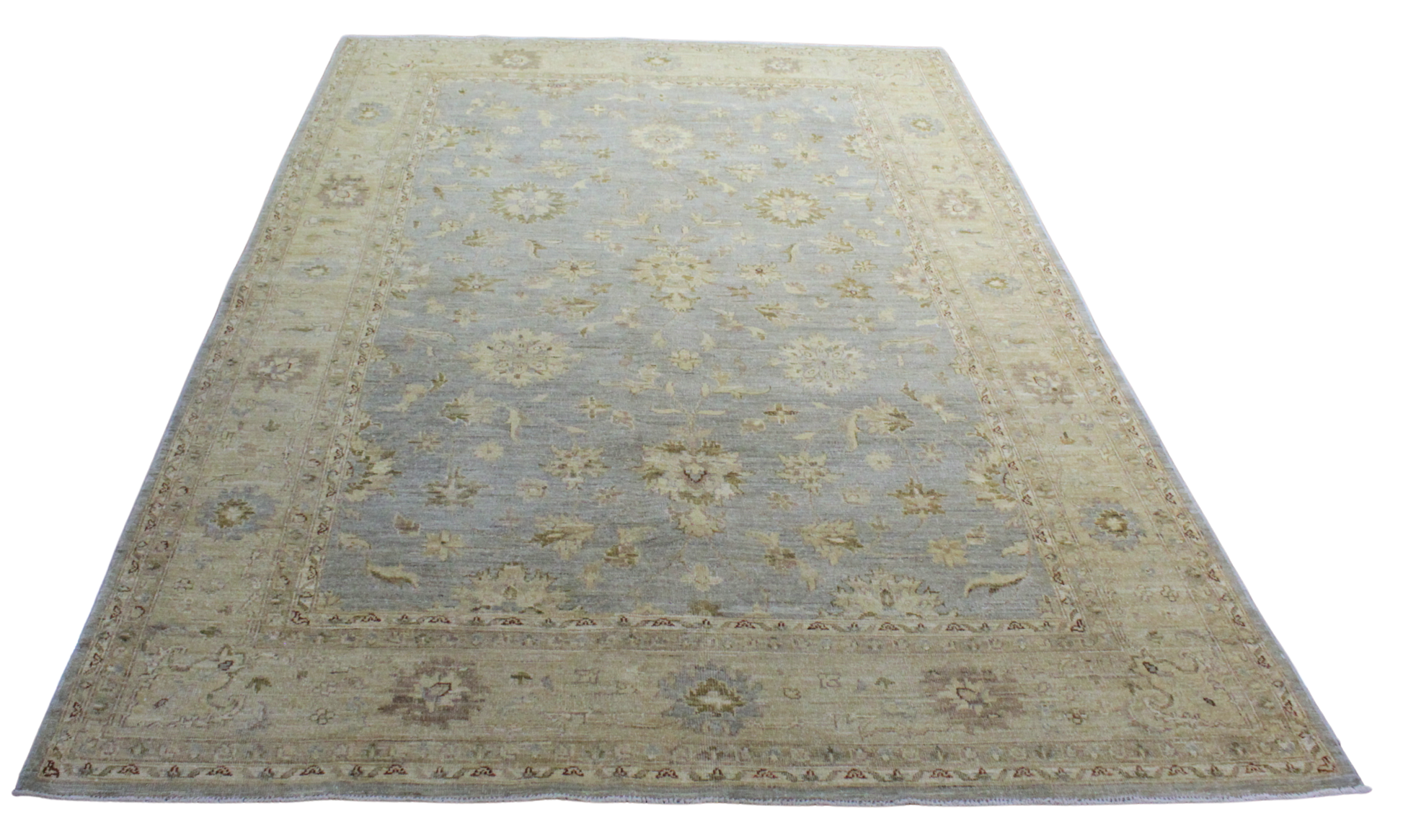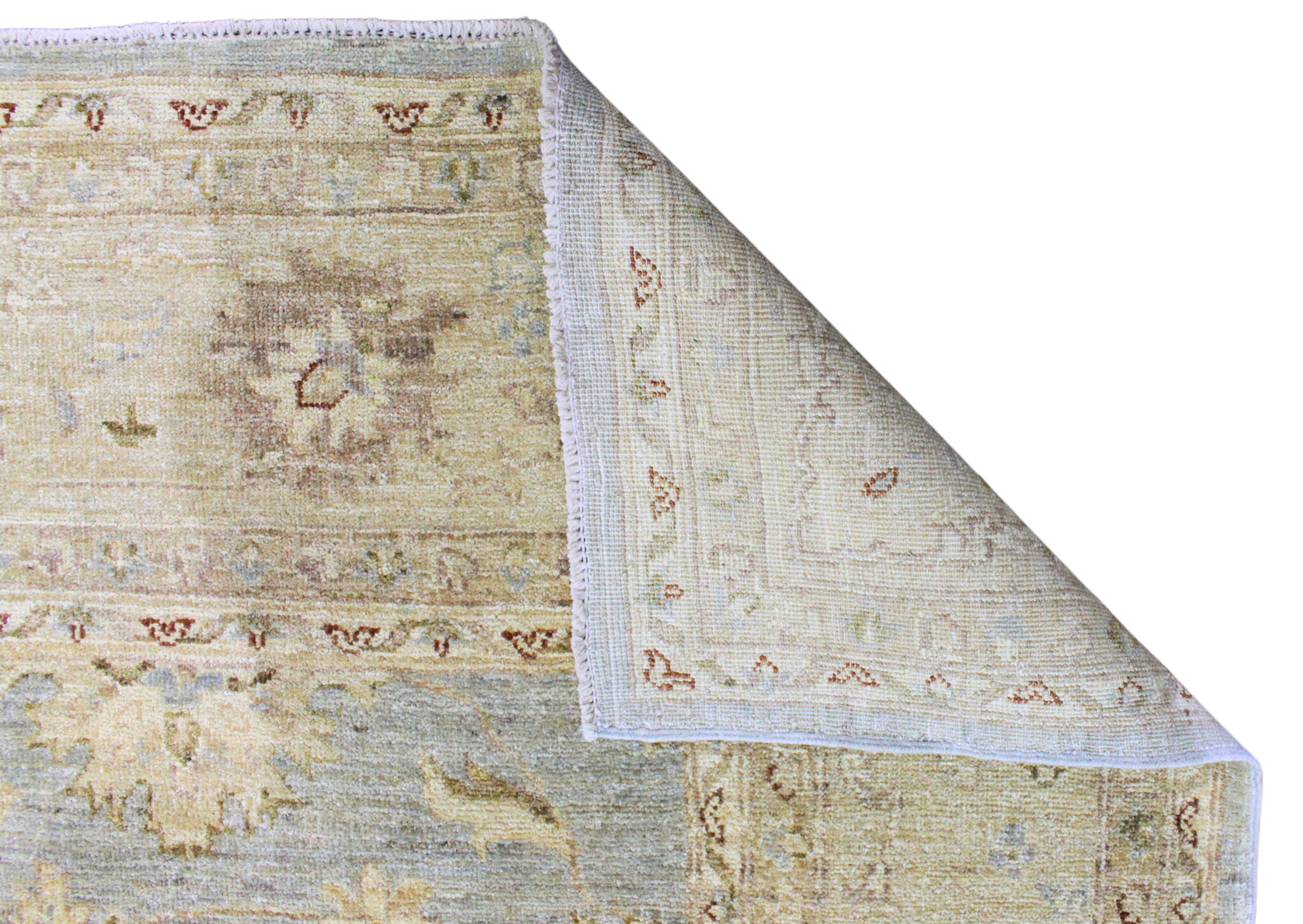 This beautifully subdued Oushak rug from Pakistan (measuring 5.10 × 9.4 ft) offers a delicate balance of tradition and softness, ideal for contemporary and transitional interiors alike. Its palette is a soothing blend of powdery blue, ivory, and muted sand tones — all executed with gentle abrash that gives it an aged, organic quality.